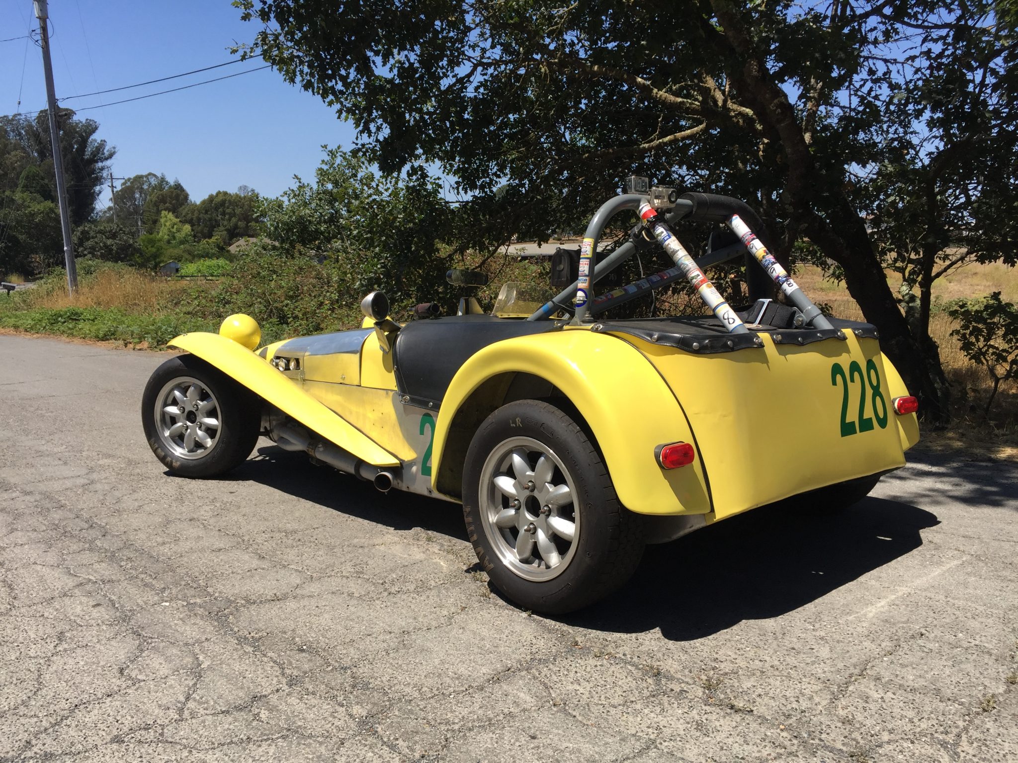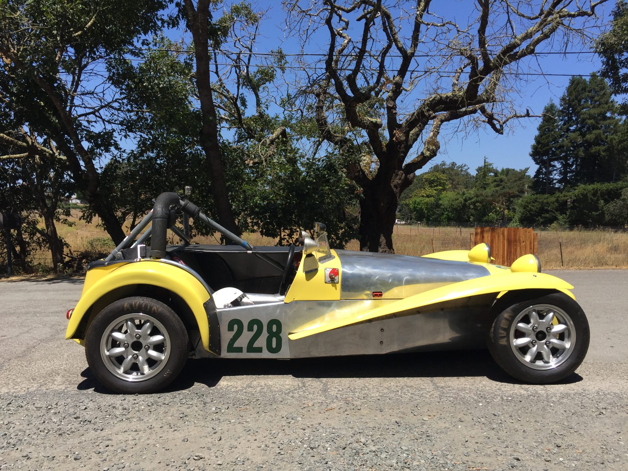 Silver Minilite-style wheels wear Avon racing tires. Modifications include a DSK adjustable front suspension, a Ford Cortina rear suspension, front disc brakes, TR-10 rear drums, an adjustable rear sway bar, and a spherical rear A-frame pivot bearing. Spare wheels and tires are included in the sale.