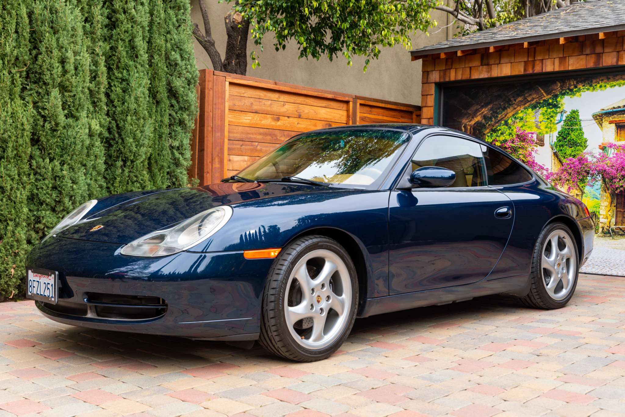 The factory 18″ Turbo-twist alloy wheels wear colored Porsche crest center caps and Bridgestone Potenza tires measuring 225/40 on the front and 265/35 at the rear. The seller reports that the front brake pads and sensors were replaced in 2019.