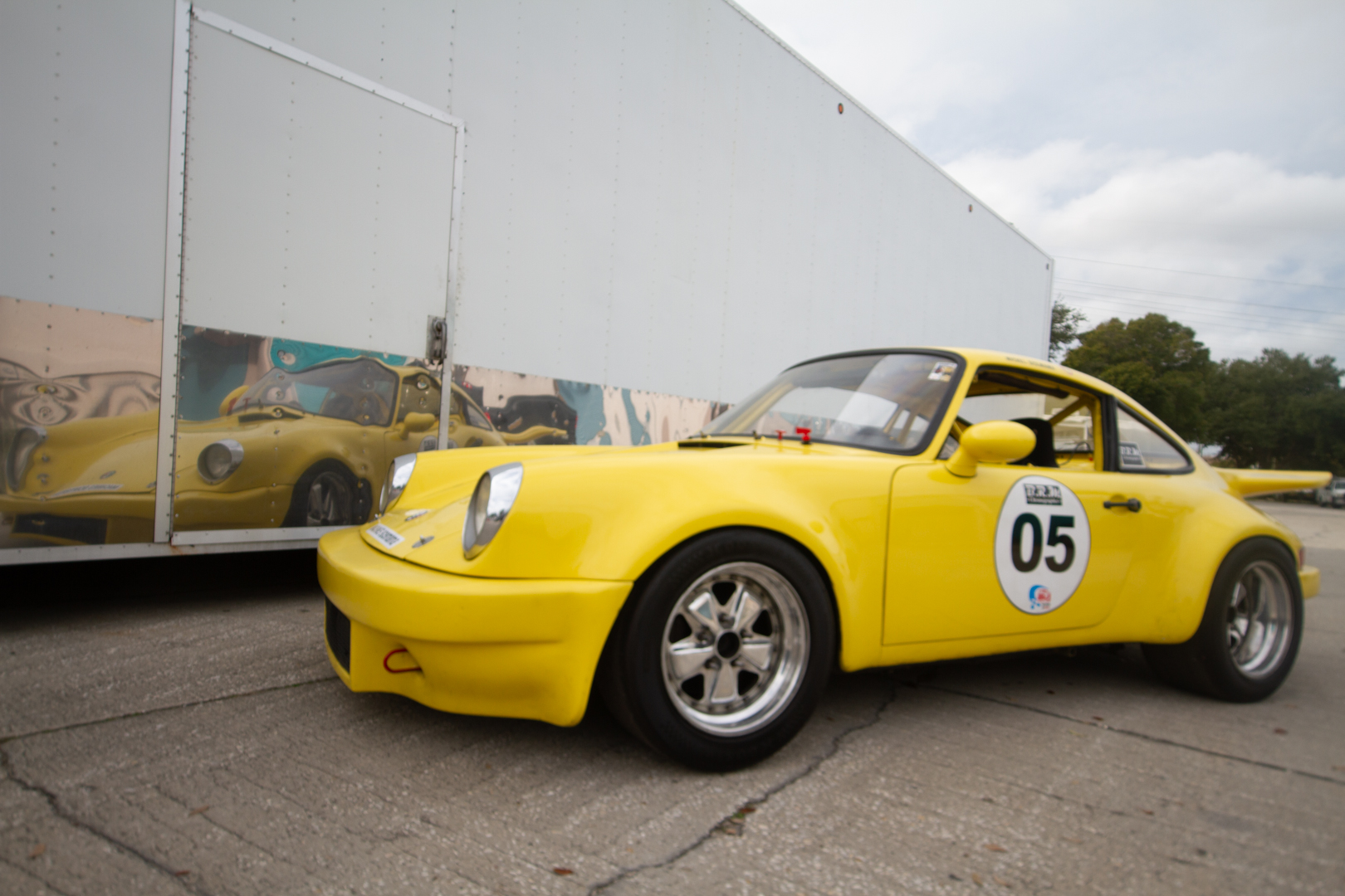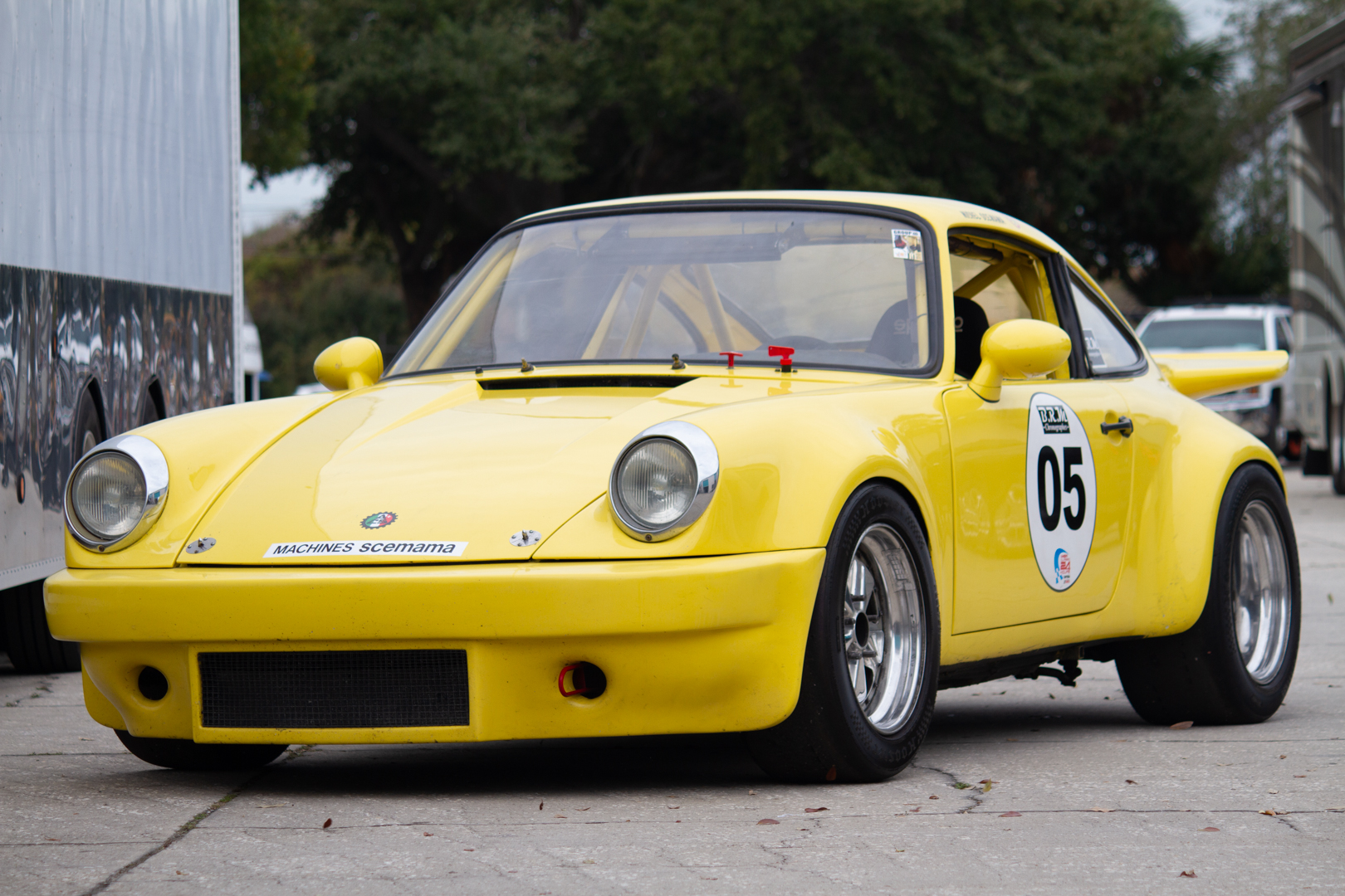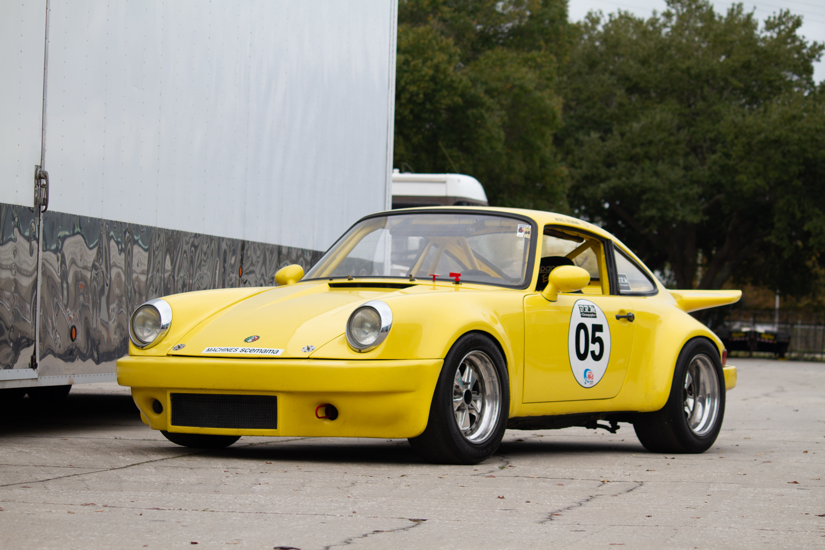 Two-piece 16″ Fuchs-style wheels wear 225/50 and 275/45 Hoosier tires. The car has been fitted with 930-style front hubs as well as 930-style rear control arms with inboard adjustable camber boxes and Bilstein coilovers at all four corners. 930 brakes feature finned-aluminum calipers and cross-drilled rotors.