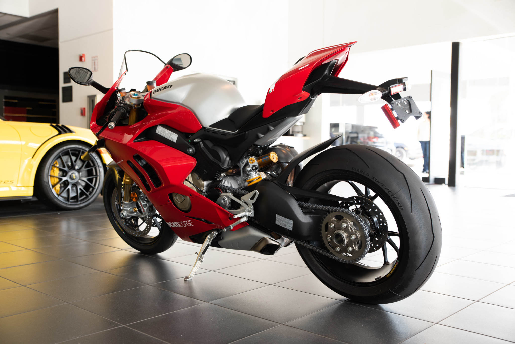 Suspension is by Öhlins and includes a TiN-treated 43mm front fork and a single-sided rear swingarm with an Öhlins TTX36 coilover assembly and adjustable pivot. The suspension changes reportedly saved 1.5 pounds when compared to the V4 S. Forged Marchesini wheels measure 17×3.50″ at the front and 17×6.00″ at the rear and are fitted with Pirelli Diablo Supercorsa tires. Braking is handled by dual 4-piston Brembo calipers at the front, with a single 2-piston caliper out back.