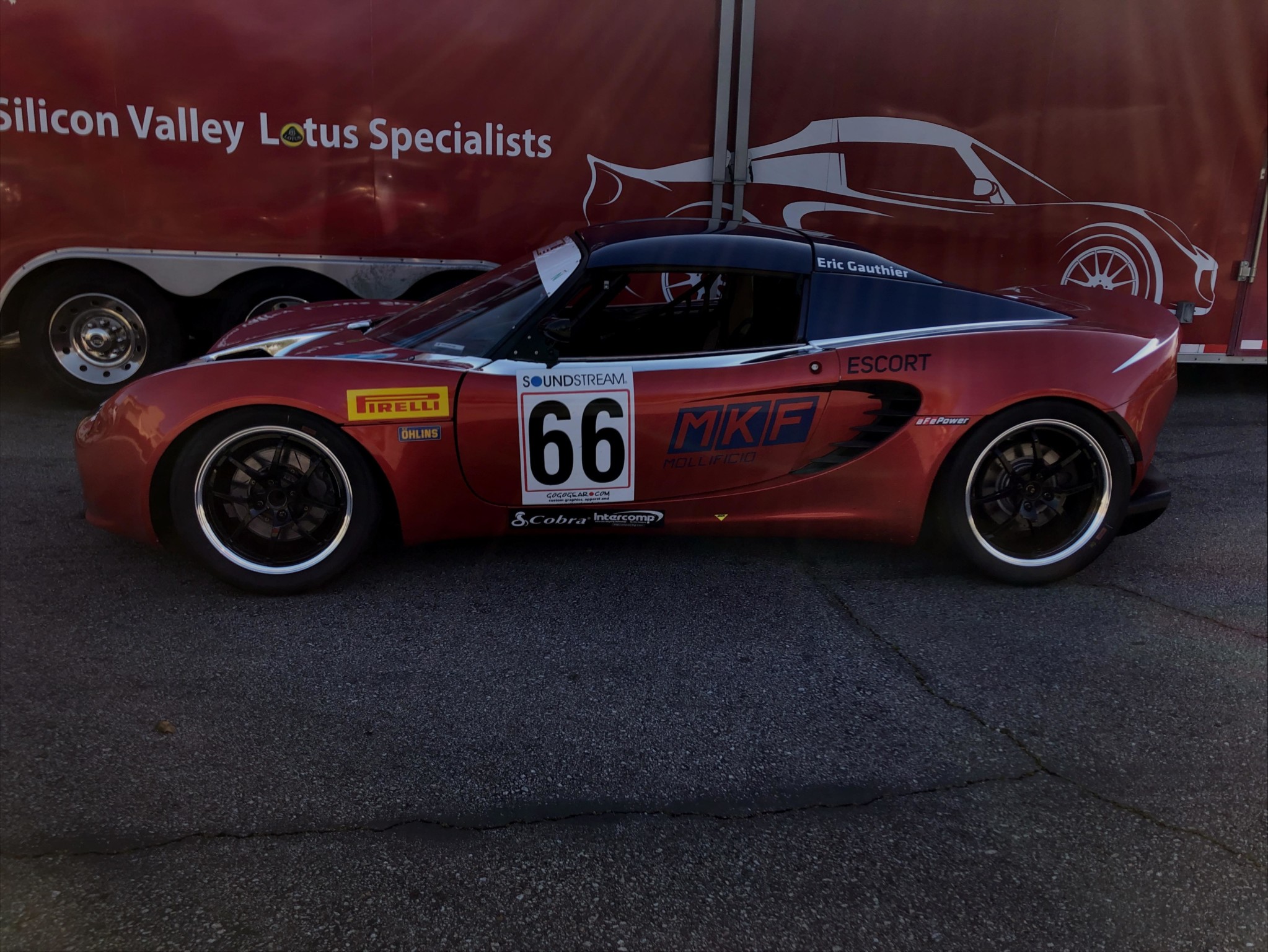 Black 16″ wheels are fitted with Pirelli slicks all around, and a separate set of wheels with rain tires is also included in the sale. Braking components include Girodisc front rotors, while suspension features three-way-adjustable Öhlins dampers as well as modified rear lower A-arms with integrated toe links.