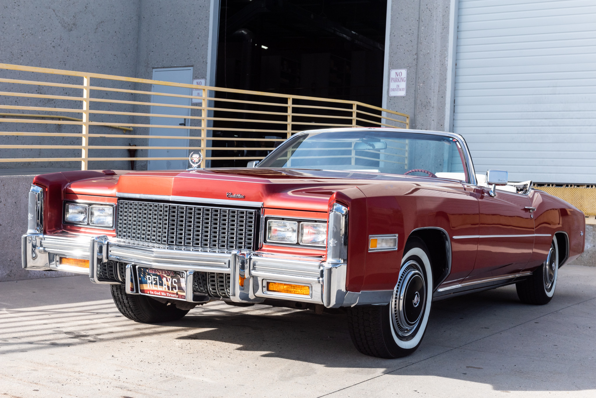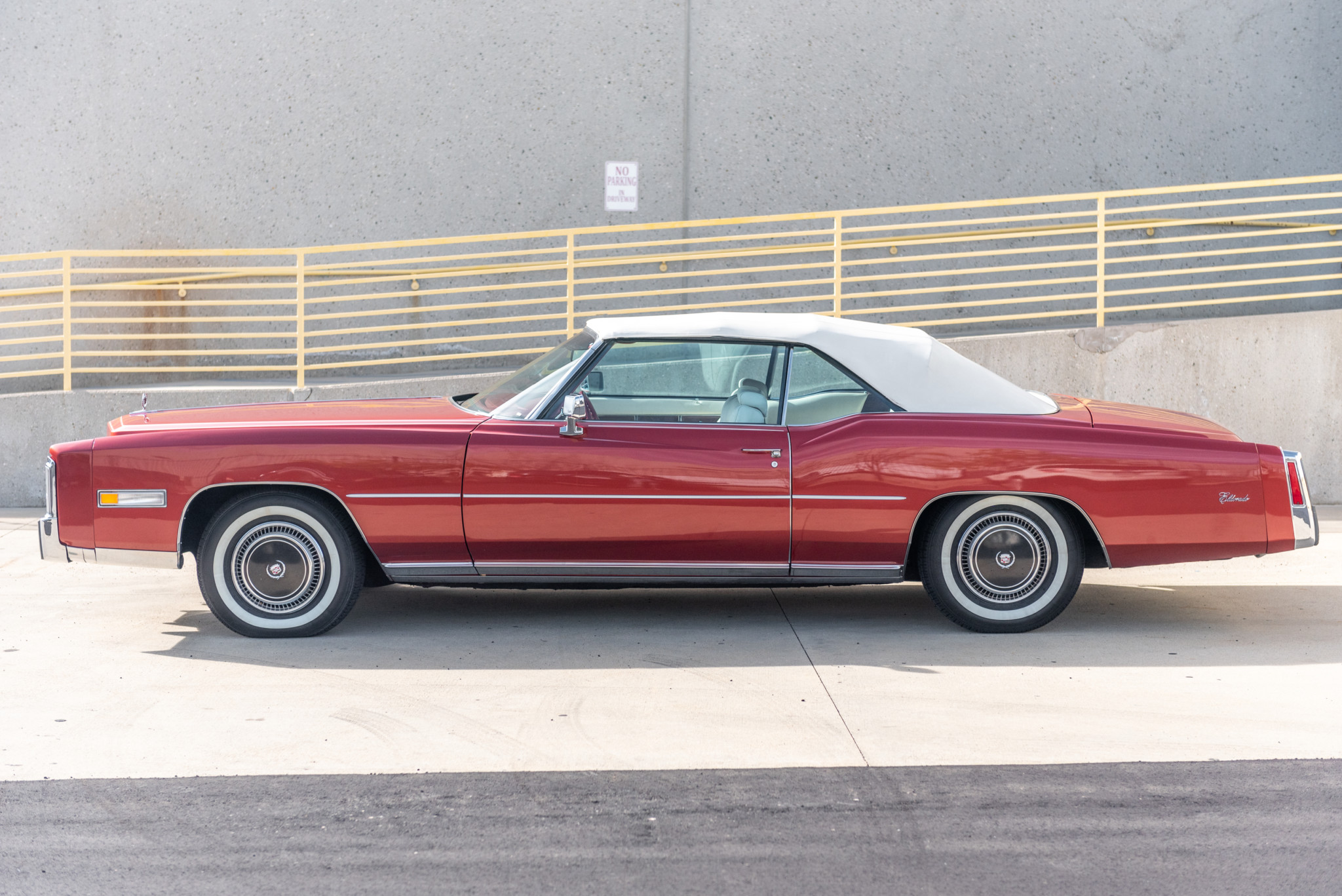 15″ steel wheels wear Cadillac hubcaps and 235/75 American Classic whitewall tires that show 2013 date codes. 1976 was the first year that four-wheel disc brakes came standard on the Eldorado.