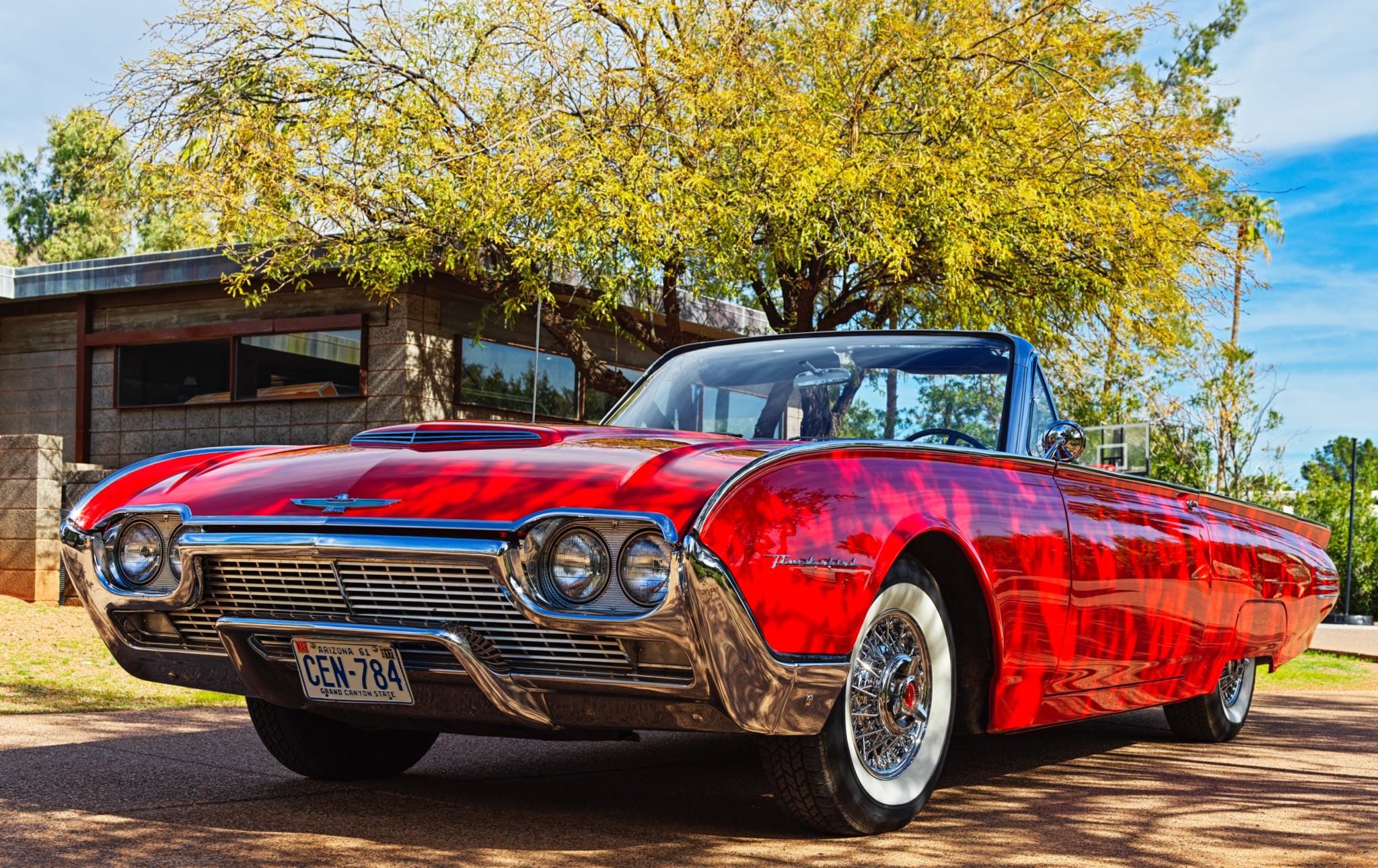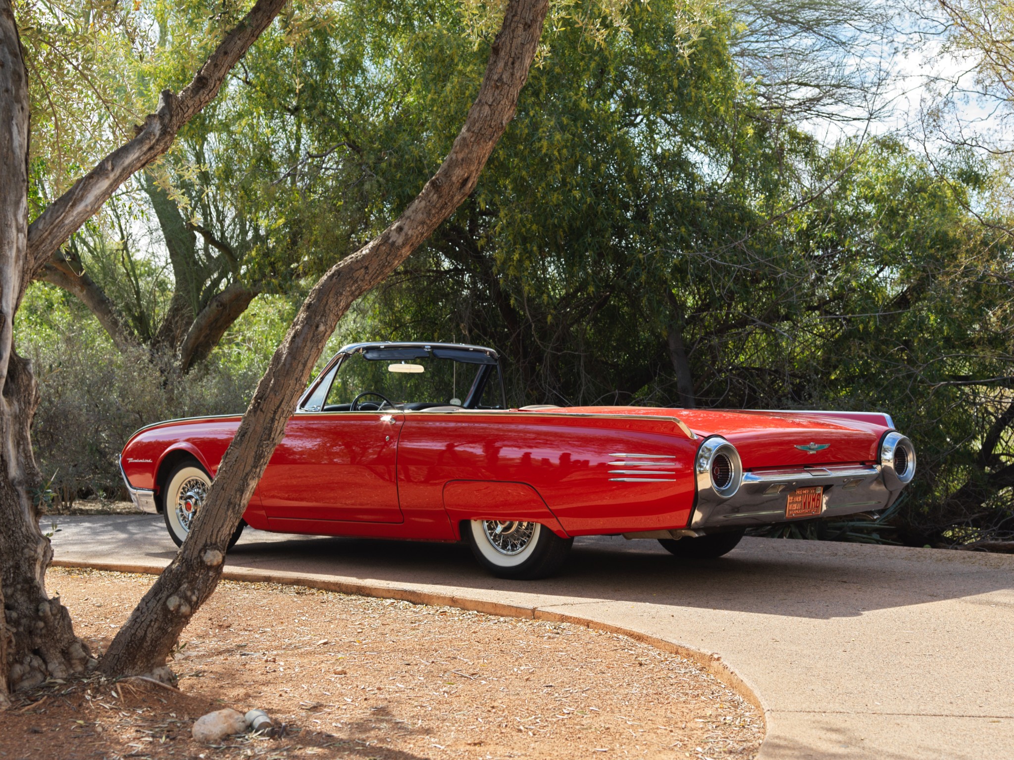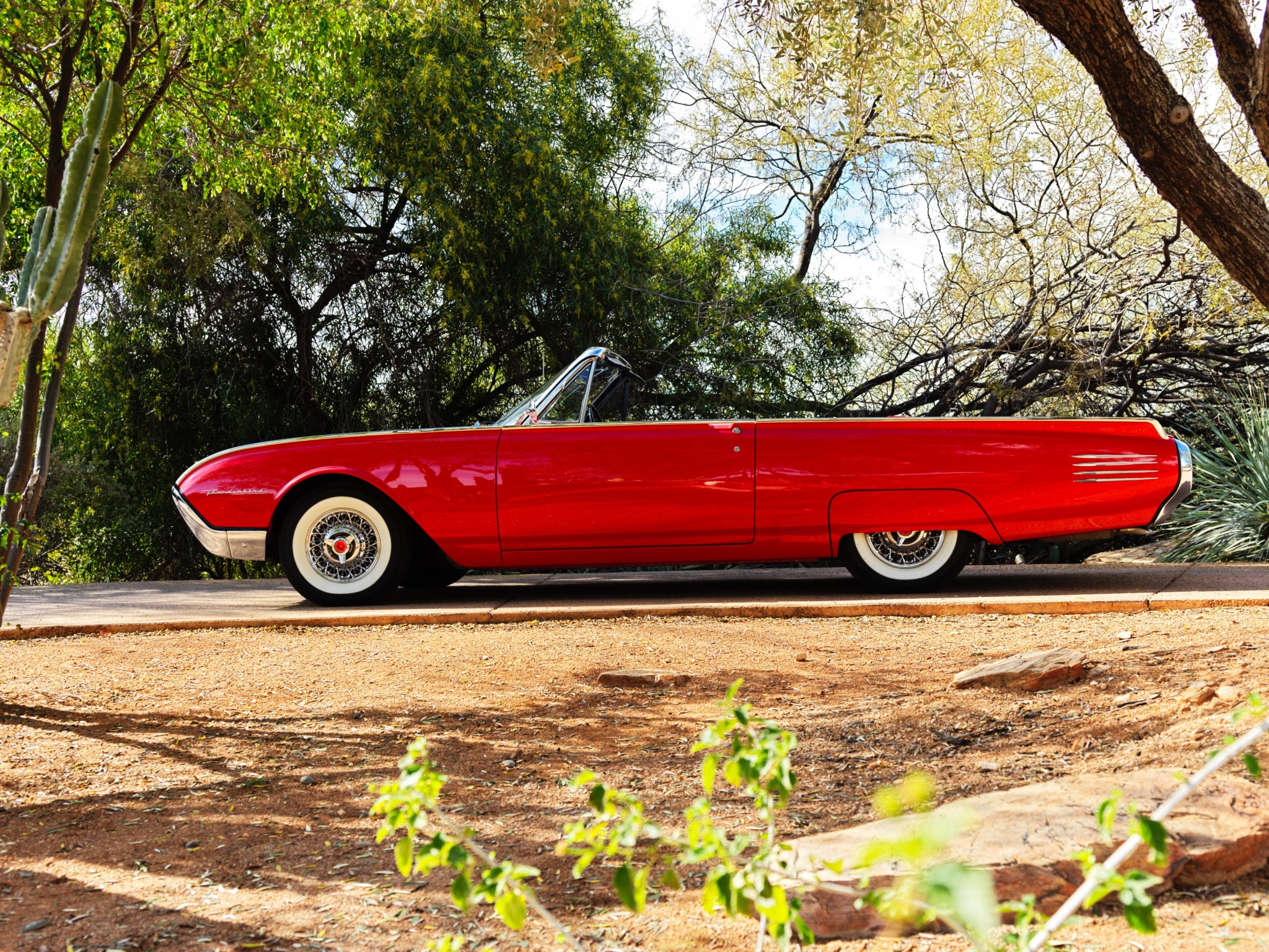 The replacement tan convertible top is shown raised in the gallery. Kelsey-Hayes wire wheels wear 14″ wide-whitewall tires. The car features power-assisted steering and brakes, and new suspension components are said to have been installed.