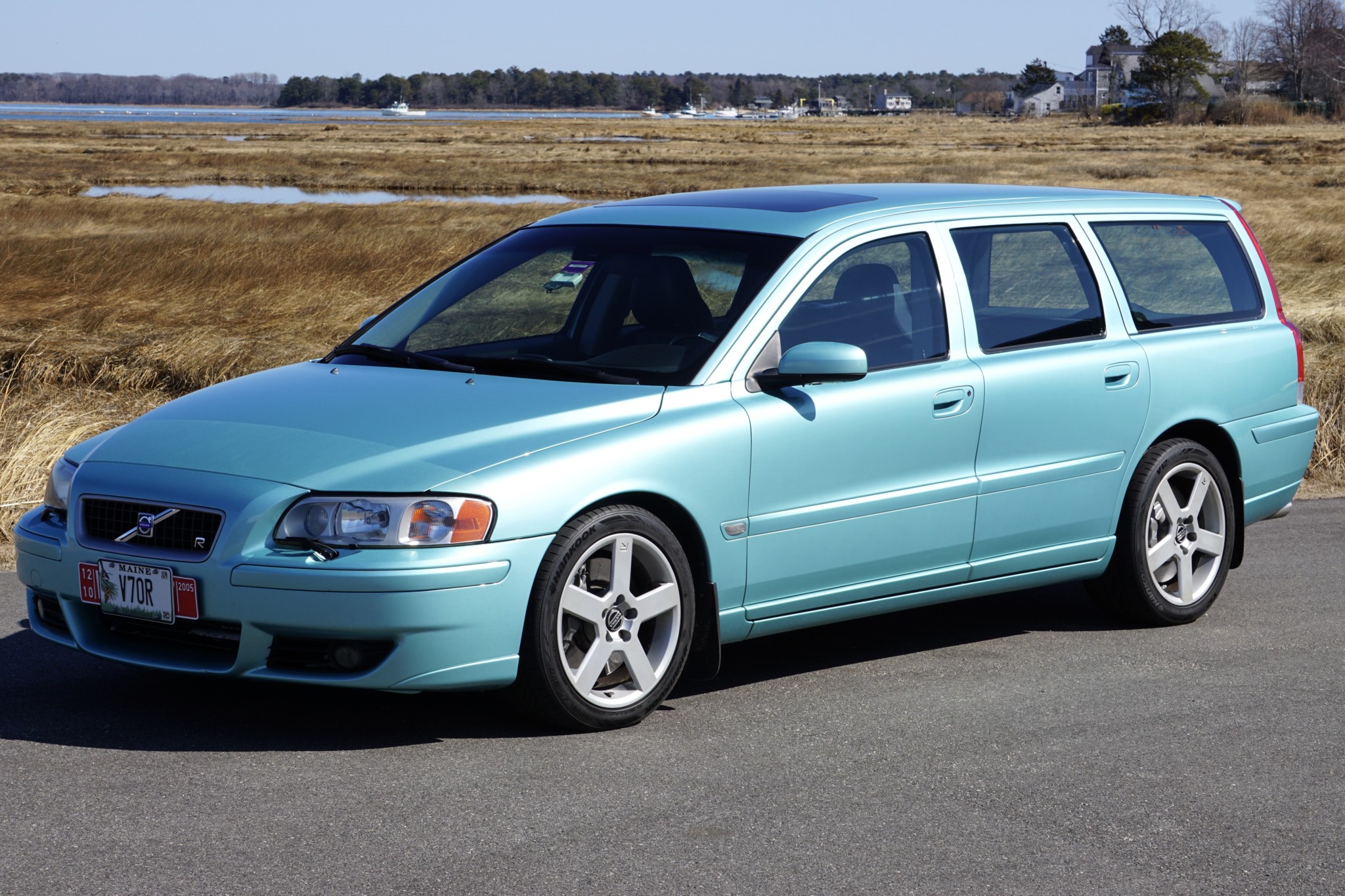 Factory 17″ Pegasus wheels are wrapped in Hankook Ventus V12 Evo tires. The seller notes curb rash on the wheels as well as damage to the sidewall of the passenger-side rear tire as shown in the gallery. Four-piston Brembo brake calipers came standard on the V70R, along with variable chassis-management profiles. The rear brake pads and rotors are said to be newer items.
