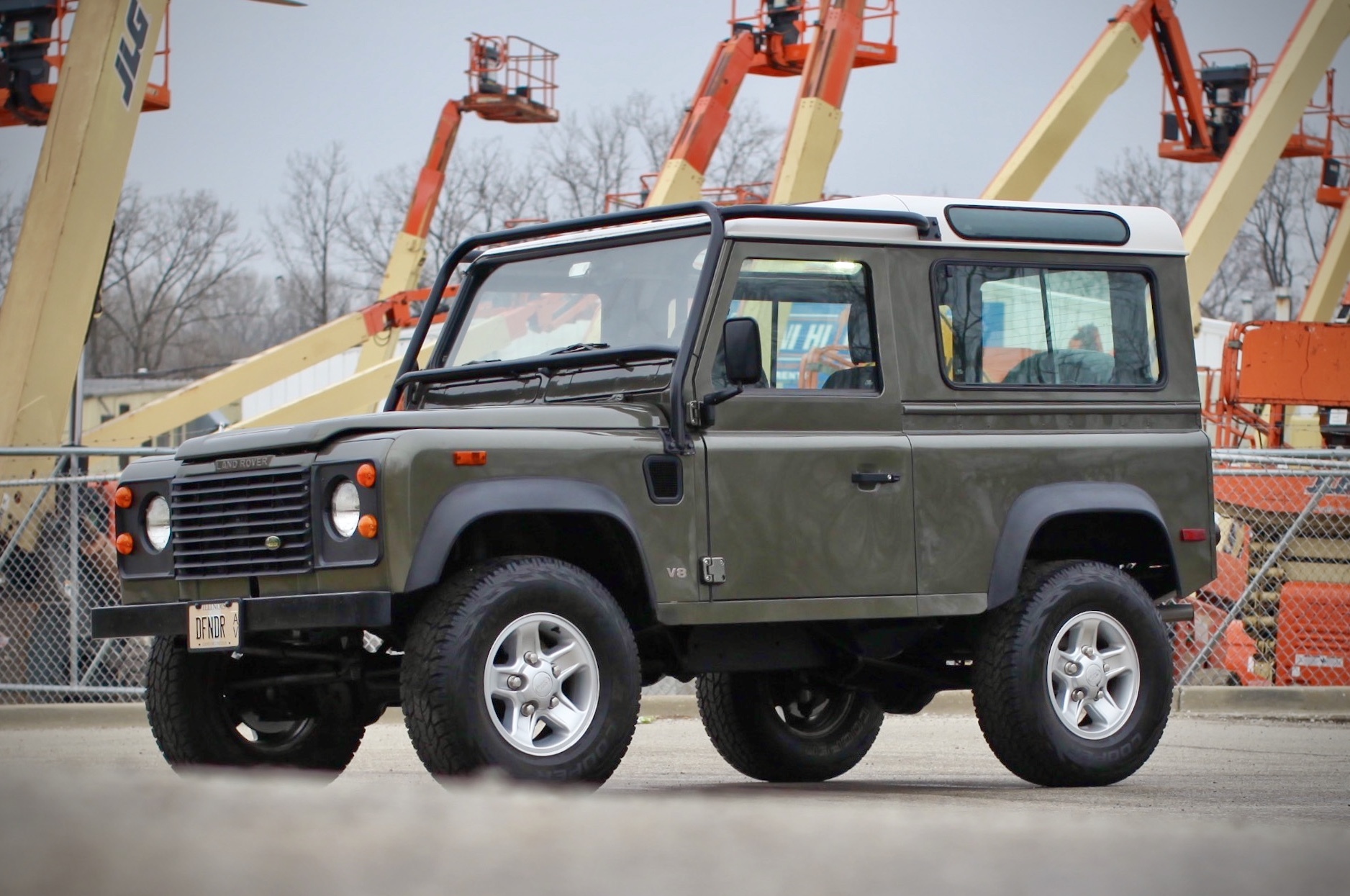 16″ Boost alloy wheels from a later Defender are installed and are mounted with a set of Cooper Discoverer A/T tires measuring 265/75. The prior owner installed a Terrafirma 2″ suspension lift kit, as well as a custom-made exterior cage kit.