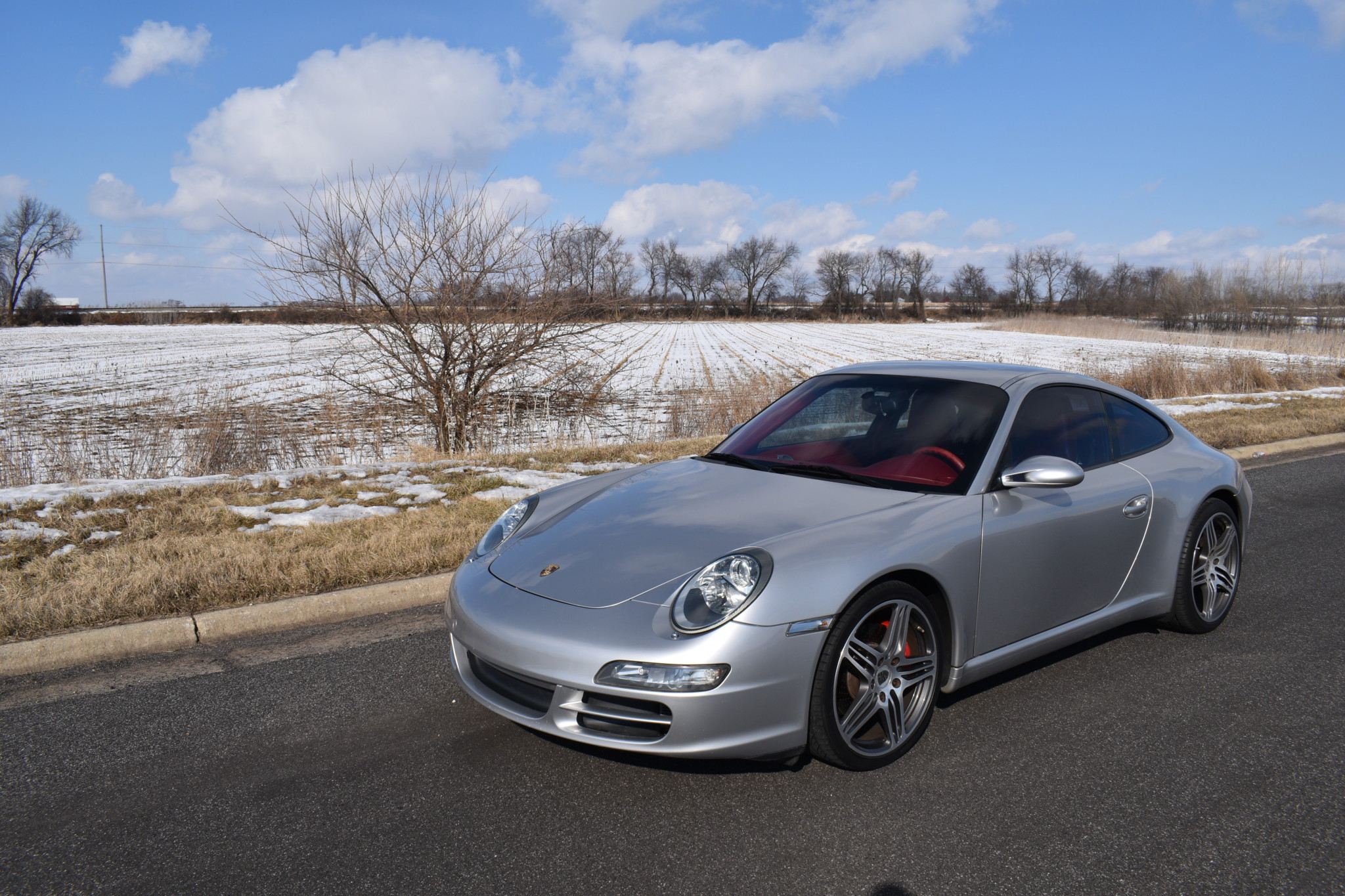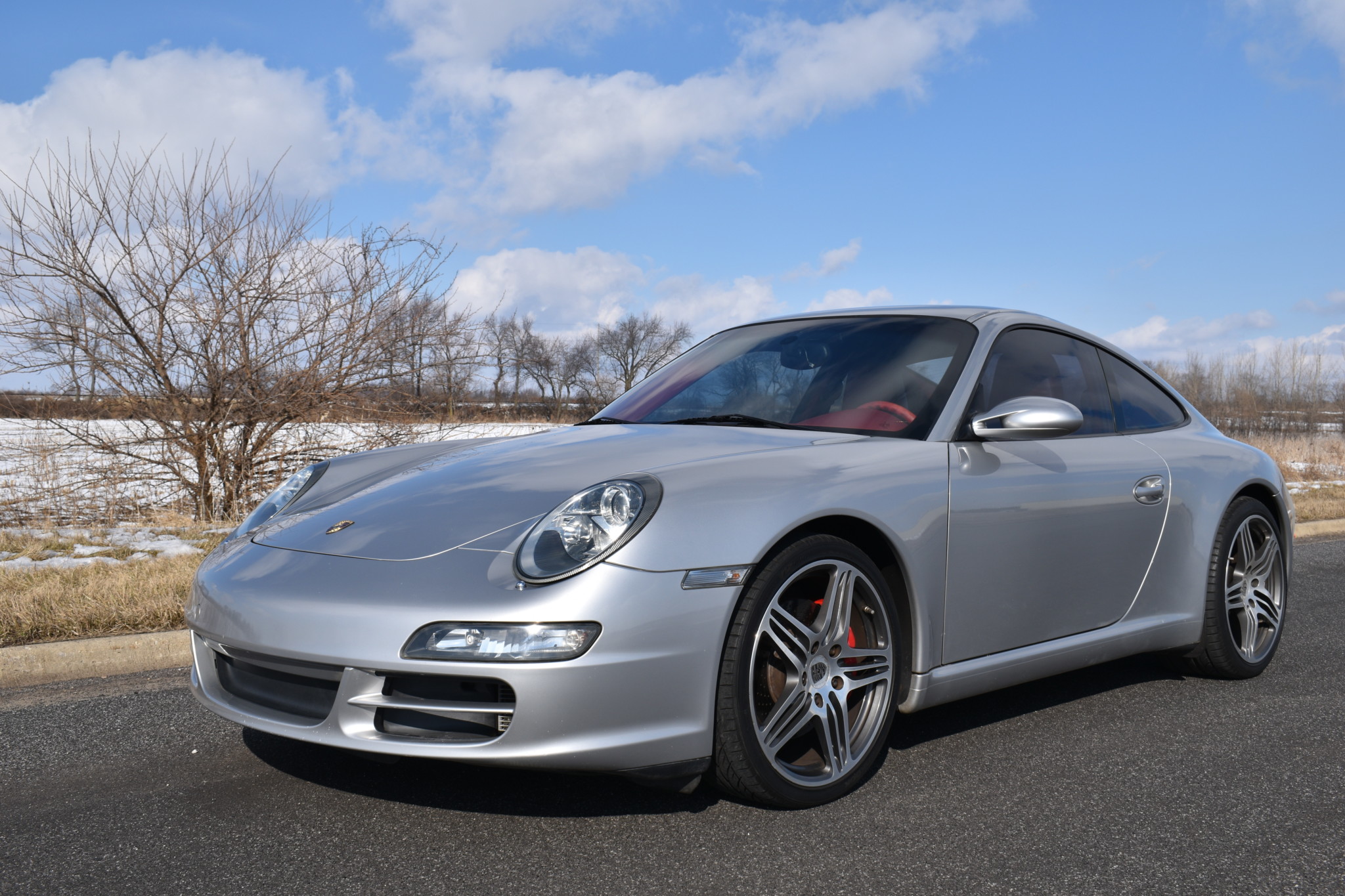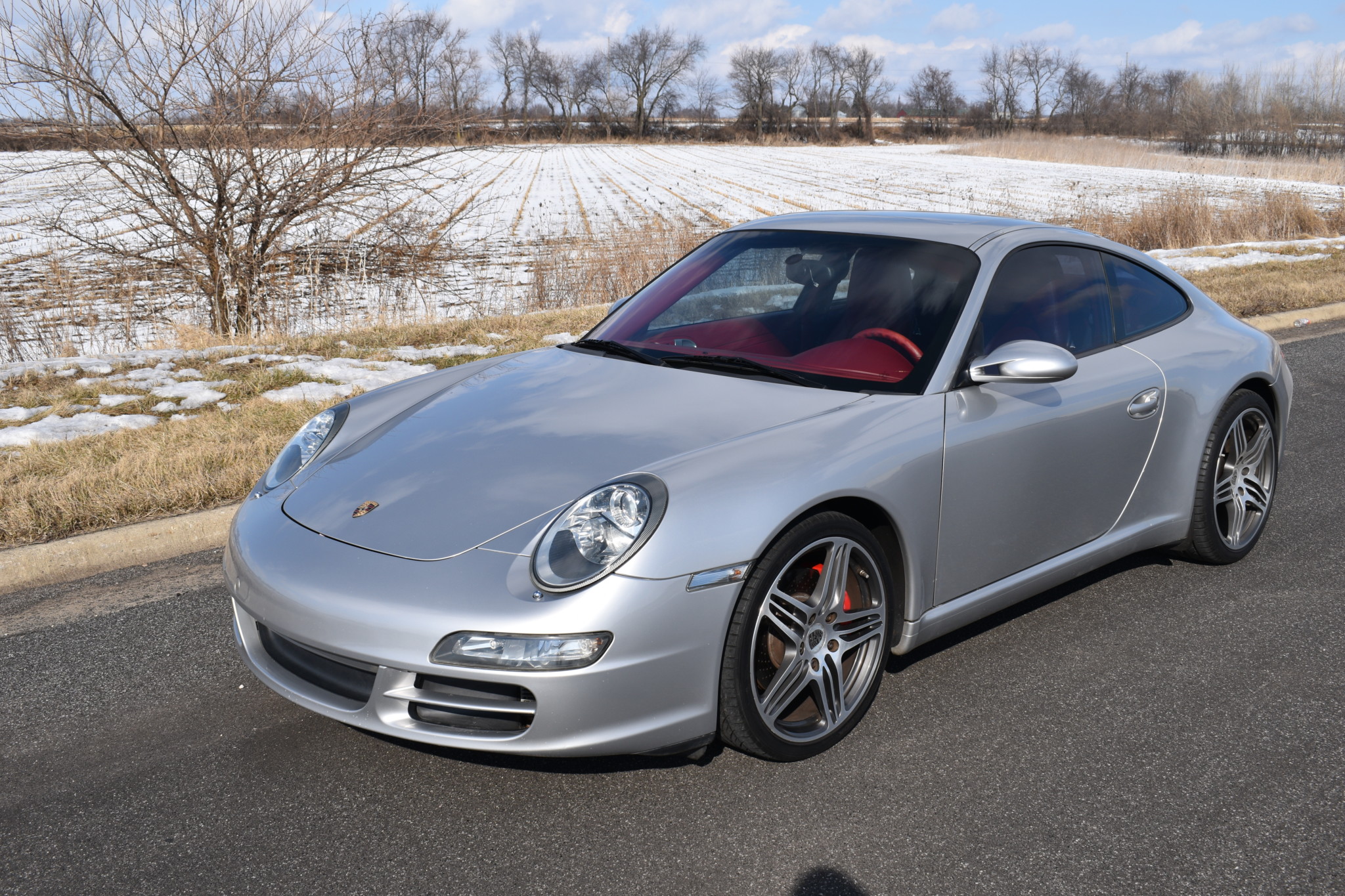 Staggered-width 19″ 997 Turbo-style wheels wear Hankook Ventus V12 Evo tires measuring 235/35 up front and 295/30 out back. The Carrera S package included cross-drilled brake rotors and red-painted calipers. Curb rash is noted on the rear wheels.