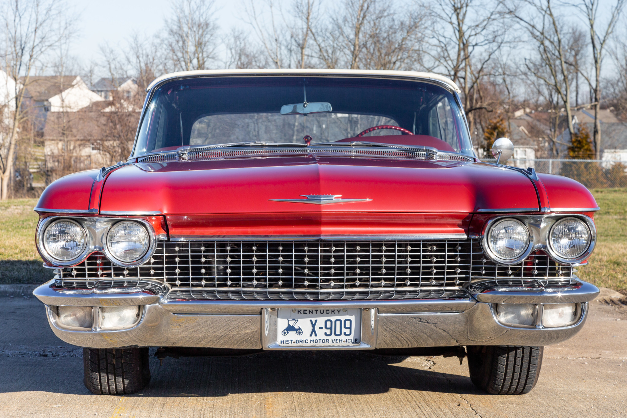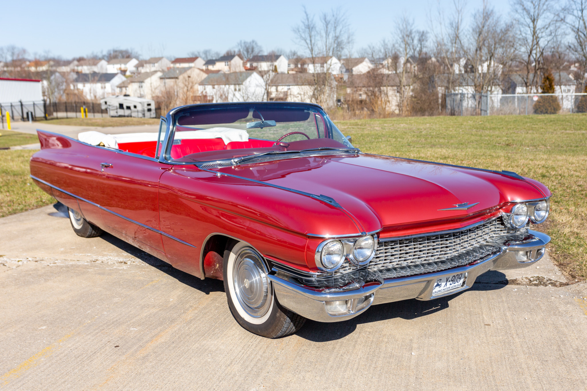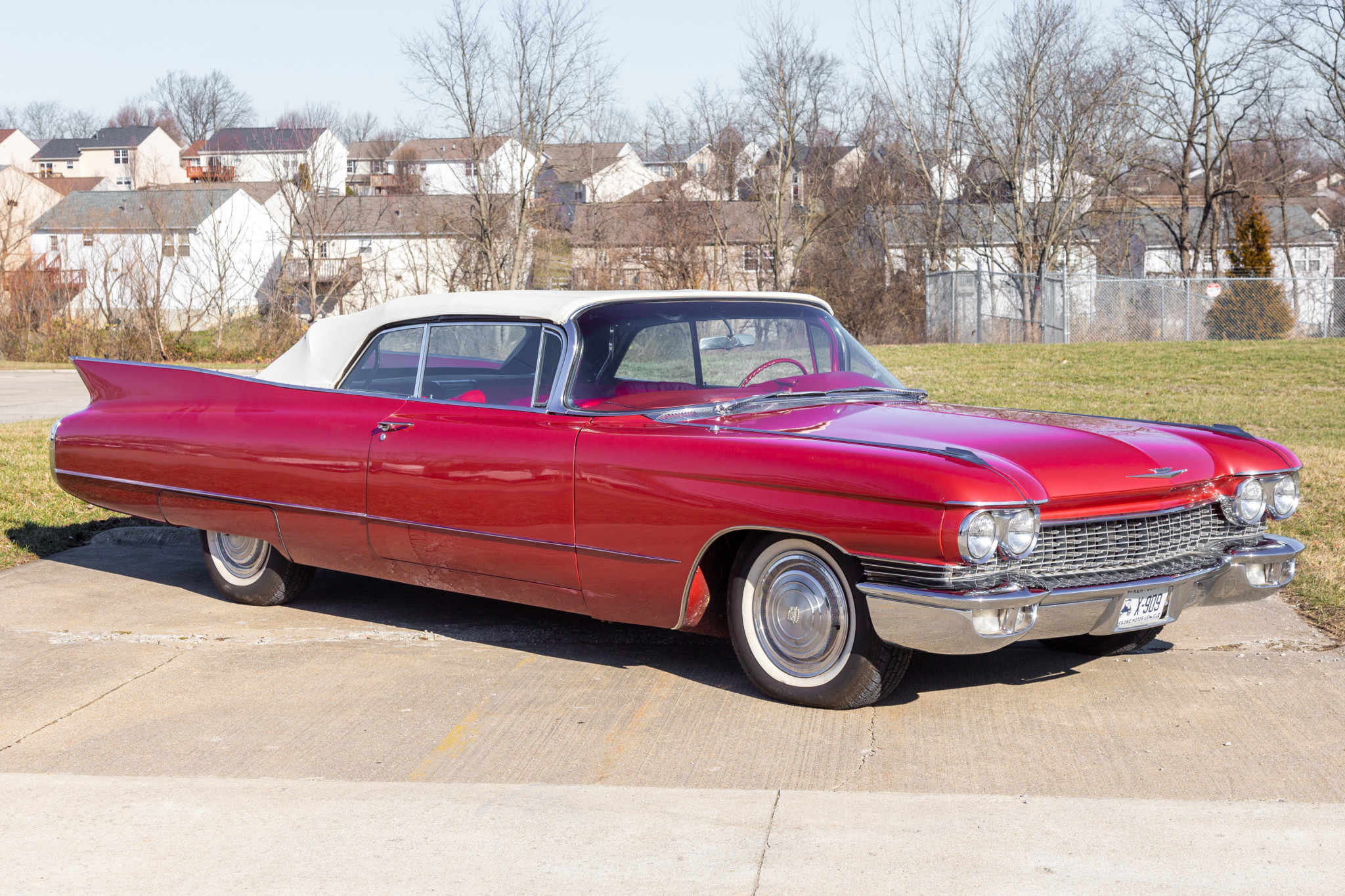 Steel wheels wear Cadillac covers and thin whitewall tires. The wheels, paintwork, and exterior trim are shown in detail in the photo gallery below, which depicts chipped paint and other imperfections noted by the seller.