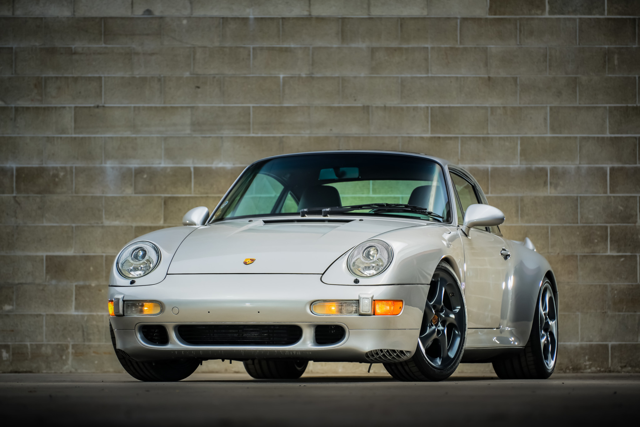 The 993 C2S shared a widebody platform with the 993 Turbo and Carrera 4S, including widened fenders, unique side skirts, and redesigned bumpers. Staggered-width 18″ Turbo Twist wheels have been refinished in dark metallic gray and are fitted with Continental Extreme Contact Sport tires. A set of lowering springs were installed in 2006, while the factory braking system features cross-drilled and vented rotors with black calipers.