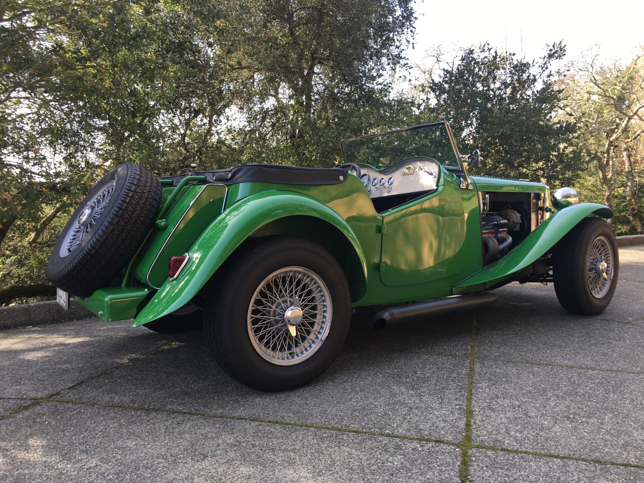 Painted 15″ 72-spoke knock-off wire wheels were reportedly fitted with Vredestein tires less than 2k miles ago. The custom four-link rear suspension setup is said to have been designed by Joe Casanova of San Jose, California to feature a Panhard rod, two extra crossmembers, and repositioned frame rails. Additional modifications include Aldan coilovers, custom tubular A-arms, an MGB steering rack, and Triumph TR6 wheel splines. Braking is handled by an MGB front disc setup with slotted and cross-drilled rotors, Ford rear drums, and Wilwood master cylinders.