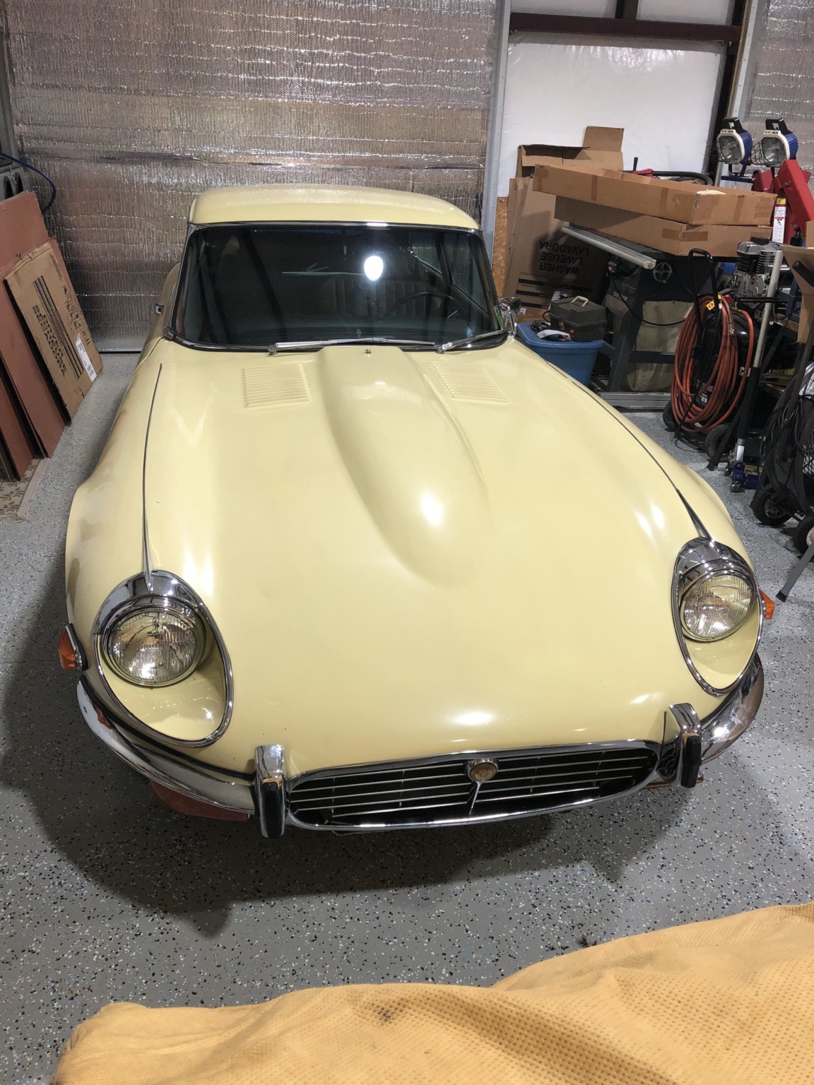 Splined hubs and Dayton wire wheels were fitted shortly after the current owner’s acquisition in 2004, and the seller notes that the Pirelli P4000 tires should be replaced due to age. Brake work in 2004 included replacement of the rear rotors and pads as well as rebuilds of the rear calipers. A new vacuum servo, hoses, and fluid level sensors were fitted in 2017, and the brake master cylinder and fluid were replaced in 2020. A spare wire wheel and inner tube are included in the sale along with a knock-off hammer, while the tire jack and driver’s side brake cooling duct are missing.