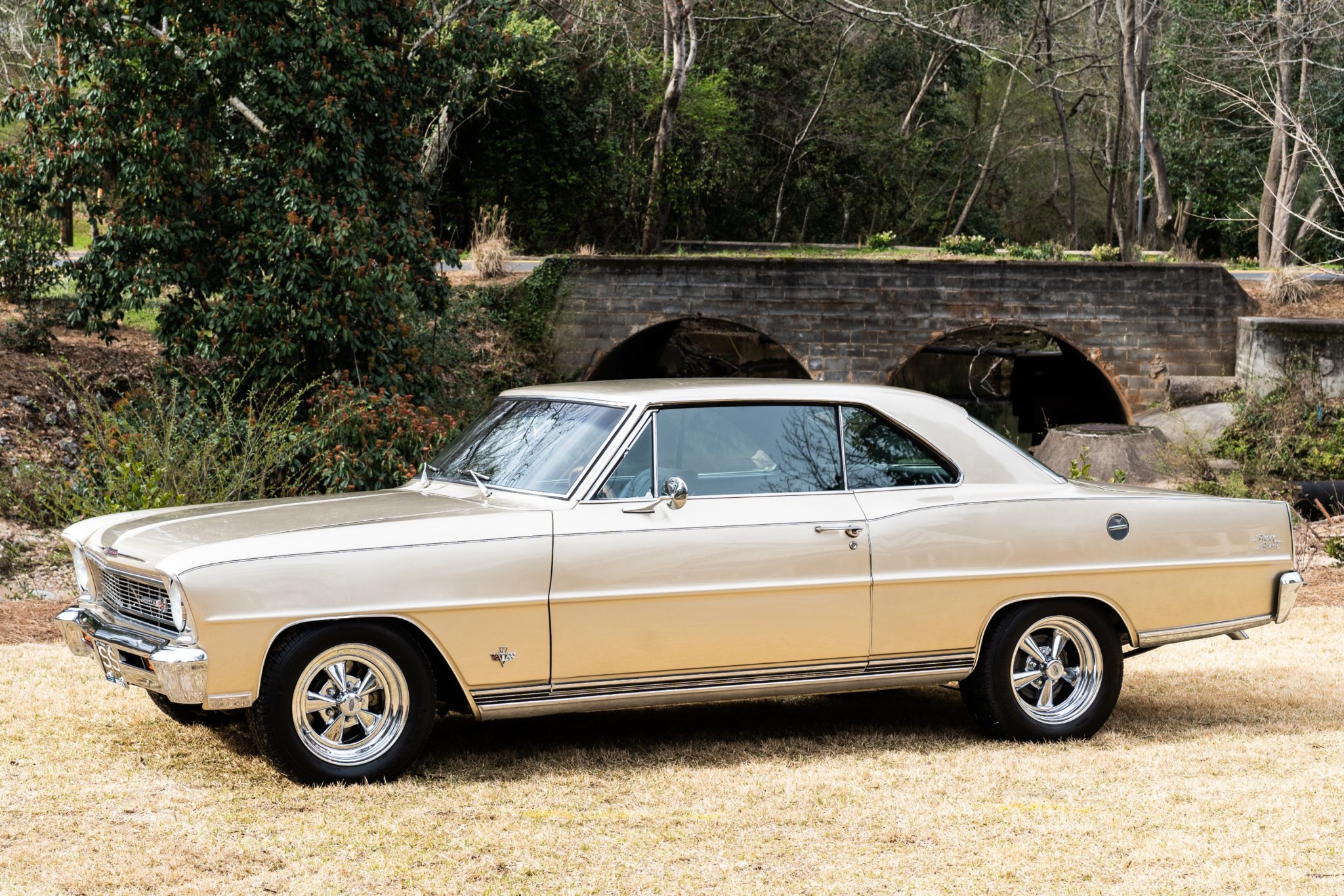 Chrome-finished 15″ Cragar S/S wheels wear BFGoodrich Radial T/A tires. Front disc brakes are paired with drums at the rear. The upper and lower ball joints were replaced and the steering arms adjusted in January 2020.
