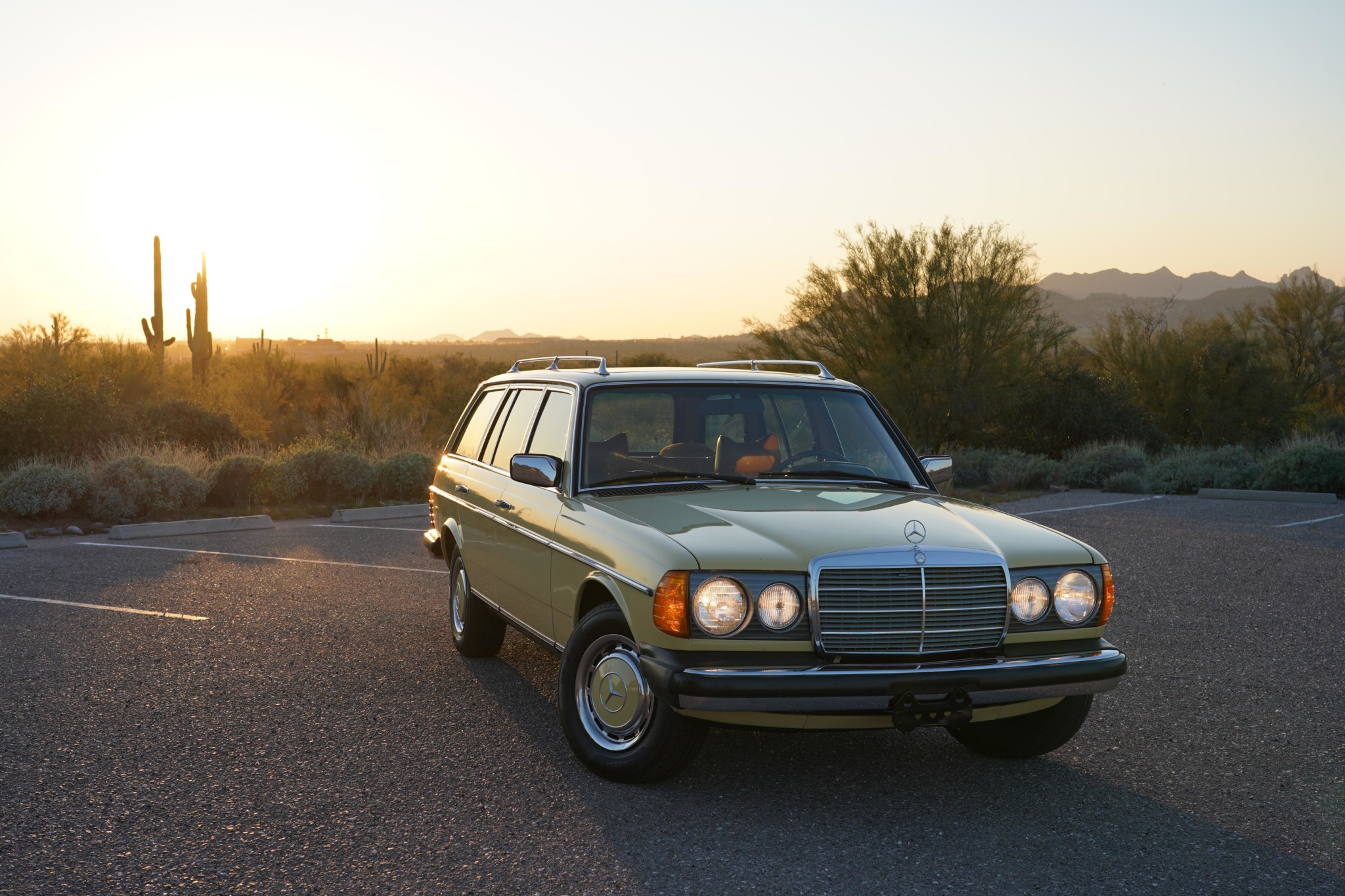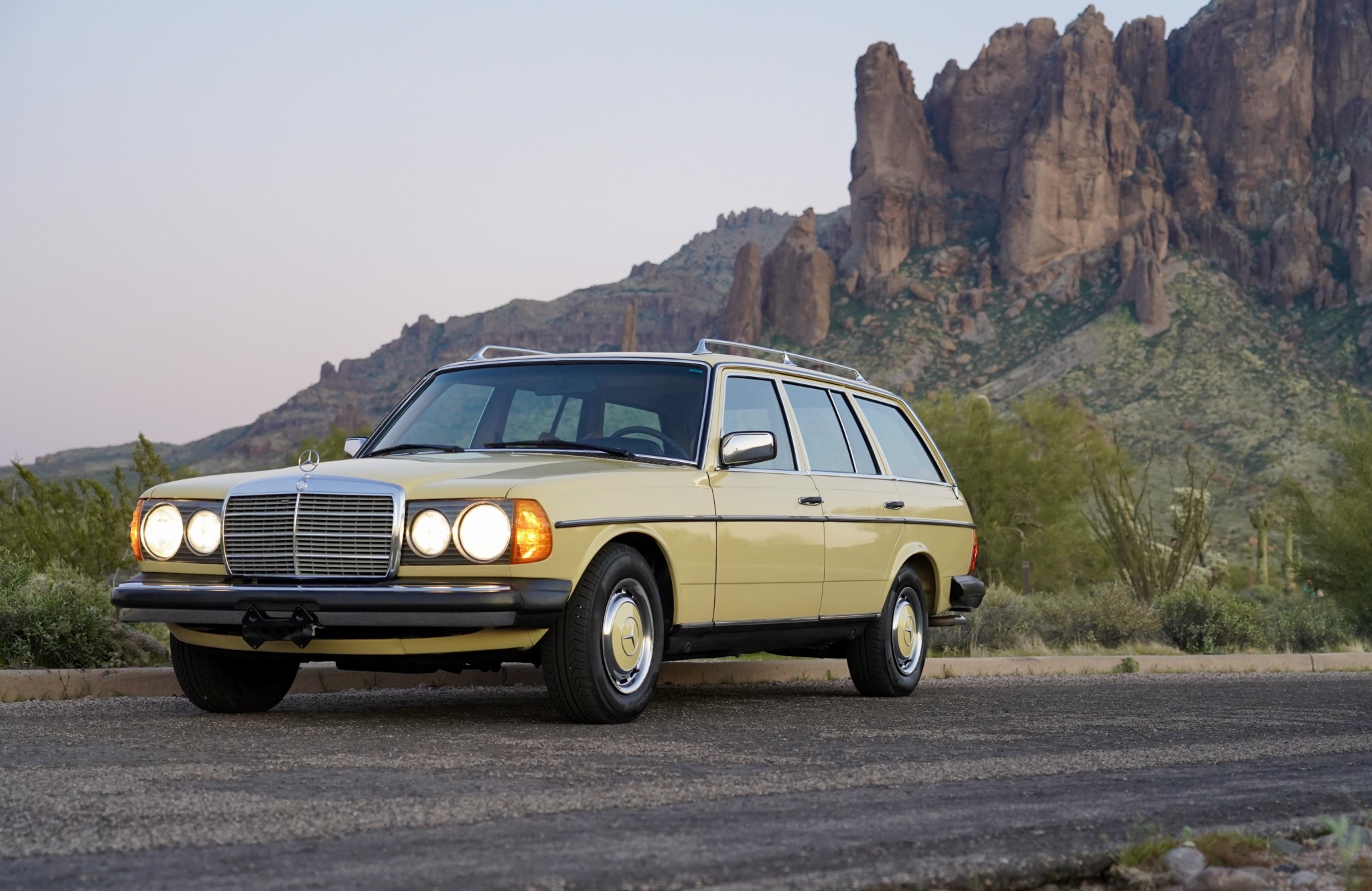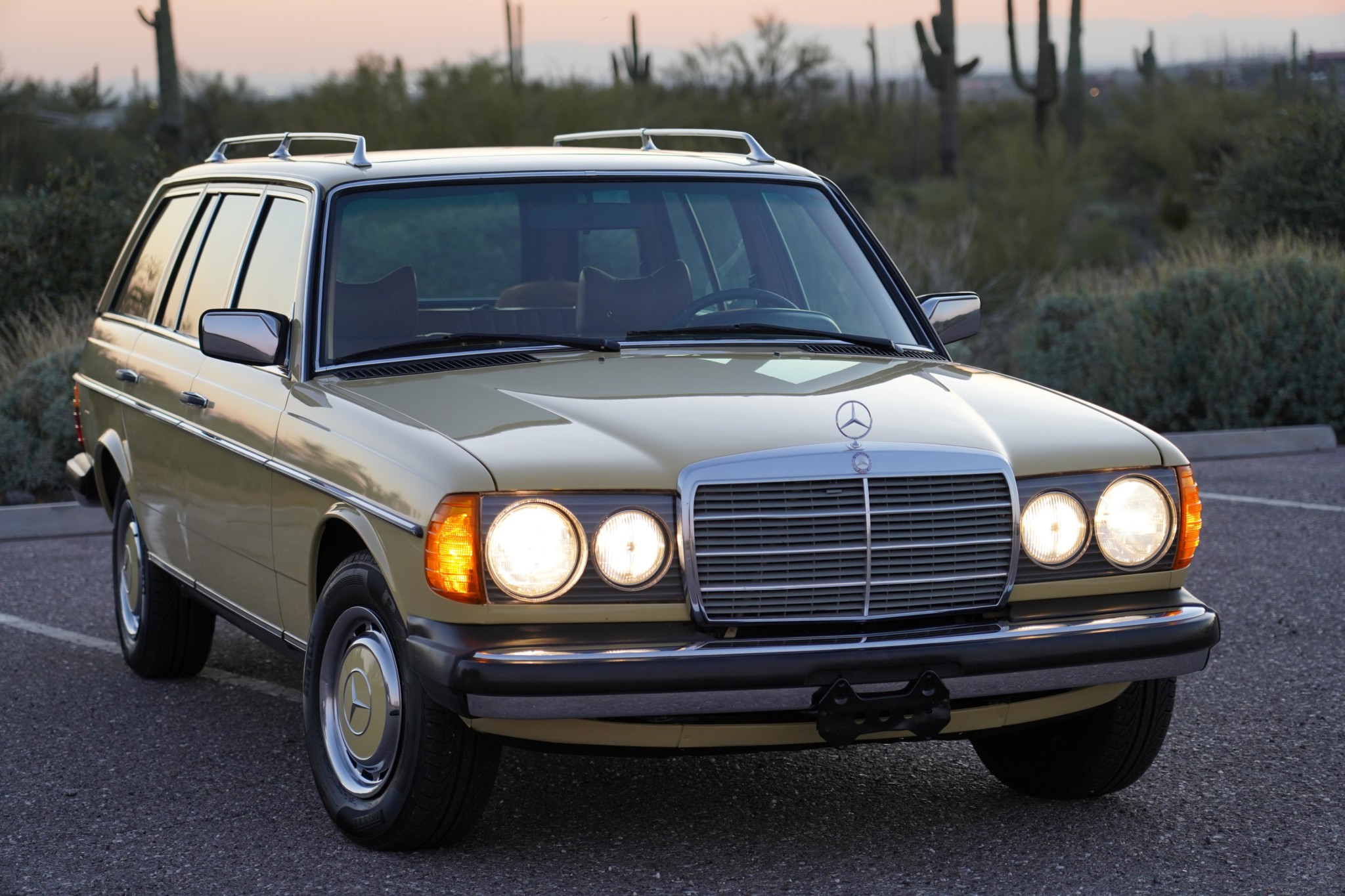 This W123 wagon features chrome roof rails and side mirrors, a steel sunroof, and a rear window wiper. Stock 14″ steel wheels wear polished covers with body-colored centers, and 195/70 Pirelli P4 tires from 2013 are mounted all around.