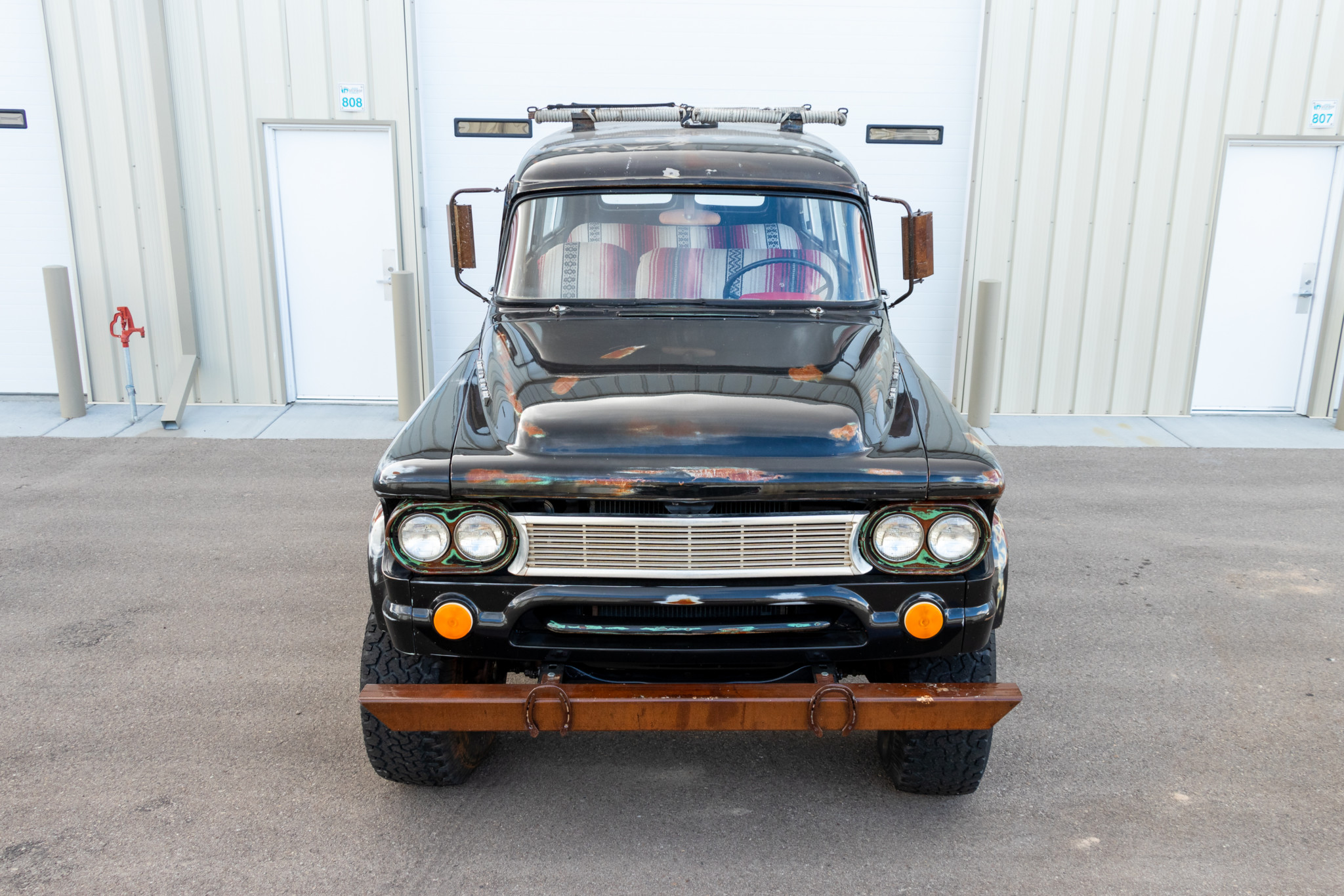 Eight-lug 16.5″ steel wheels are painted red and mounted with a set of 31″ x 12.5″ BFGoodrich All-Terrain T/A KO tires that are reported to display weather checking.