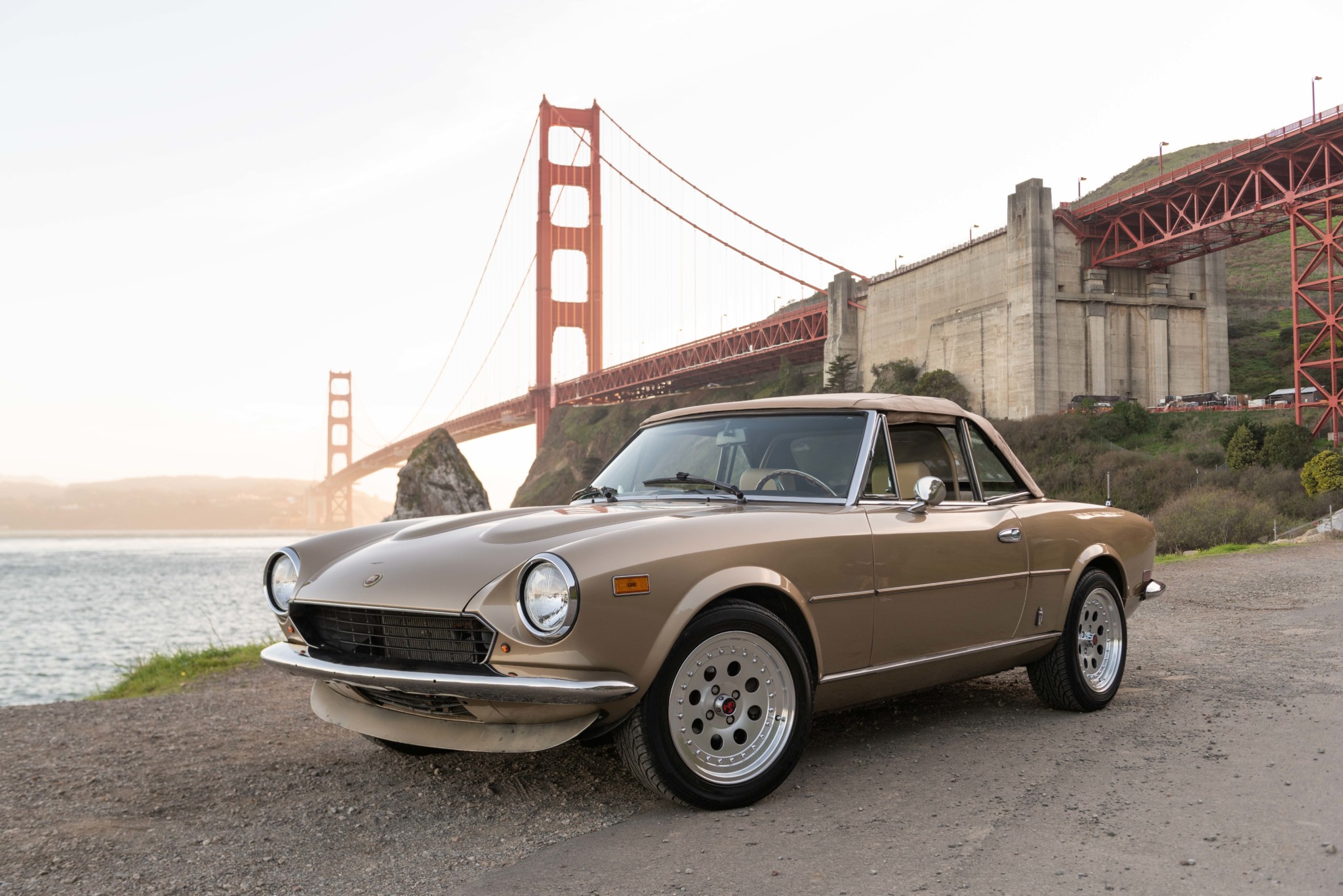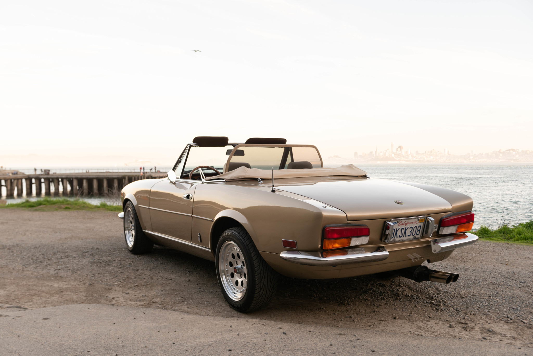 15×7″ Senna wheels wear red scorpion center caps and Doral tires, and the car rides on Vogtland lowering springs. A Wilwood big brake kit is installed up front, and the rear brakes are said to be from a Fiat 500. Urethane bushings have been added to the front and rear suspension.