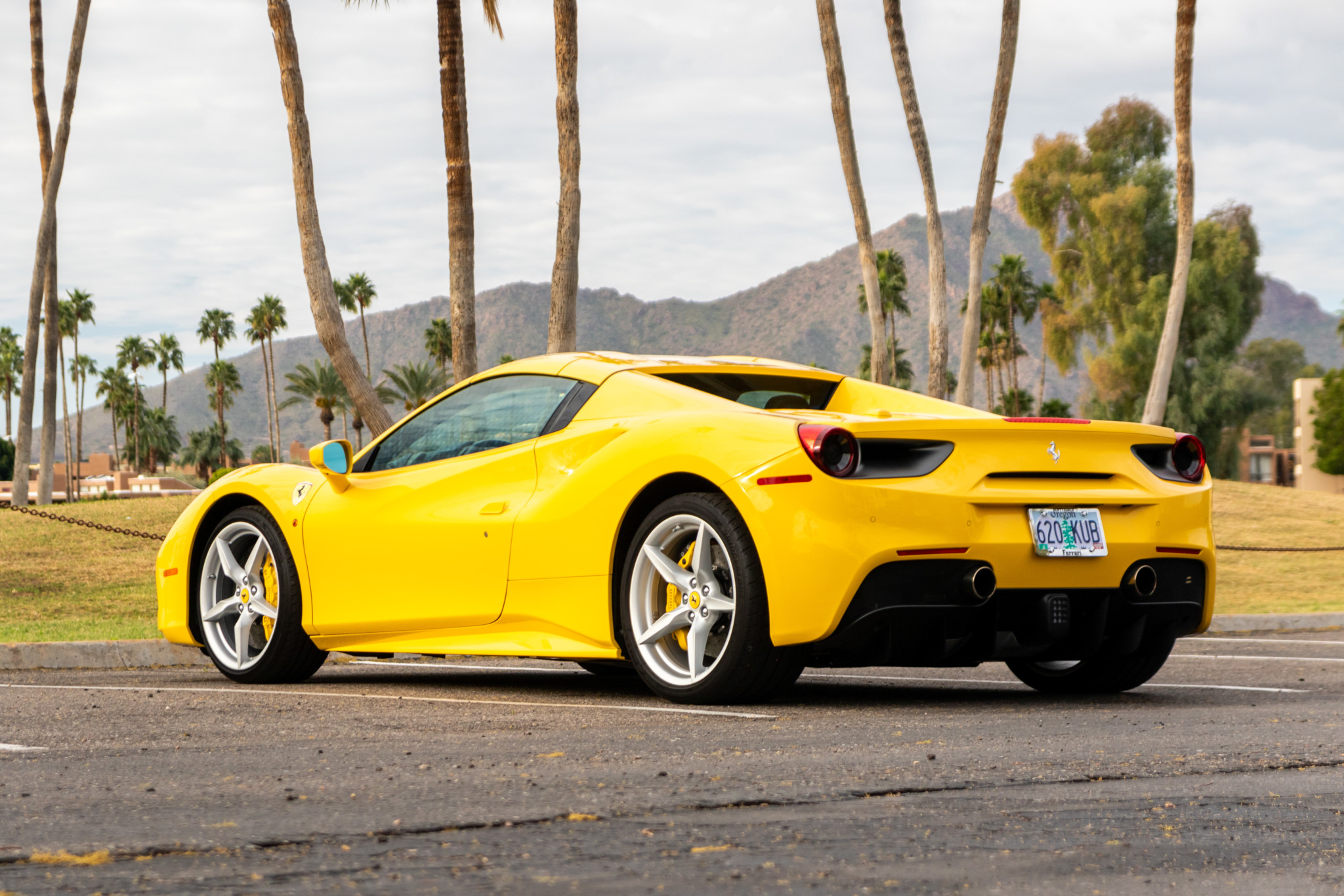 Factory 20″ five-spoke wheels are mounted with Bridgestone Potenza S007 tires measuring 245/35 up front and 305/30 out back. Carbon ceramic brakes came as standard, and this example is also equipped with optional yellow-finished brake calipers, magnetorheological dampers, slide slip control, and a double wishbone front and multi-link rear suspension.