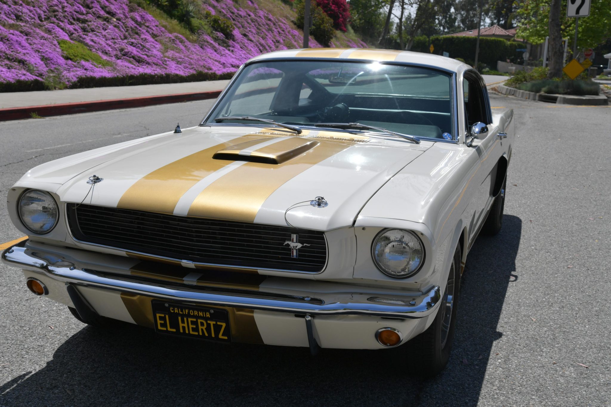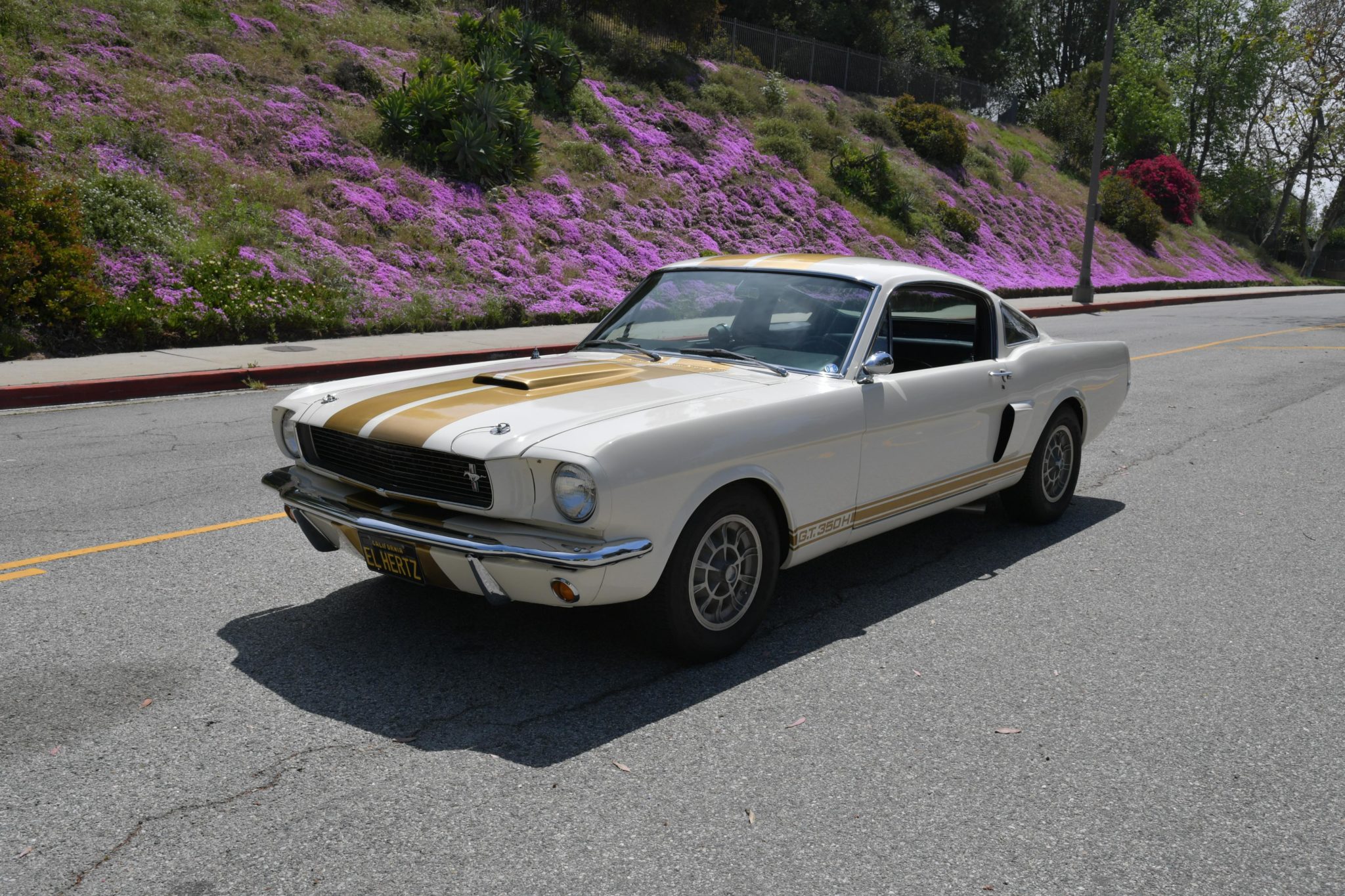 Shelby 14″ ten-spoke wheels wear 205/70 Goodyear Eagle GT+4 tires. Shelby chassis modifications over the stock Mustang included revised front suspension geometry, Kelsey-Hayes front disc brakes, and larger rear brake drums. A side-exist exhaust system was installed under current ownership.