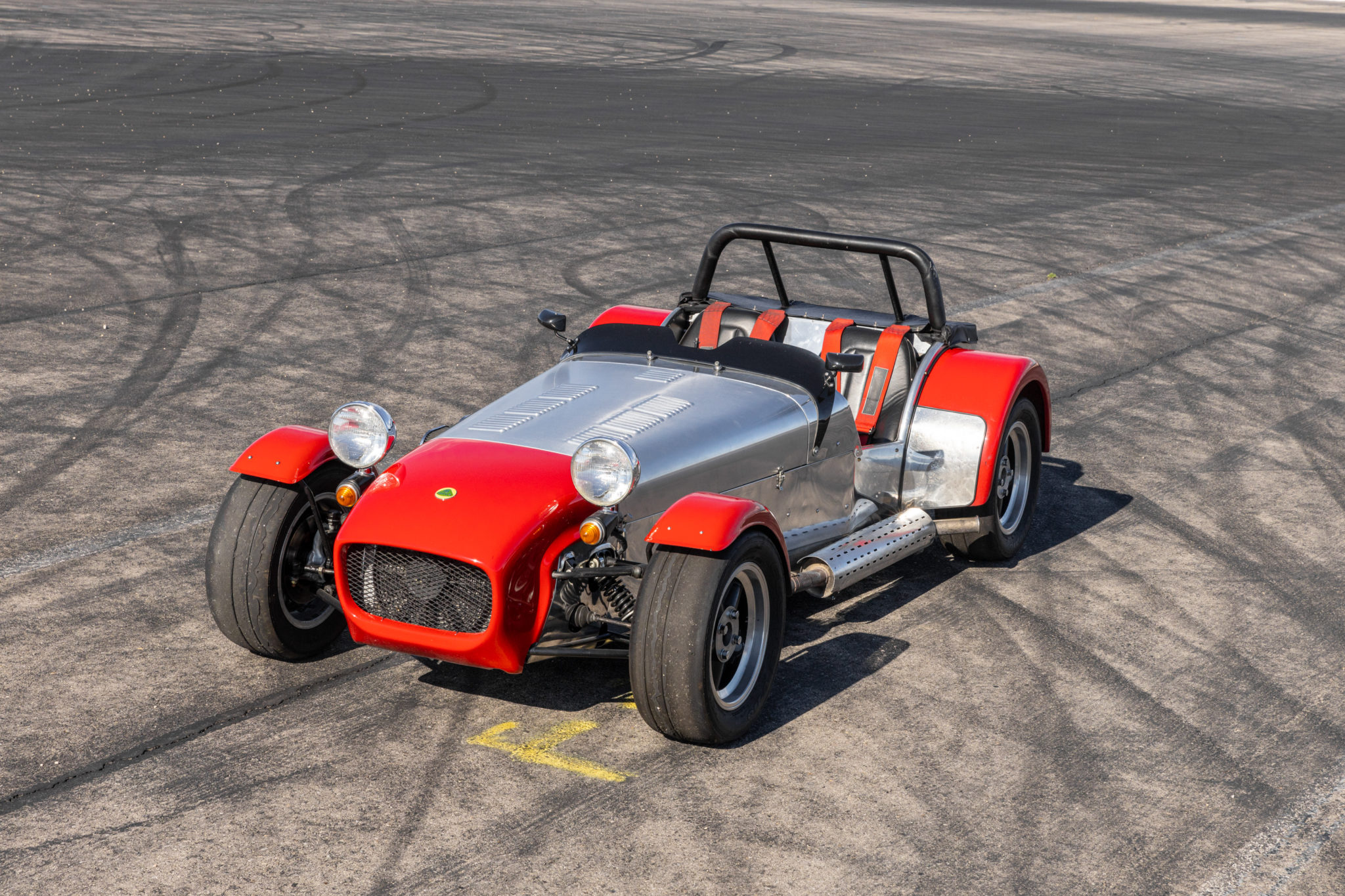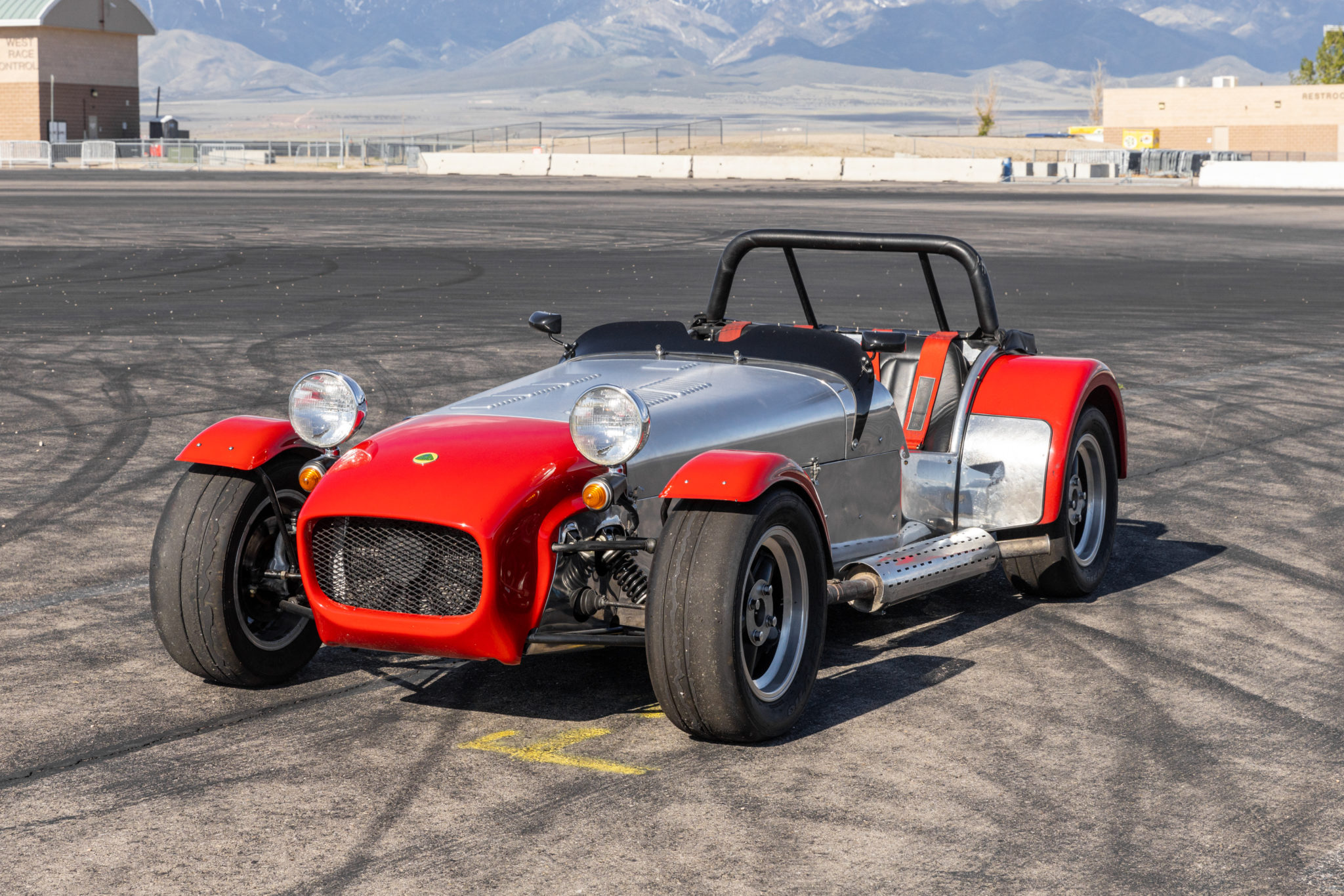 Factory alloys are replaced by 14″ Revolution wheels that are wrapped in Kumho Ecsta V710 slick tires. Bilstein coilovers are fitted, and braking is handled by four-wheel discs. The factory wheels are included in the sale along with an additional set of tires, brake pads, rotors, and lug nuts.