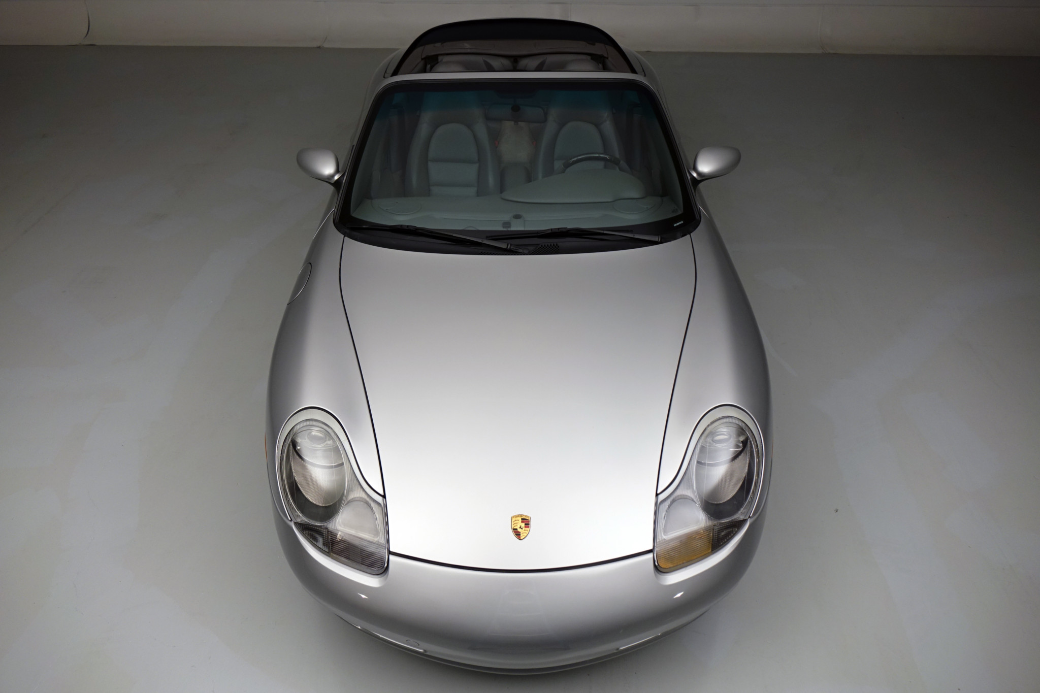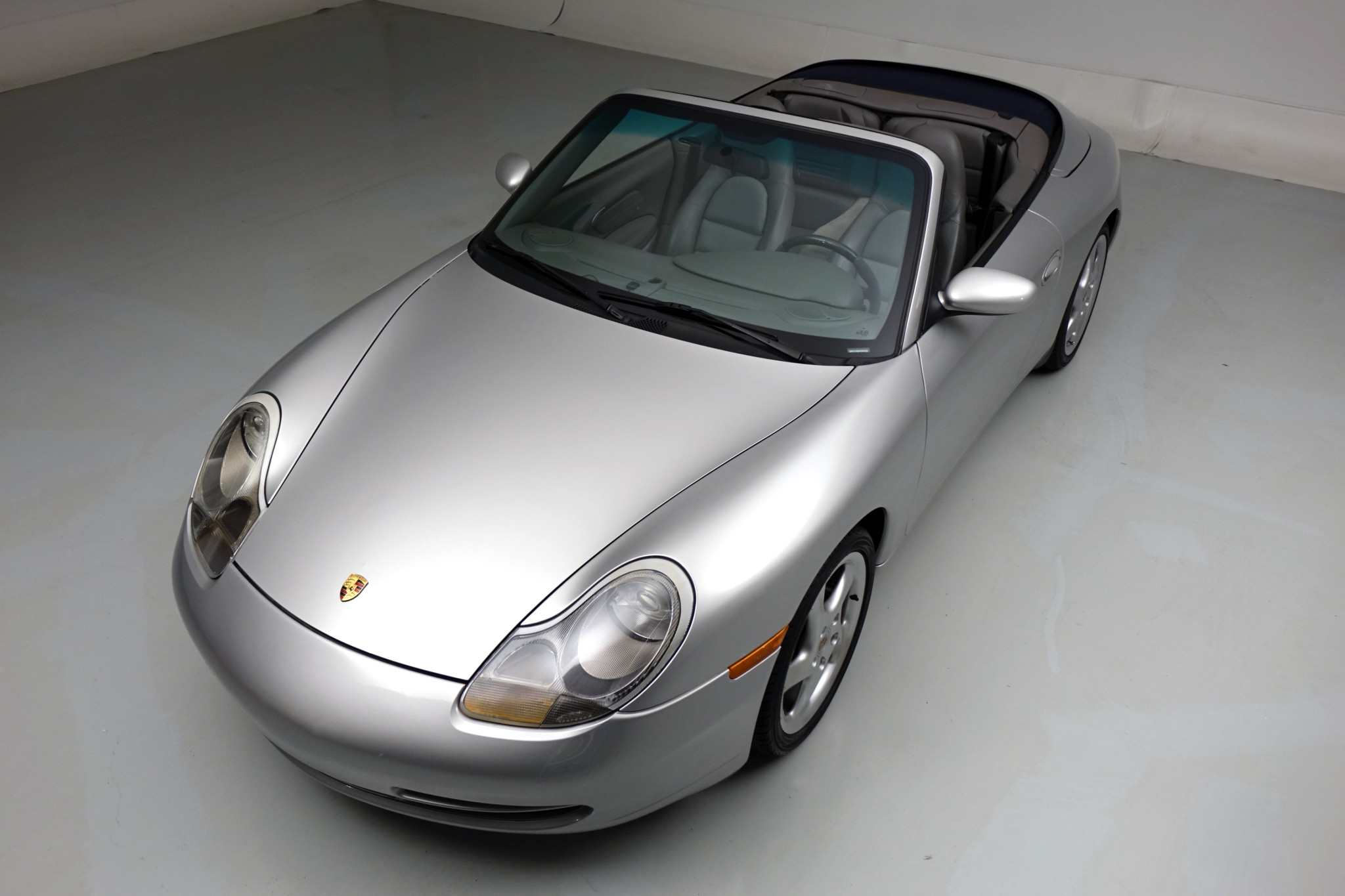 Optional 18” Turbo-look wheels wear colored Porsche center crests and are mounted with Yokohama Avid ENVigor tires. The blue soft top is photographed in its raised and lowered positions as well as mid-operation.