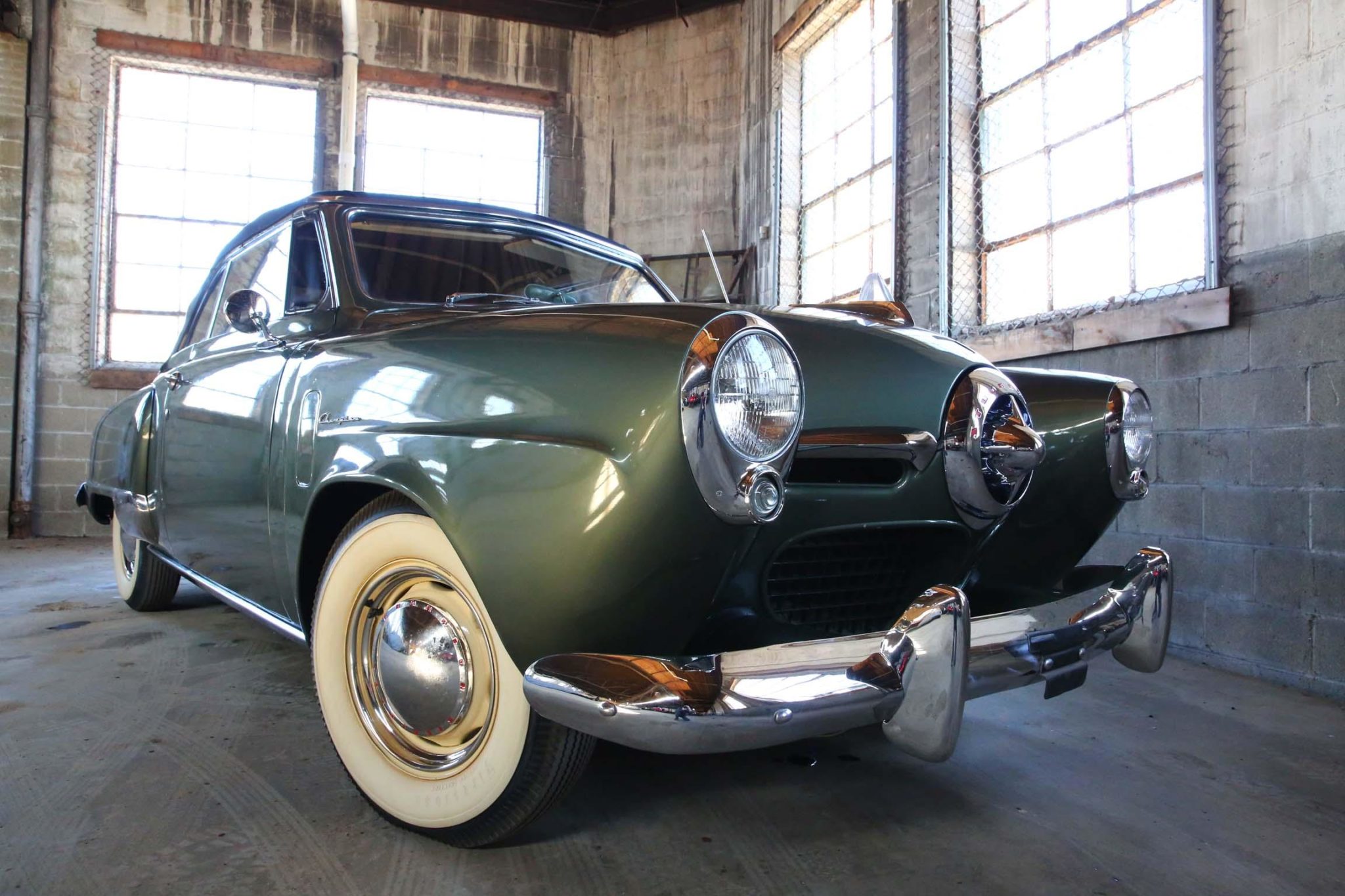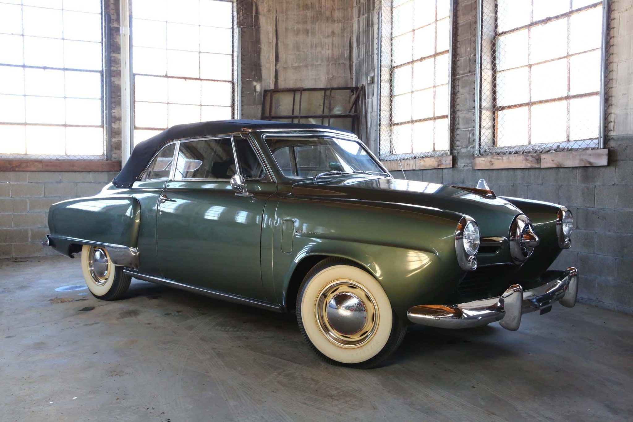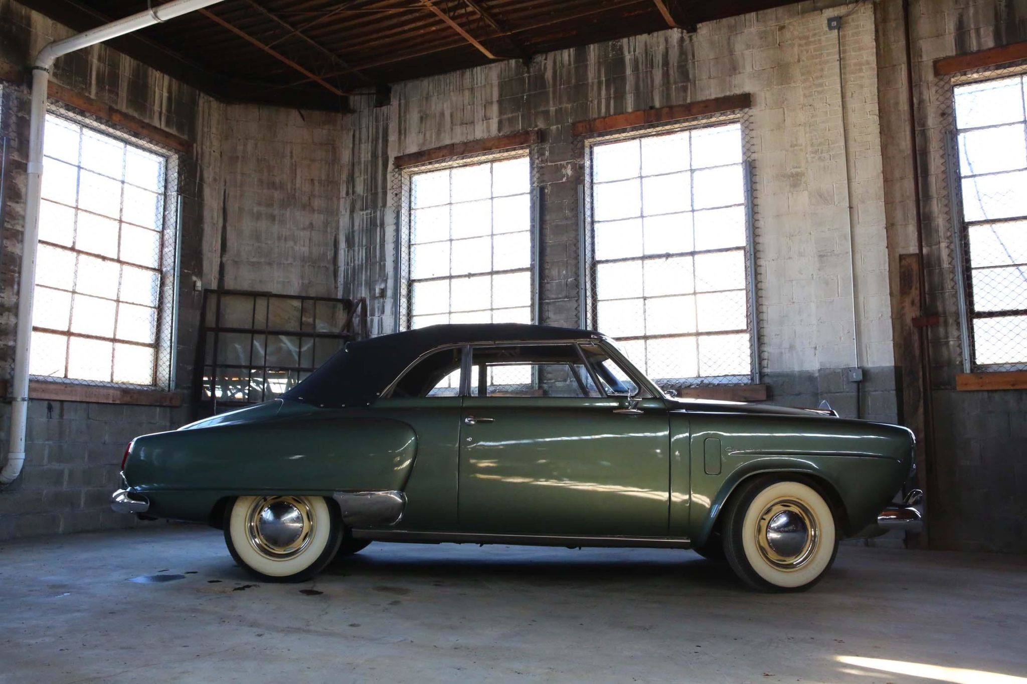 The seller reportedly installed a replacement factory-style cloth top with chrome rear window trim and also rebuilt the motors for the power top. Cream-colored steel wheels are fitted with chrome trim rings and Studebaker Champion–branded hubcaps, and Firestone Deluxe Champion whitewall tires are mounted.