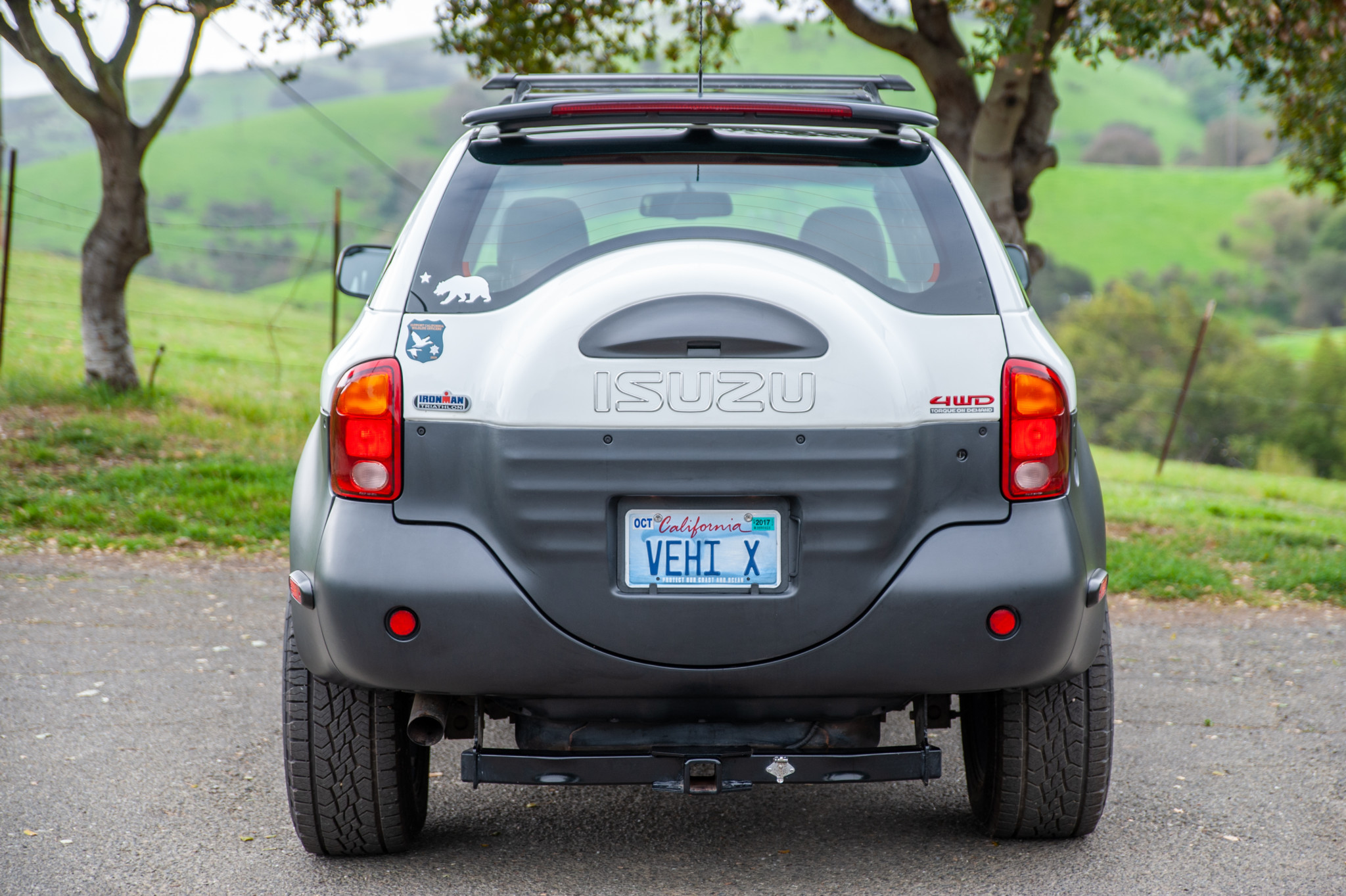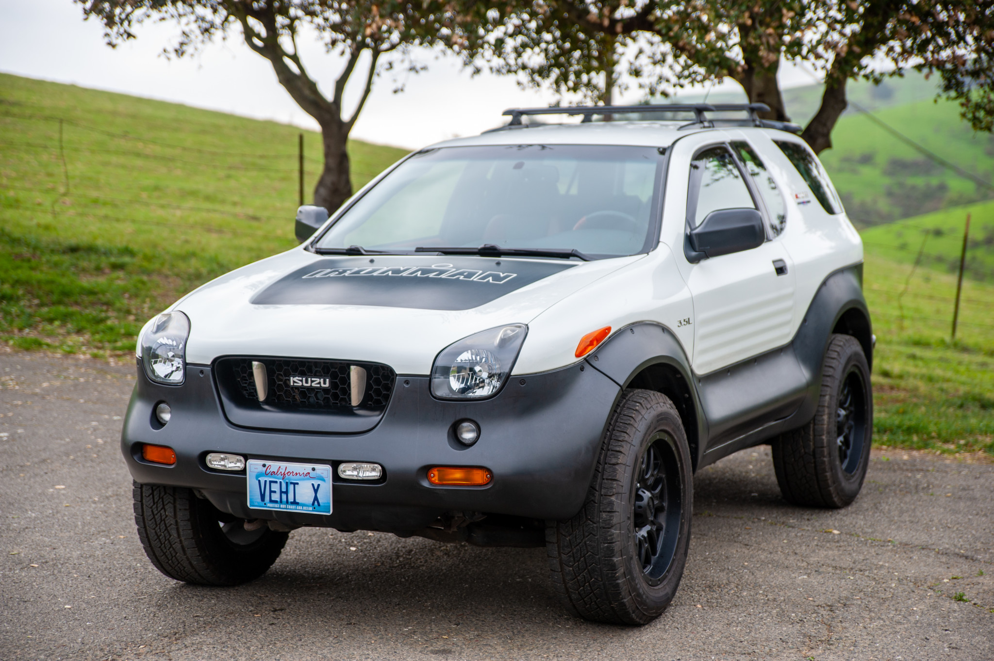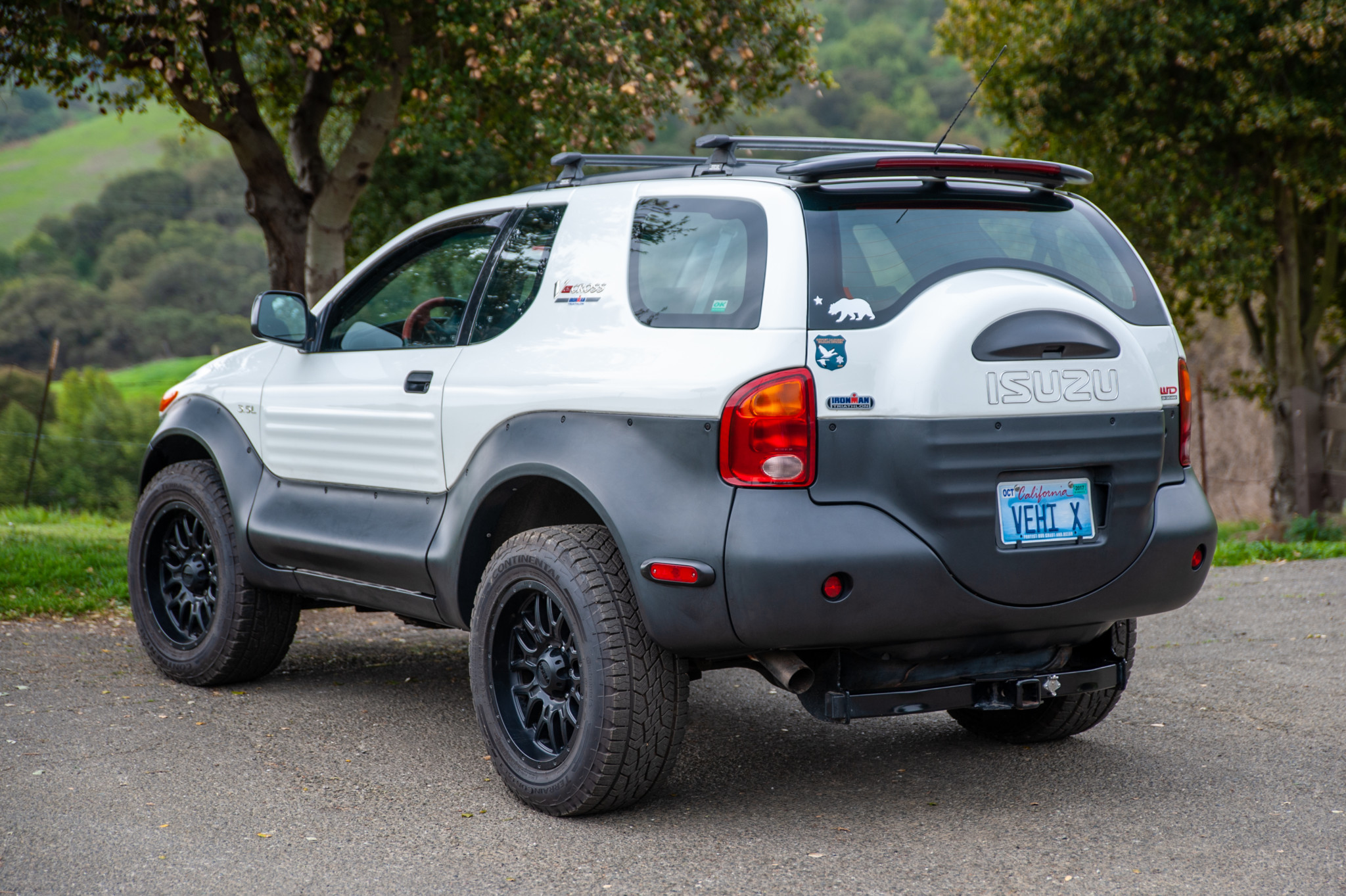 The roof features a factory rear spoiler. Yakima crossbars included as part or the Ironman package. Black aftermarket wheels are fitted with Continental all-terrain tires. The seller notes a chip in the windshield.
