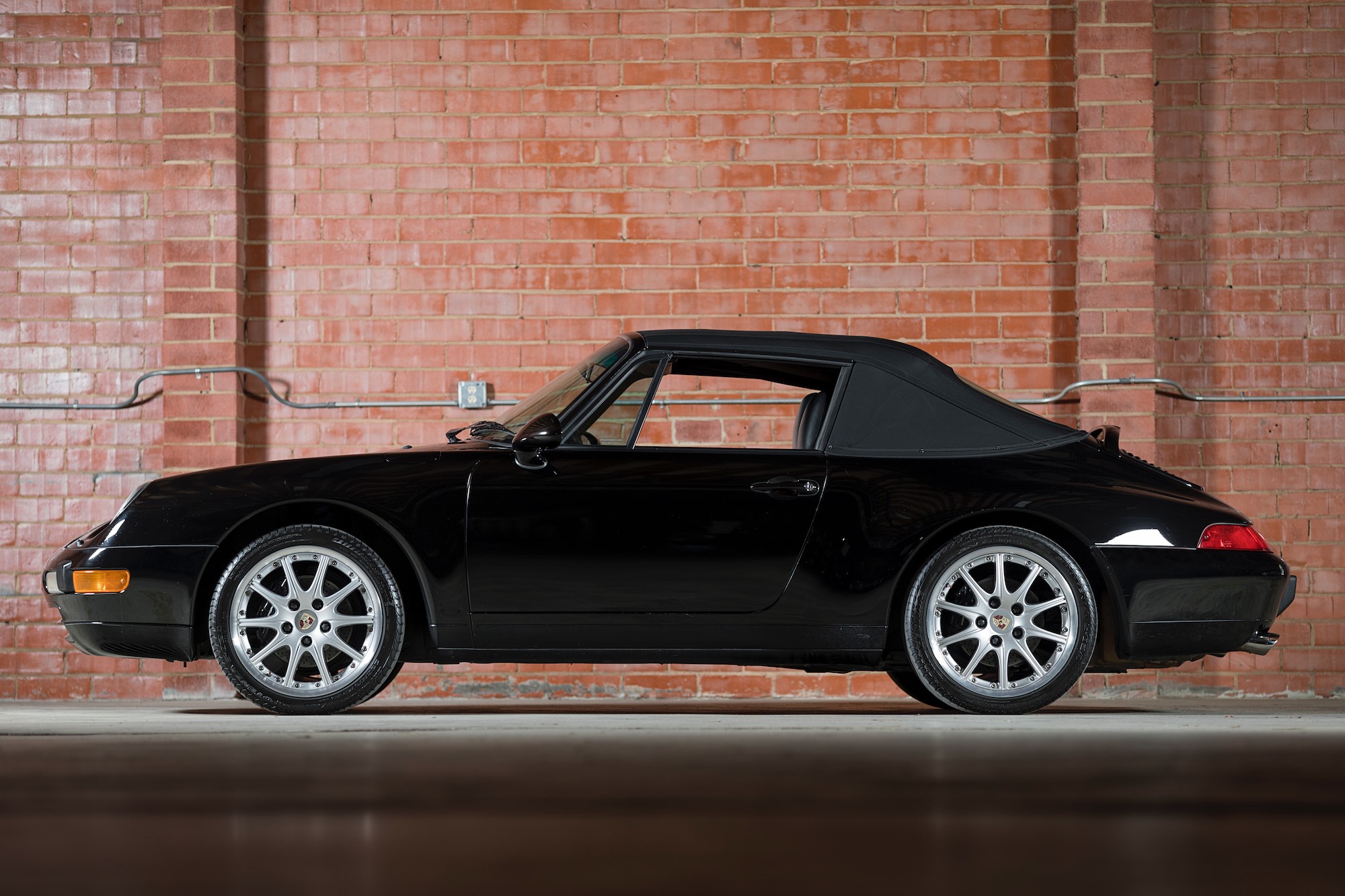 The stock 17″ wheels have been replaced with 18″ Porsche Sport Design versions wearing Bridgestone Potenza tires. The selling dealer notes a worn area on the soft top, a chip in one of the fog lamps, and touch-ups on the forward surfaces.