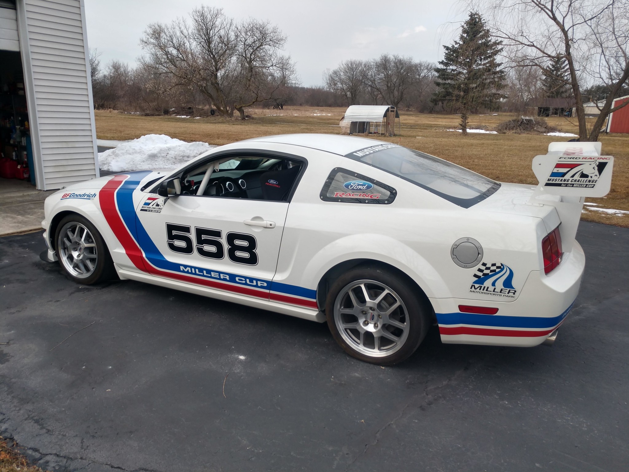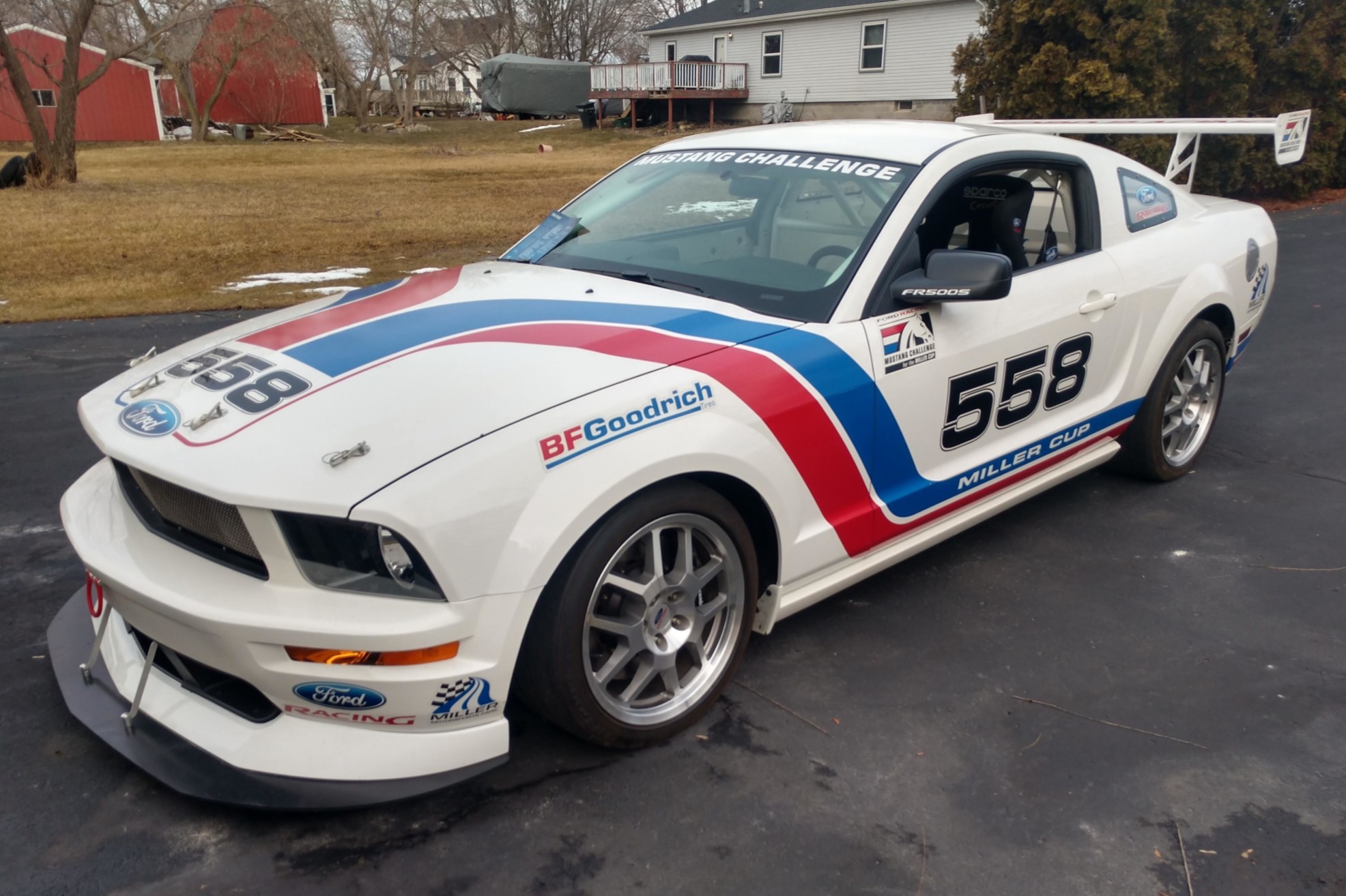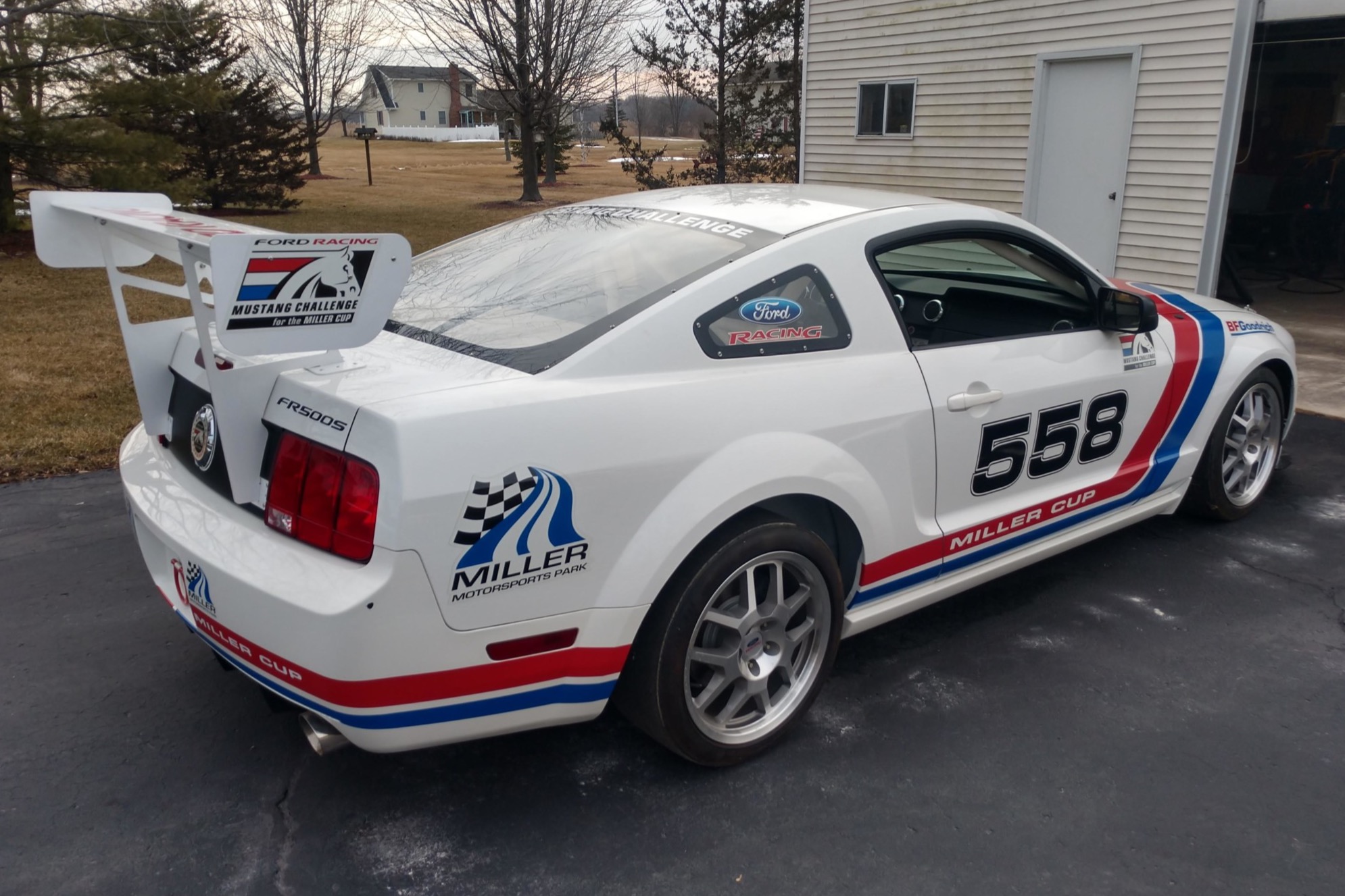 Ford Racing 18″ wheels are mounted with BFGoodrich g-Force R1 tires measuring 245/40 all around. Suspension includes two-way adjustable dampers at each corner as well as sway bars with three-position adjustability up front. Braking is provided by four-piston Brembo calipers and 14″ slotted rotors up front and a four-wheel anti-lock system calibrated for track use.