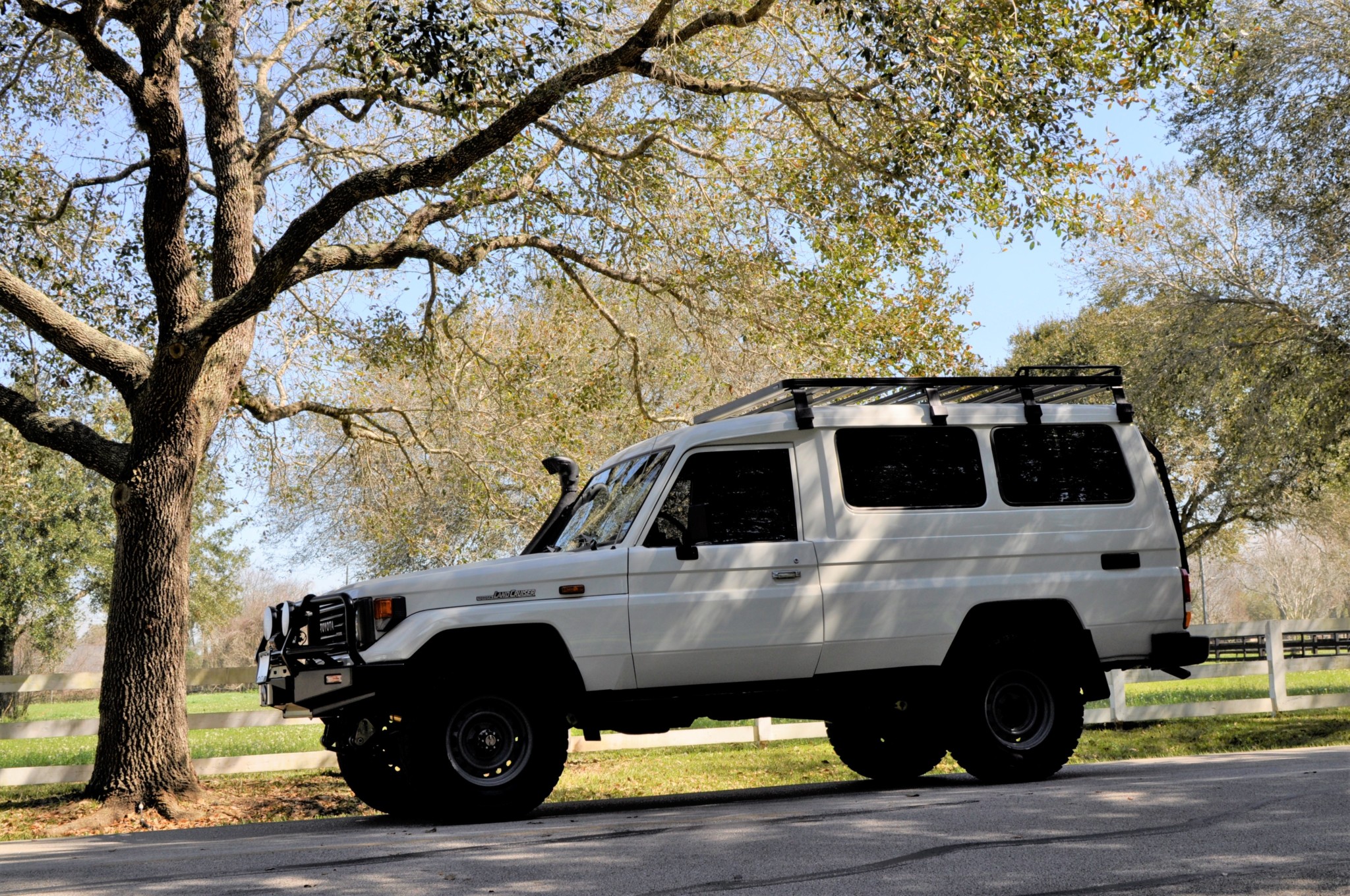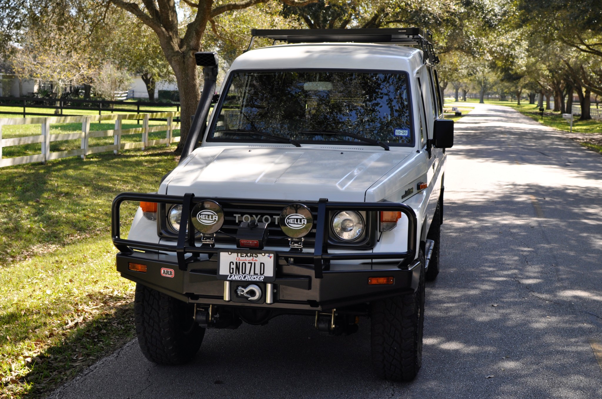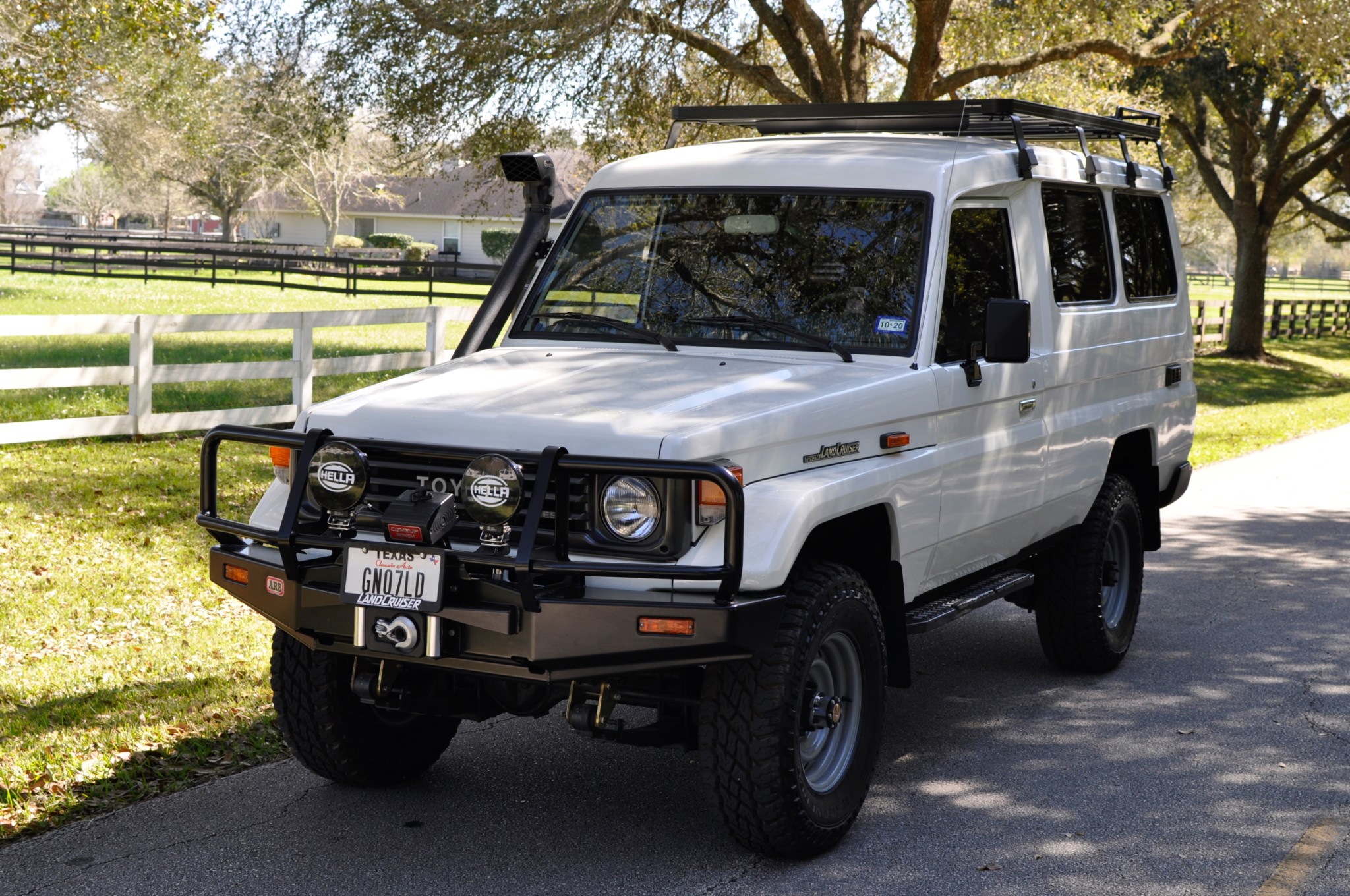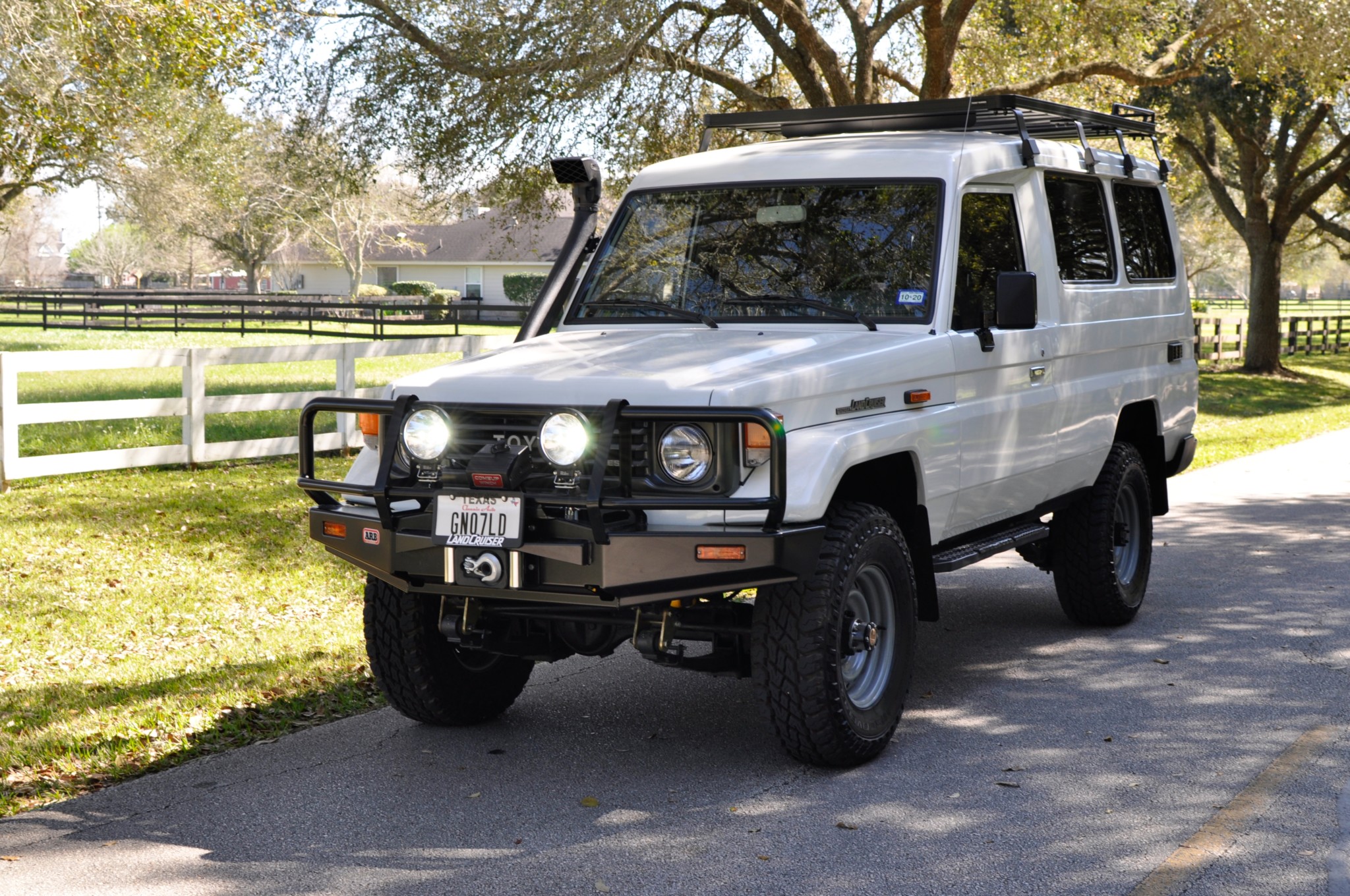 Additional equipment includes a snorkel, a Front Runner roof rack and rear ladder, and side steps. Gray steel 16″ NATO wheels custom made by Stockton Wheel Service wear 255/85 Cooper Discoverer S/T Maxx tires, and a matching spare is mounted under a vinyl cover at the rear. Free-wheeling Aisin front hubs have been installed along with Old Man Emu suspension components. A list from the seller showing parts replaced or added can be found in the gallery.