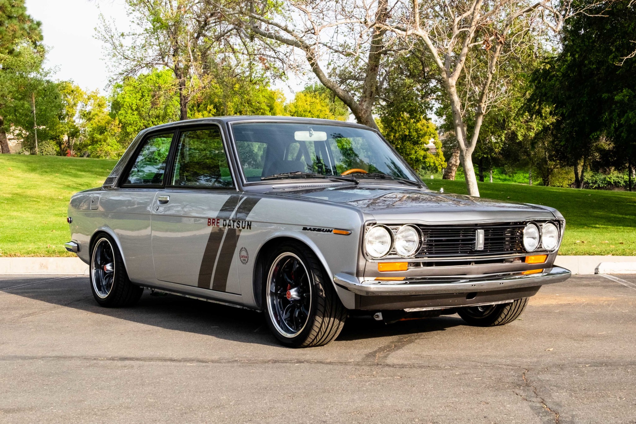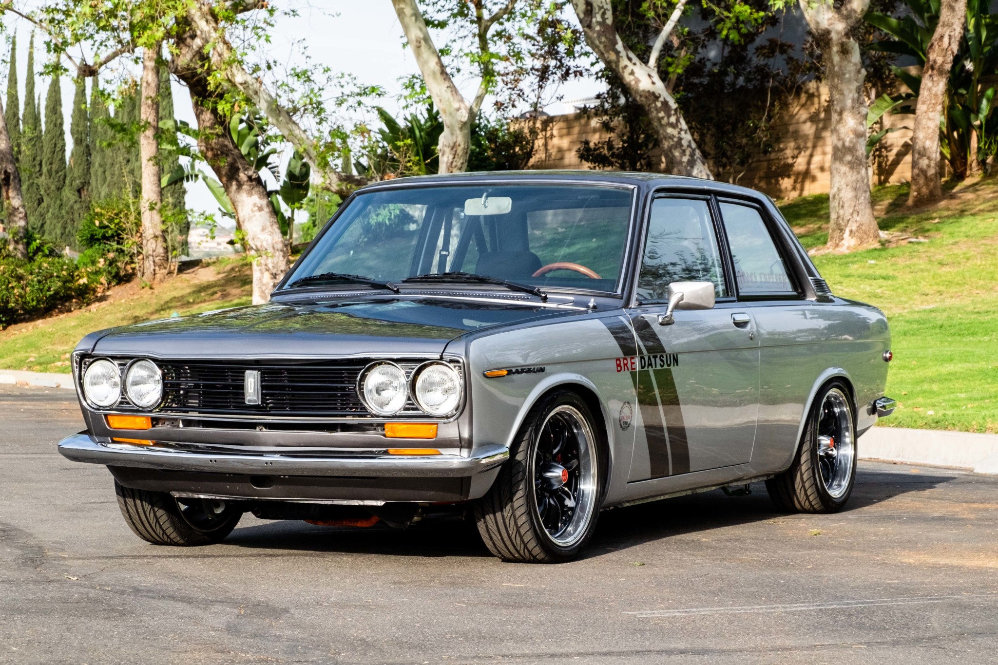 Black 16″ multi-piece Watanabe wheels wear polished outer lips and Yokohama S.drive tires in sizes 195/40 up front and 215/40 at the rear. The braking system has been modified with 280ZX front rotors paired with four-piston Wilwood calipers as well as S13 rear calipers and rotors. A B210 brake booster and 280ZX master cylinder have also been added in conjunction with replacement stainless-steel brake lines and a Wilwood proportioning valve. Modifications to the suspension include adjustable front Ground Control coilovers with Eibach springs with 280ZX front strut assemblies, Tein camber plates, and adjustable control arms. Troy Ermish Racing rear coilovers, an adjustable Datsport rear suspension crossmember, and larger sway bars have also been fitted.