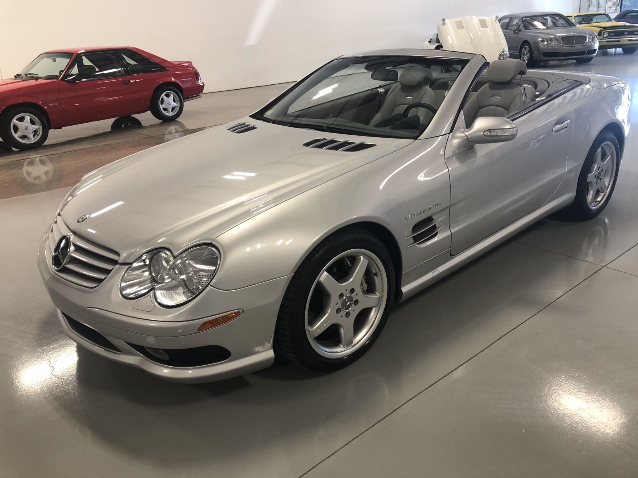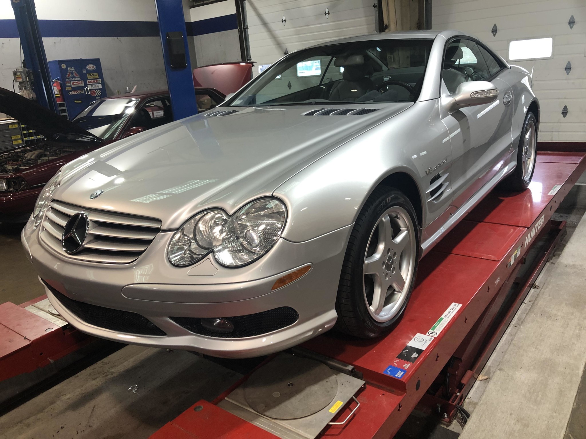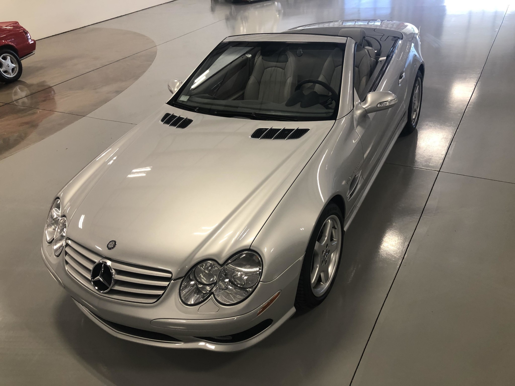 Five-spoke 18″ AMG wheels are wrapped in ZR-rated Pirelli tires sized 255/40 on the front and 285/35 out back. The SL55 AMG came standard with Active Body Control, and the braking system features cross-drilled and vented rotors with eight-piston front calipers.