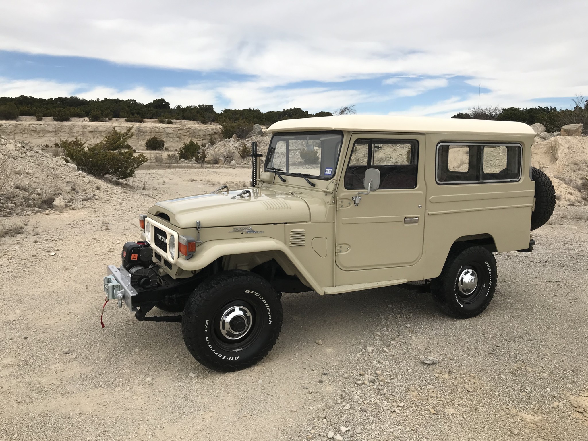 The steel wheels are painted black and wear polished hub caps. The seller states that BFGoodrich All-Terrain T/A tires were fitted during his ownership, including on the swing–out spare mounted at the rear.
