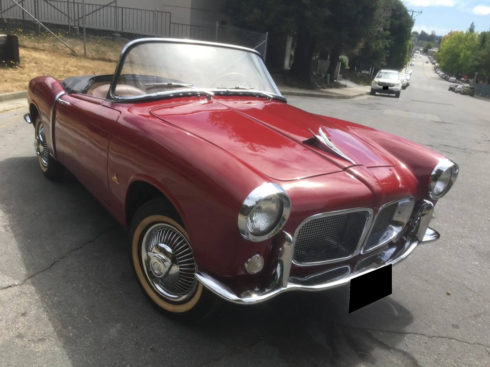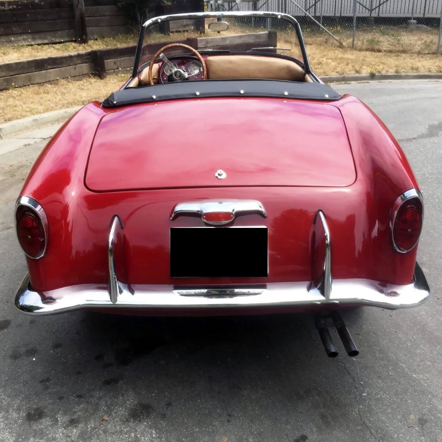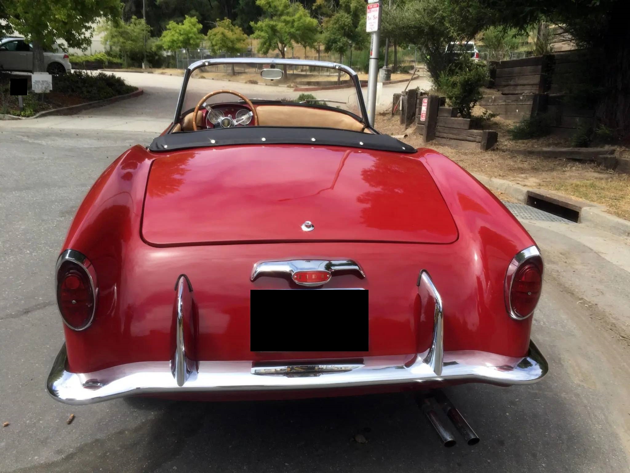 Exterior features include a split mesh-patterned grille, a prominent Fiat-branded hood ornament, and Vetture Speciali badging. The tan soft top has tears in the fabric and is shown raised in the gallery below. Body-colored 14″ steel wheels are equipped with wire hubcaps and are fitted with a set of older Premium Sportway whitewall tires. A matching spare is stored in the trunk.