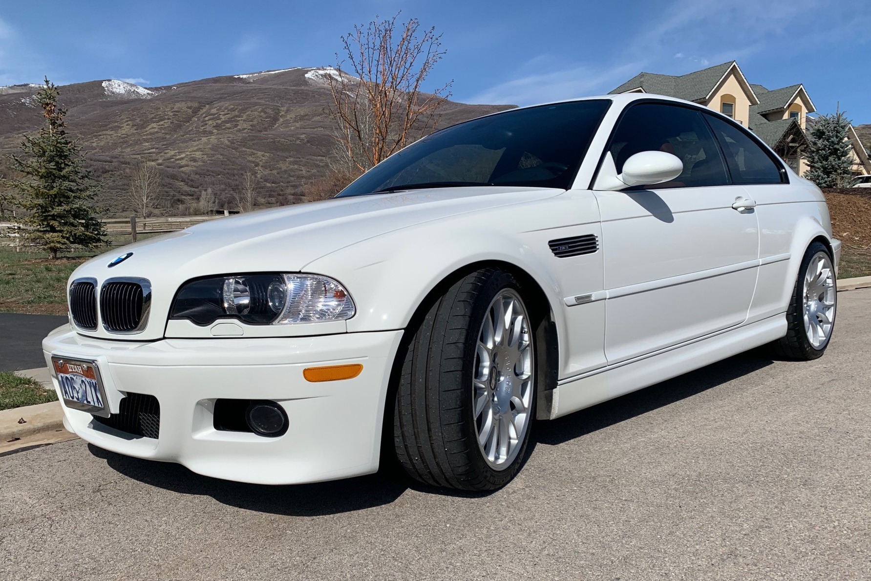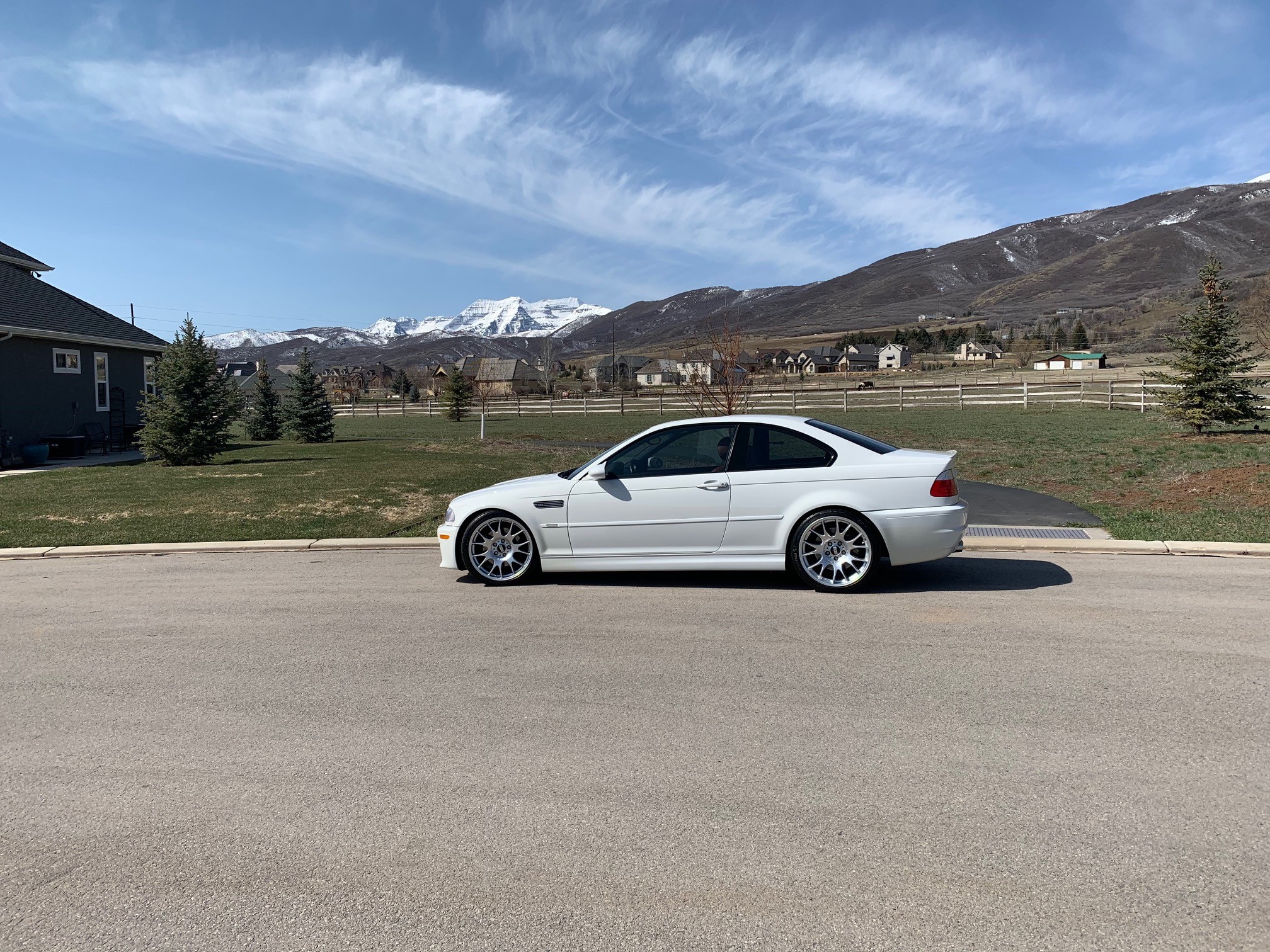 19″ BBS CH wheels are mounted with staggered Michelin Pilot Sport tires. A Ground Control suspension kit and a carbon-fiber front strut brace have been added, and braking is handled by slotted and ventilated rotors. The factory 18″ wheels are included in the sale along with the removed factory suspension components.
