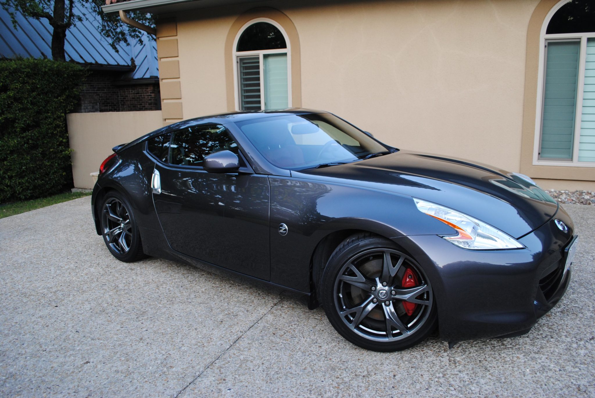 RAYS 19″ forged wheels wear a Smoke finish and are wrapped with staggered-width Bridgestone Potenza tires measuring 245/40 in front and 275/35 out back. The Sport package included four-piston front and two-piston rear Akebono brakes with red-painted calipers. Black splash guards have been added behind the rear wheels.