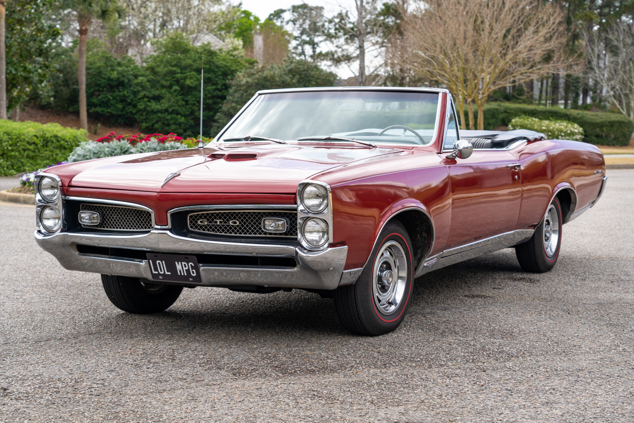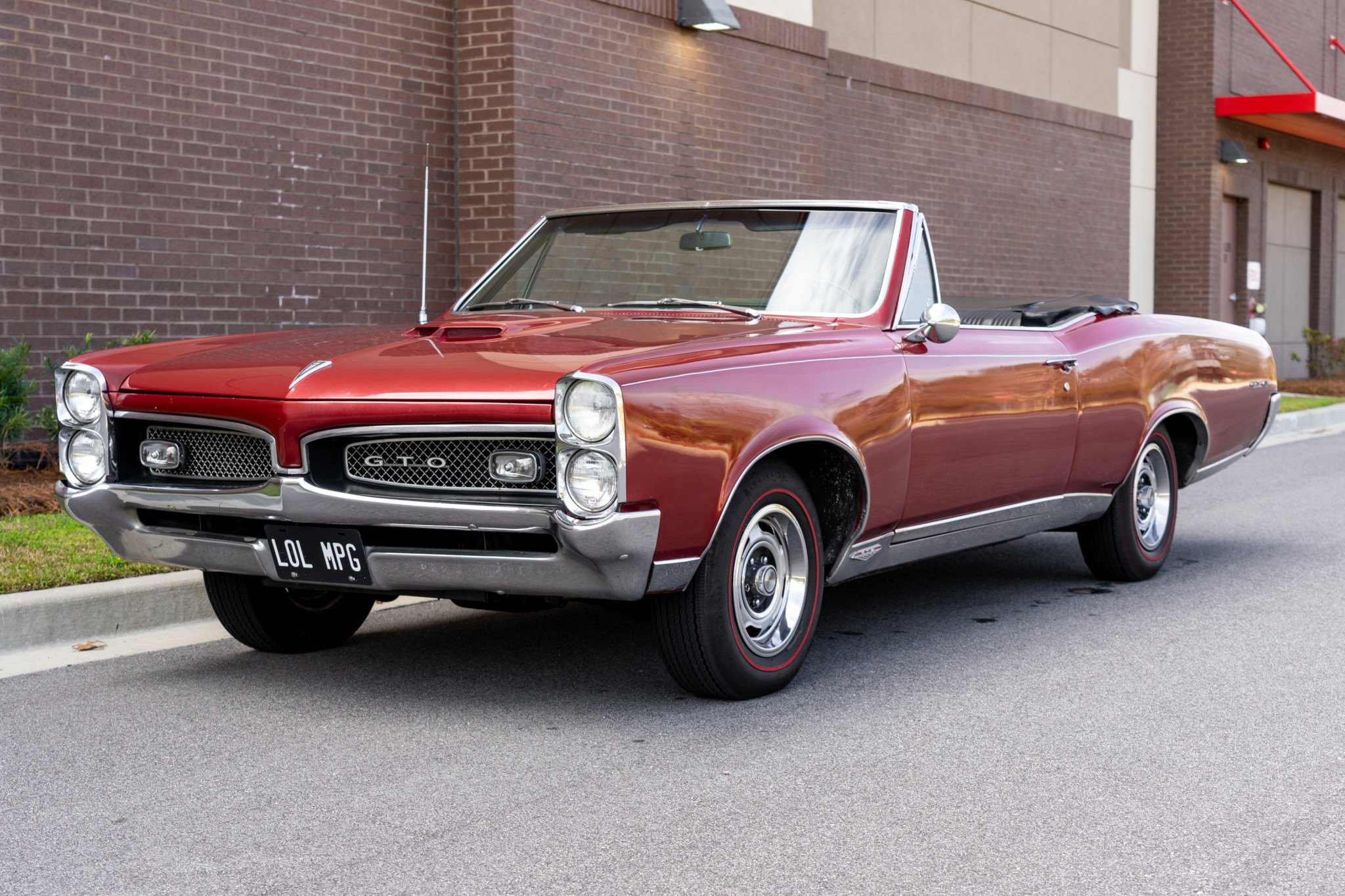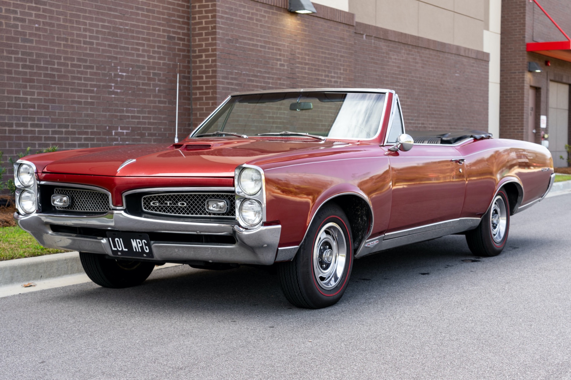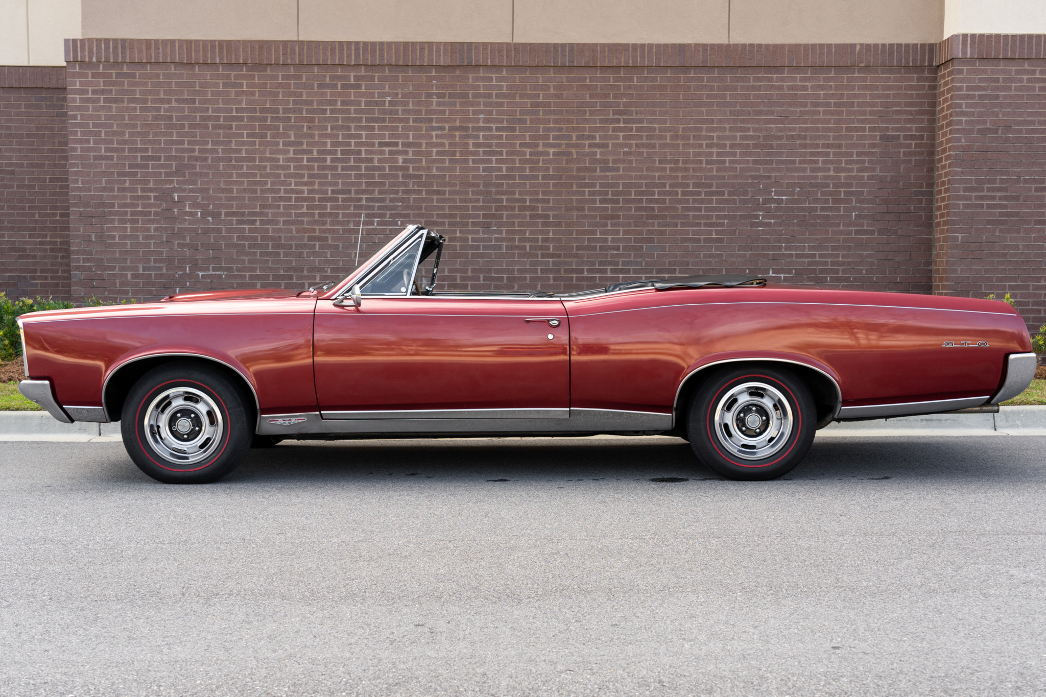 Rally I steel wheels measure 14″ in diameter and are wrapped in Firestone Super Sports Wide Oval redline tires. The front drum brakes have been converted to discs.