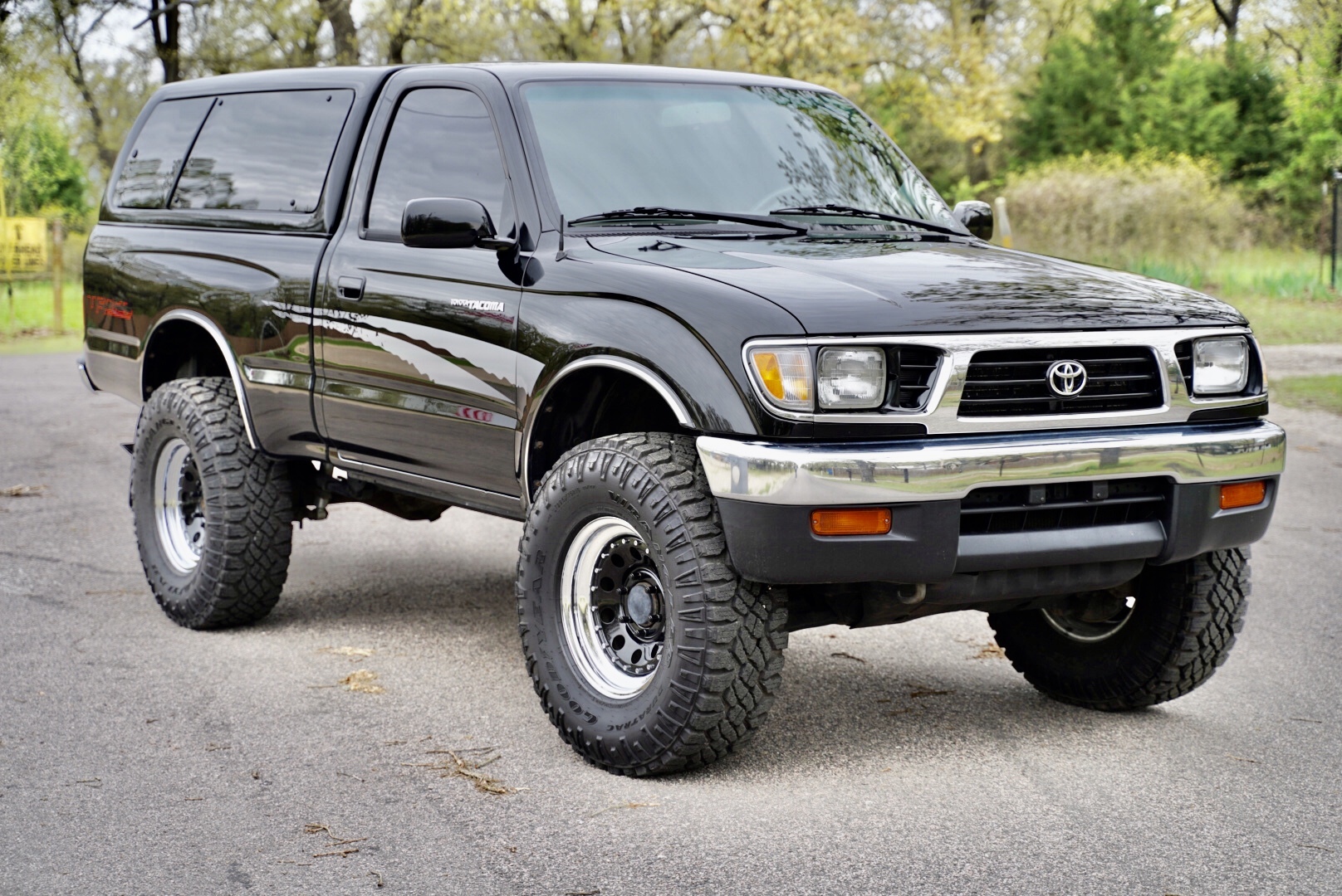 16″ wheels feature a polished lip and wear 285/75 Goodyear Wrangler DuraTrac tires recently installed by the seller. The suspension is said to be modified with Bilstein 5100 adjustable shocks and replacement springs, and additional work performed included replacement of the ball joints, bushings, and brakes. The seller states that the emergency brake needs adjustment.