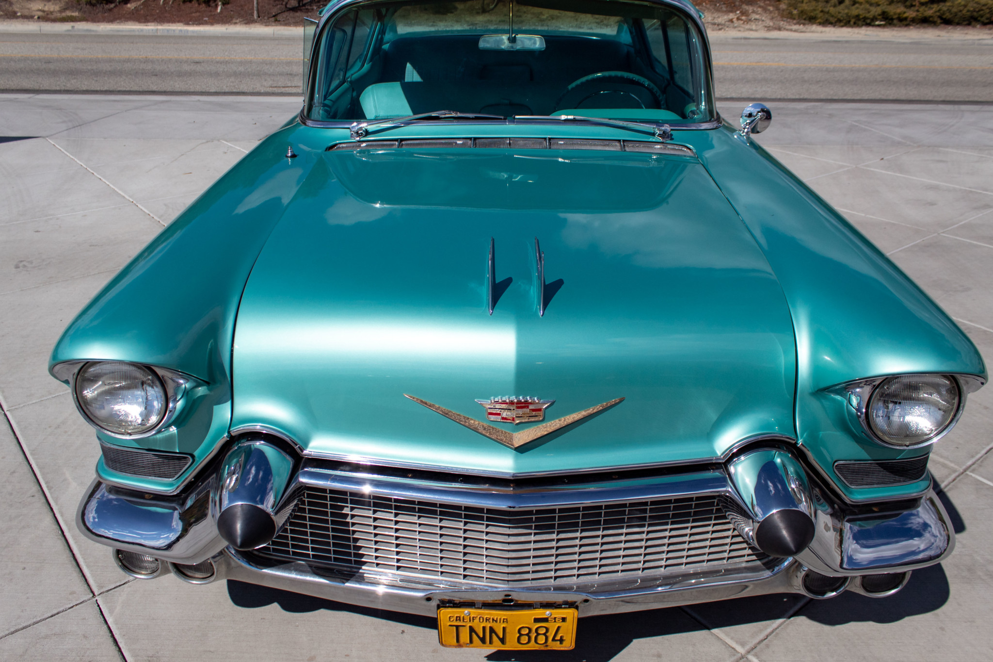 Steel wheels wear full covers and wide-whitewall tires. A spare is located under a carpeted cover in the trunk. The condition of the paintwork and trim is shown up close in the gallery below.
