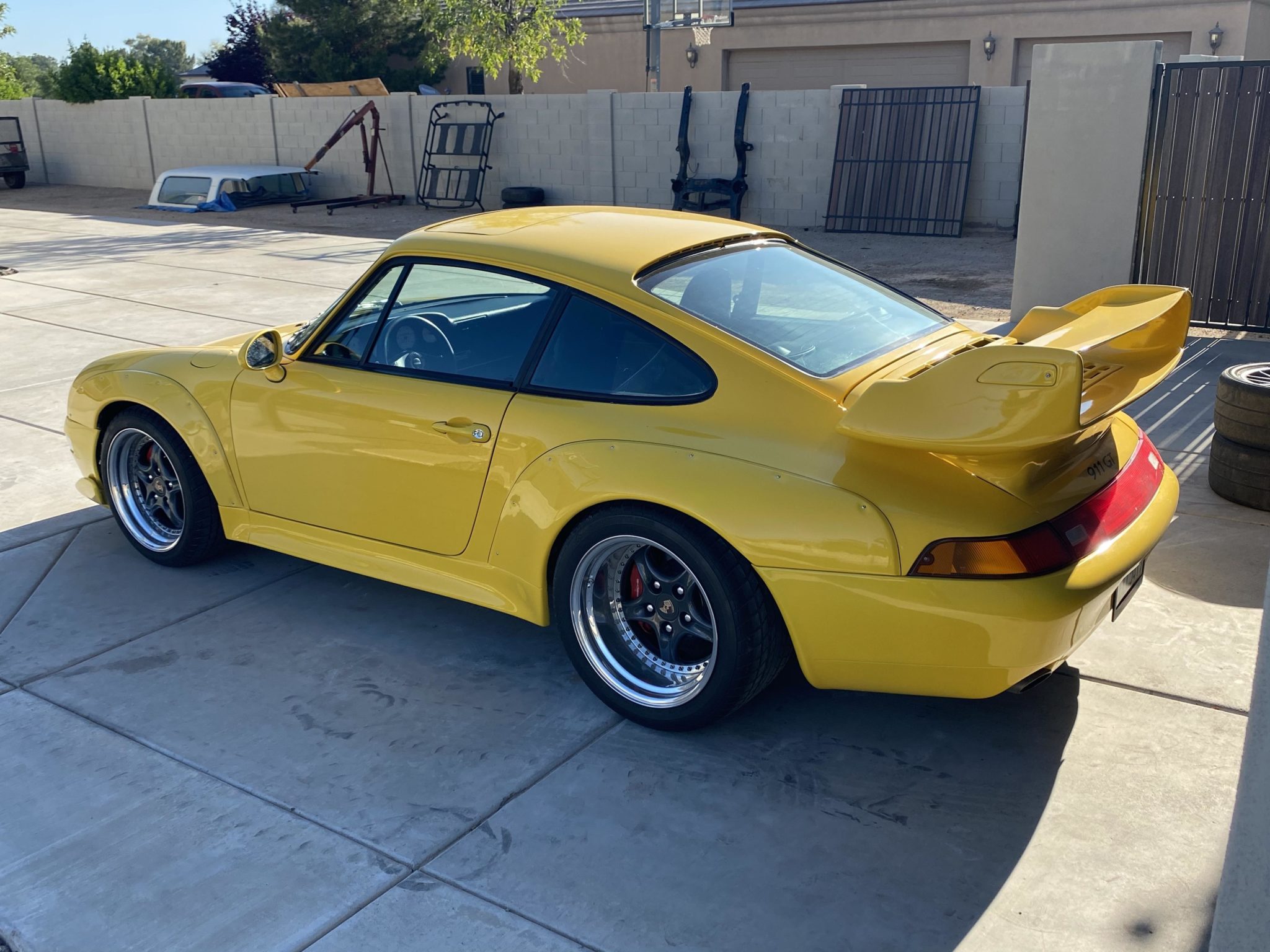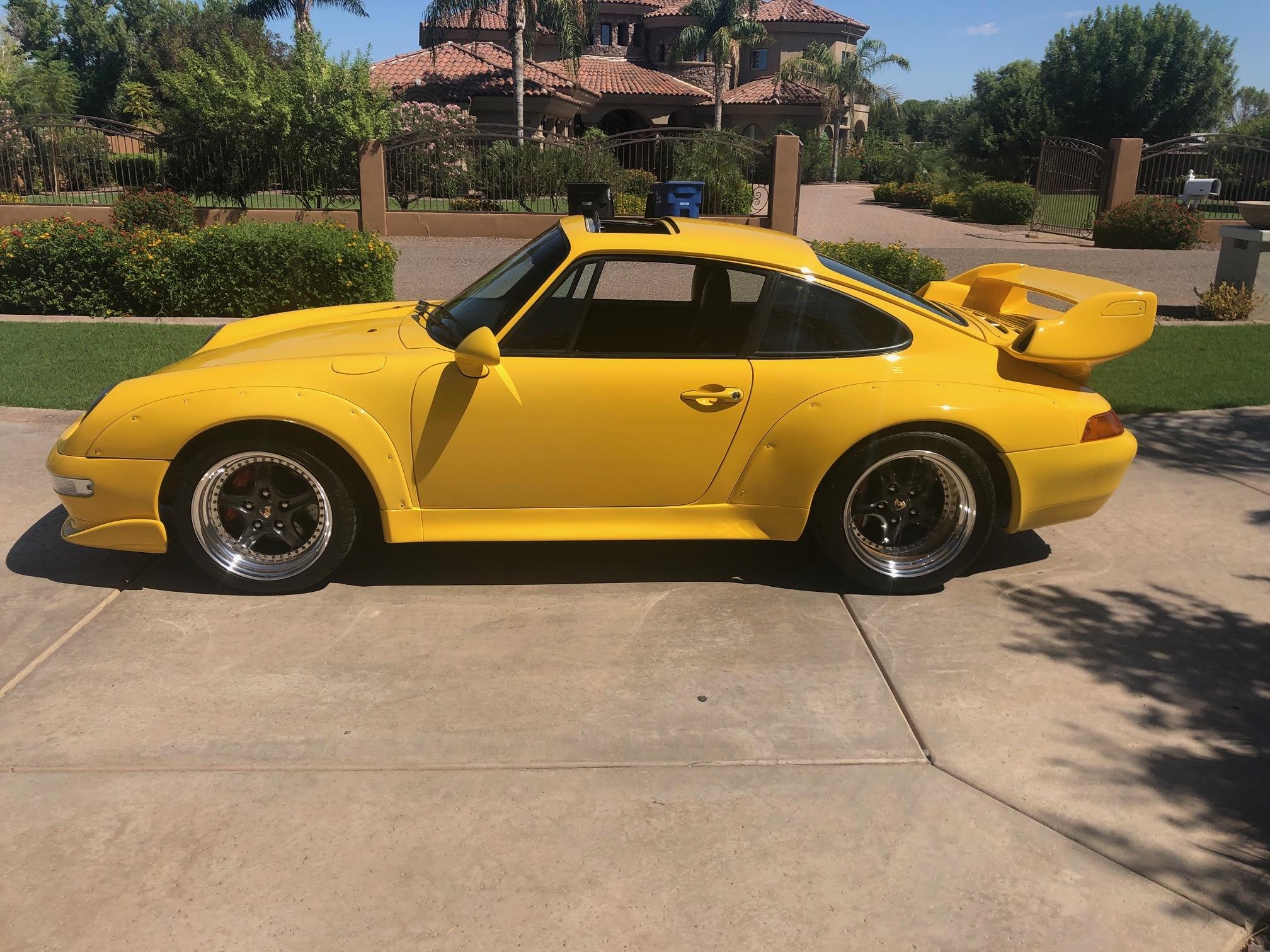 17″ Speedline multi-piece wheels with graphite-finished centers wear Sumitomo HTR 40Z tires measuring 245/45 up front and 315/35 out back. Additional modifications are said to include front and rear 996 Turbo brake calipers and rotors, variable-rate rear springs, and Rebel Racing front monoball upper strut mounts. The seller states that an alignment was recently performed.
