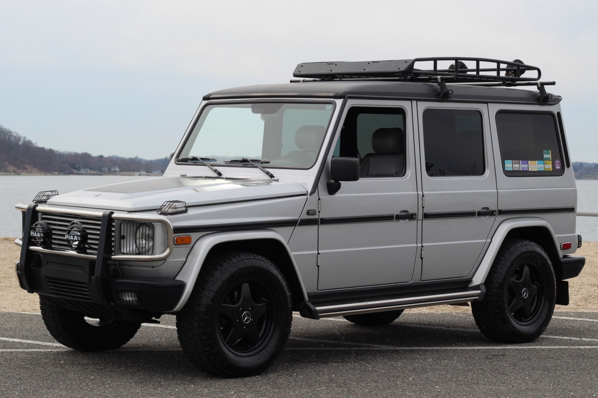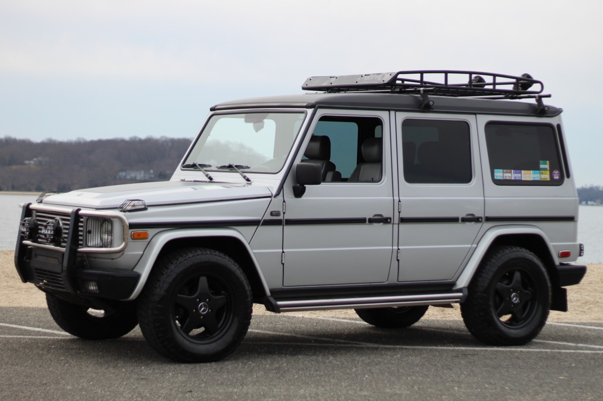 Black 18″ AMG wheels are wrapped in Nitto Terra Grappler G2 tires. A BFGoodrich Mud-Terrain tire is mounted on the rear hatch with a carrier storage compartment. The factory wheel and tire carrier are included in the sale.