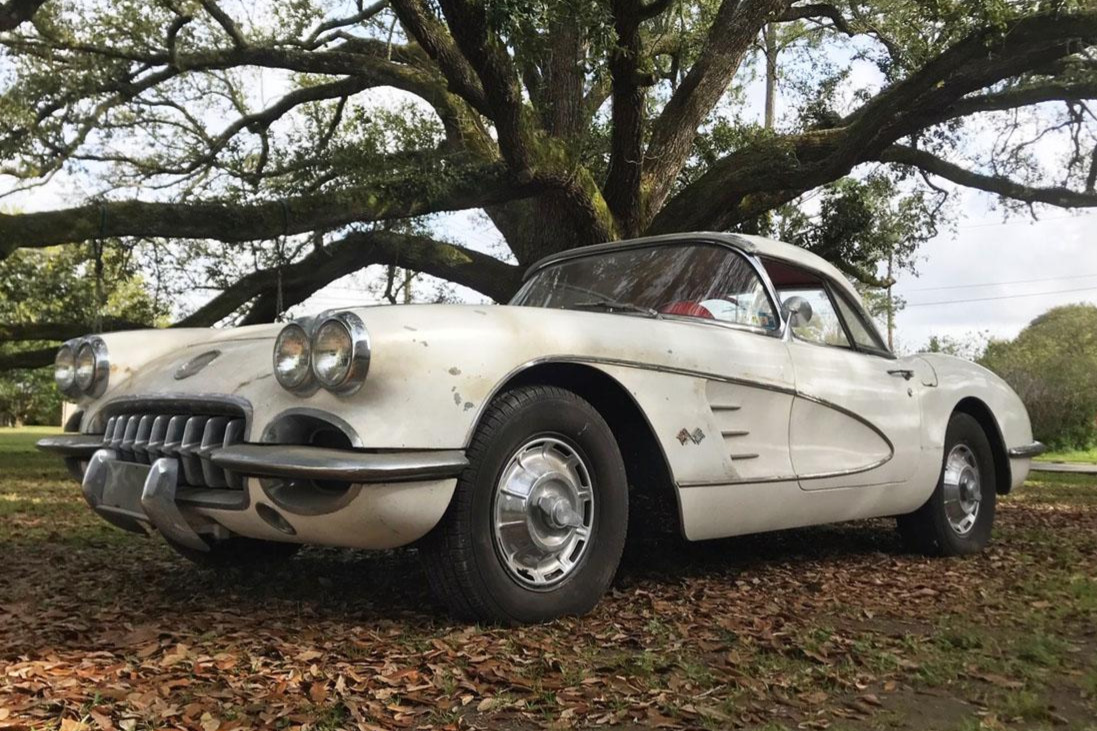 Prior to the auction, the white soft top had not been raised in at least 15 years according to the seller. Black powder-coated 15″ steel wheels feature factory-style faux knock-off covers and wear new BFGoodrich Radial T/A tires. New leaf springs, shocks, suspension bushings, and drum brake components were installed in 2015.