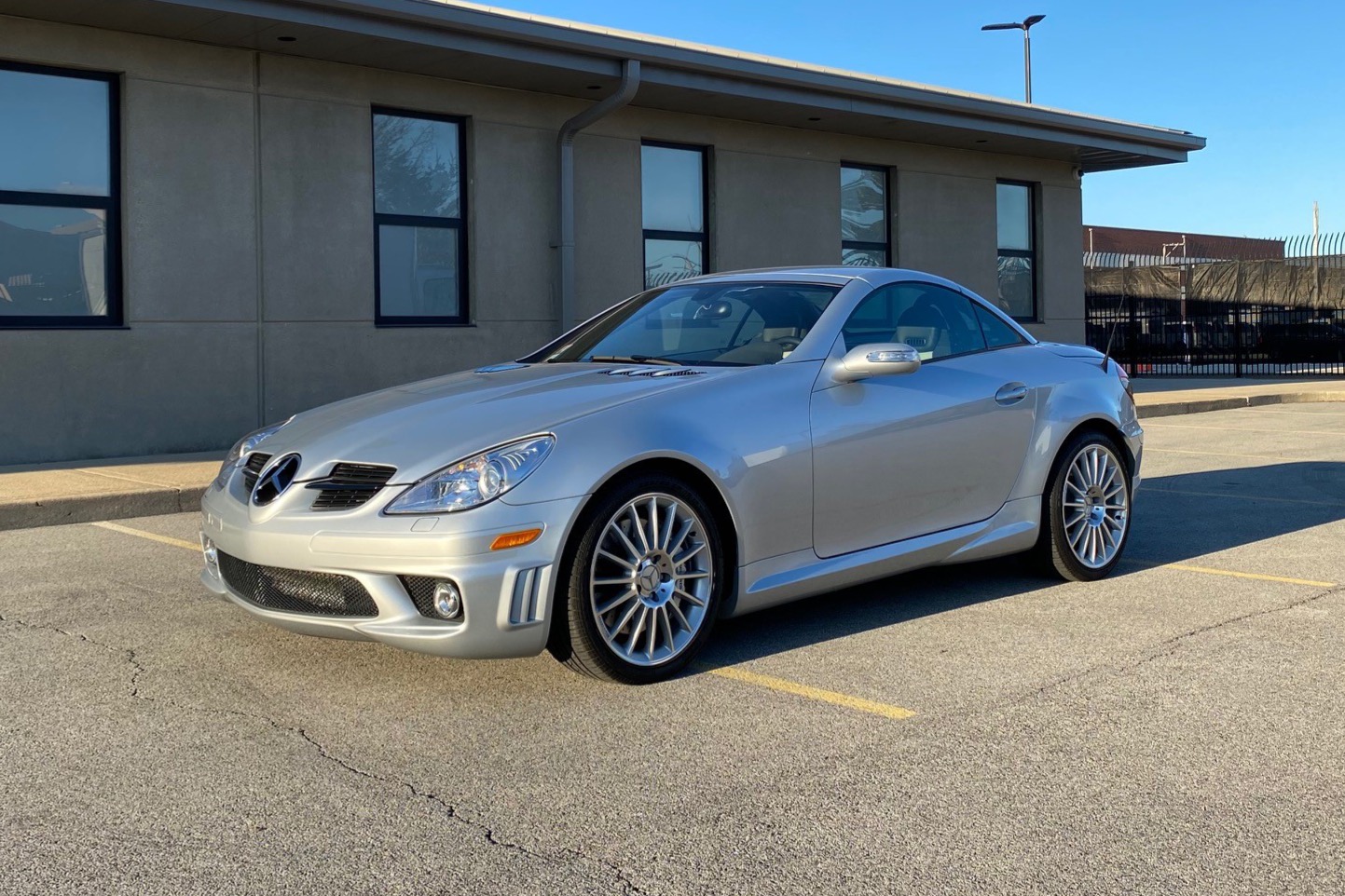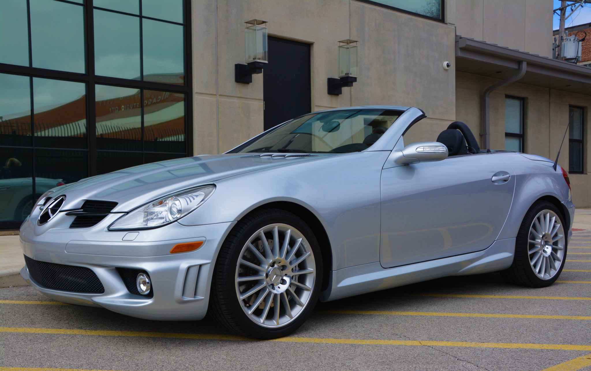 The SLK55 came equipped with a lowered, sport-tuned suspension with stiffer springs, shocks, and sway bars, as well as six-piston front calipers and four-piston rear calipers with drilled and slotted rotors. AMG multi-spoke 18″ wheels wear Pirelli PZero Rosso tires measuring 225/40 up front and 245/35 out back.