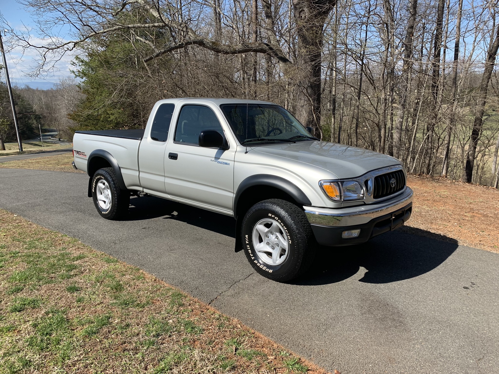 Factory 16″ alloy wheels are shod with BFGoodrich Rugged Trail T/A tires measuring 265/70. The 2004 Tacoma came standard with power-assisted front disc and rear drum brakes with ABS, while the TRD Off Road package also included Bilstein shock absorbers. A spray-on liner has been added to the bed, and a black tonneau cover is included in the sale. An exterior walk-around video is provided here.