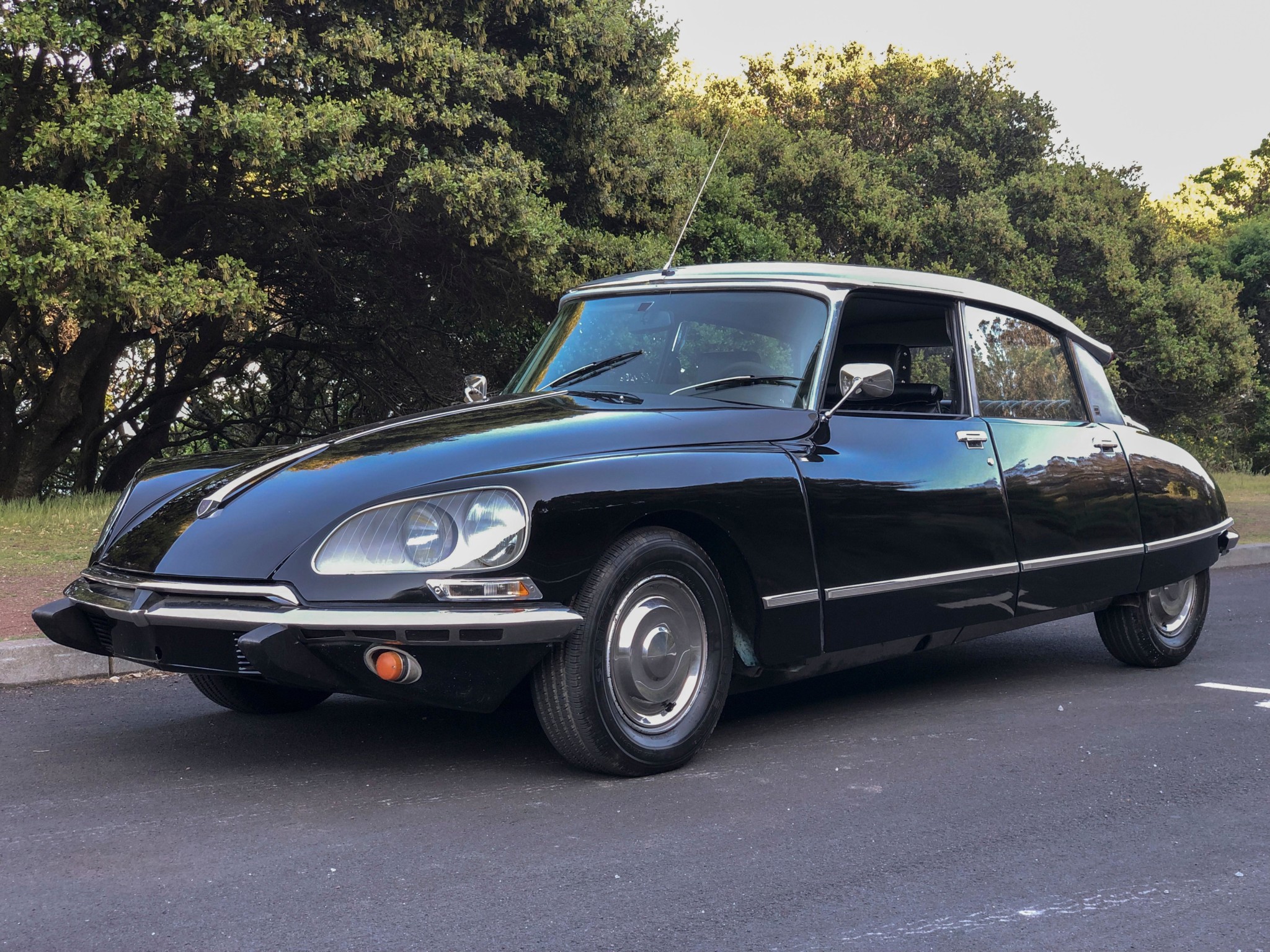 Steel wheels wear polished single-piece covers and older Michelin Symmetry tires. Photos illustrating the hydropneumatic suspension at various heights are provided in the gallery below.