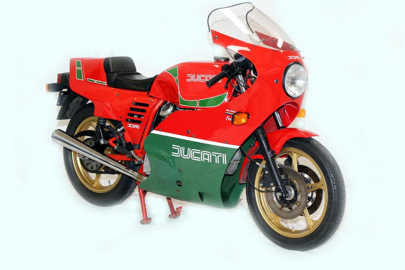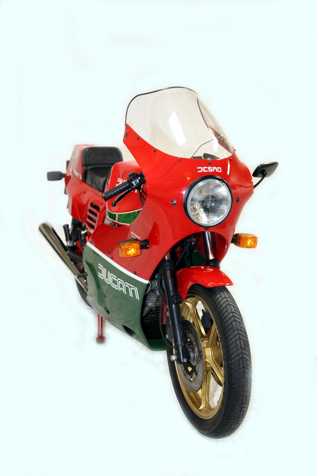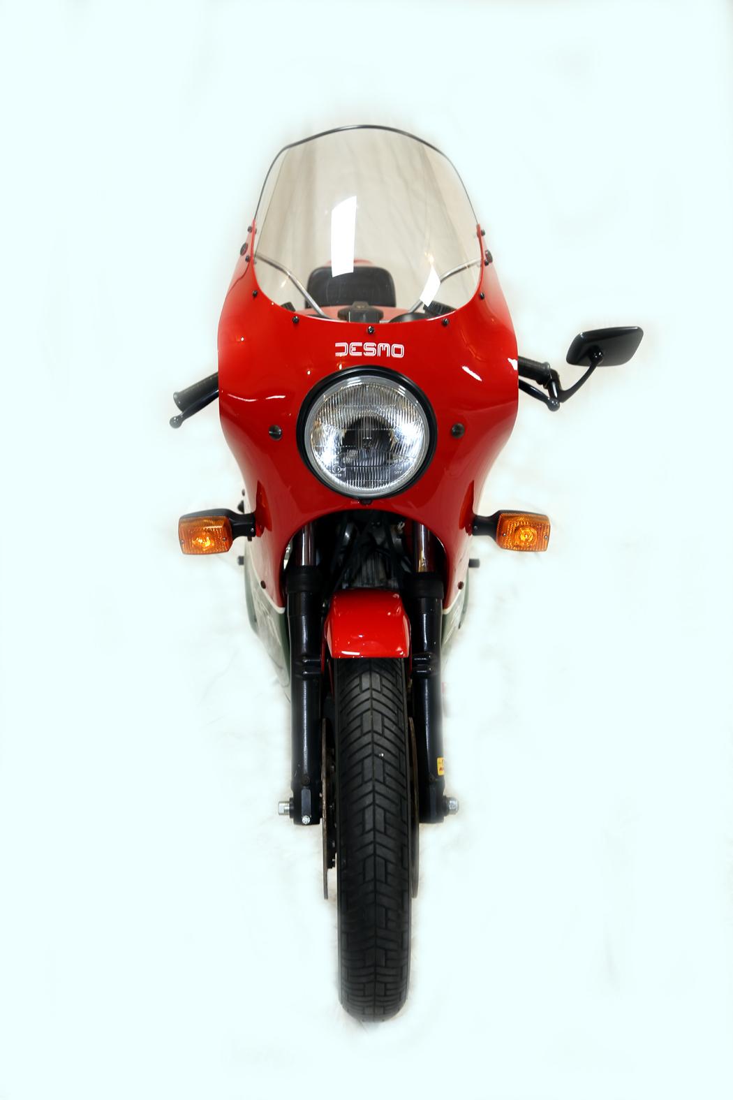 Equipment includes a clear plexiglass windscreen, adjustable Verlichi clip-on handlebars, and a solo seat with an embossed backrest. Five-spoke gold wheels, a Marzocchi fork and rear shocks, as well as Brembo triple-disc brakes also came fitted from the factory.
