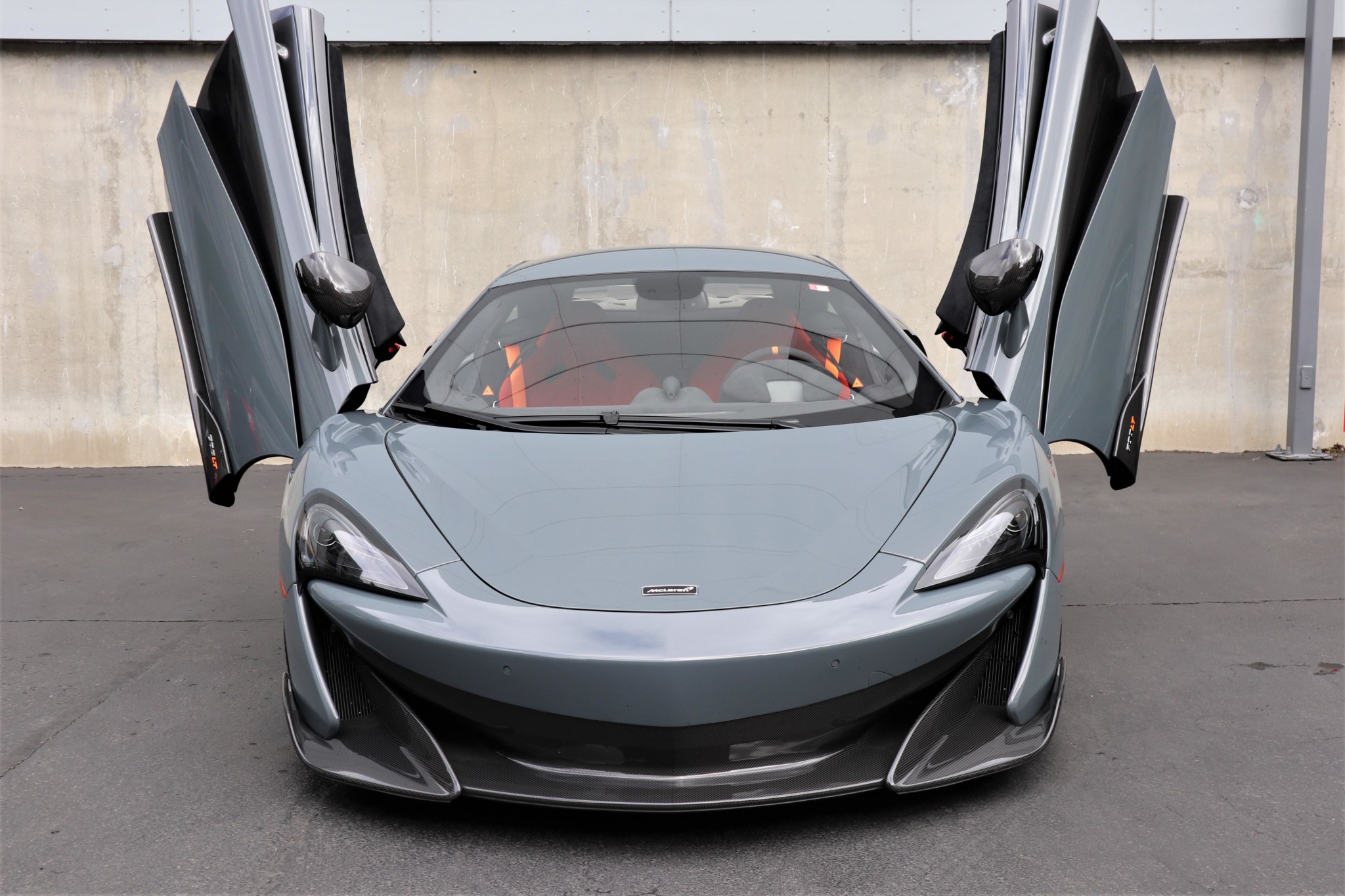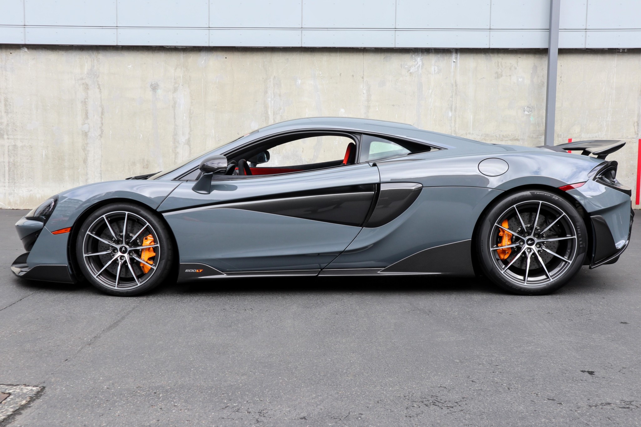 Compared with the 570S, the 600LT features a 10mm wider track, a lower ride height, and stiffer anti-roll bars, while front spring rates are firmer by 13 percent and the rears by 34 percent. Standard carbon-ceramic brake rotors are gripped by optional orange-painted calipers, six-piston at the front and four-piston at the rear. The 10-spoke wheels—19″ up front and 20″ out back—have a Satin Raw Metal finish and wear factory-fitment Pirelli Trofeo R tires.