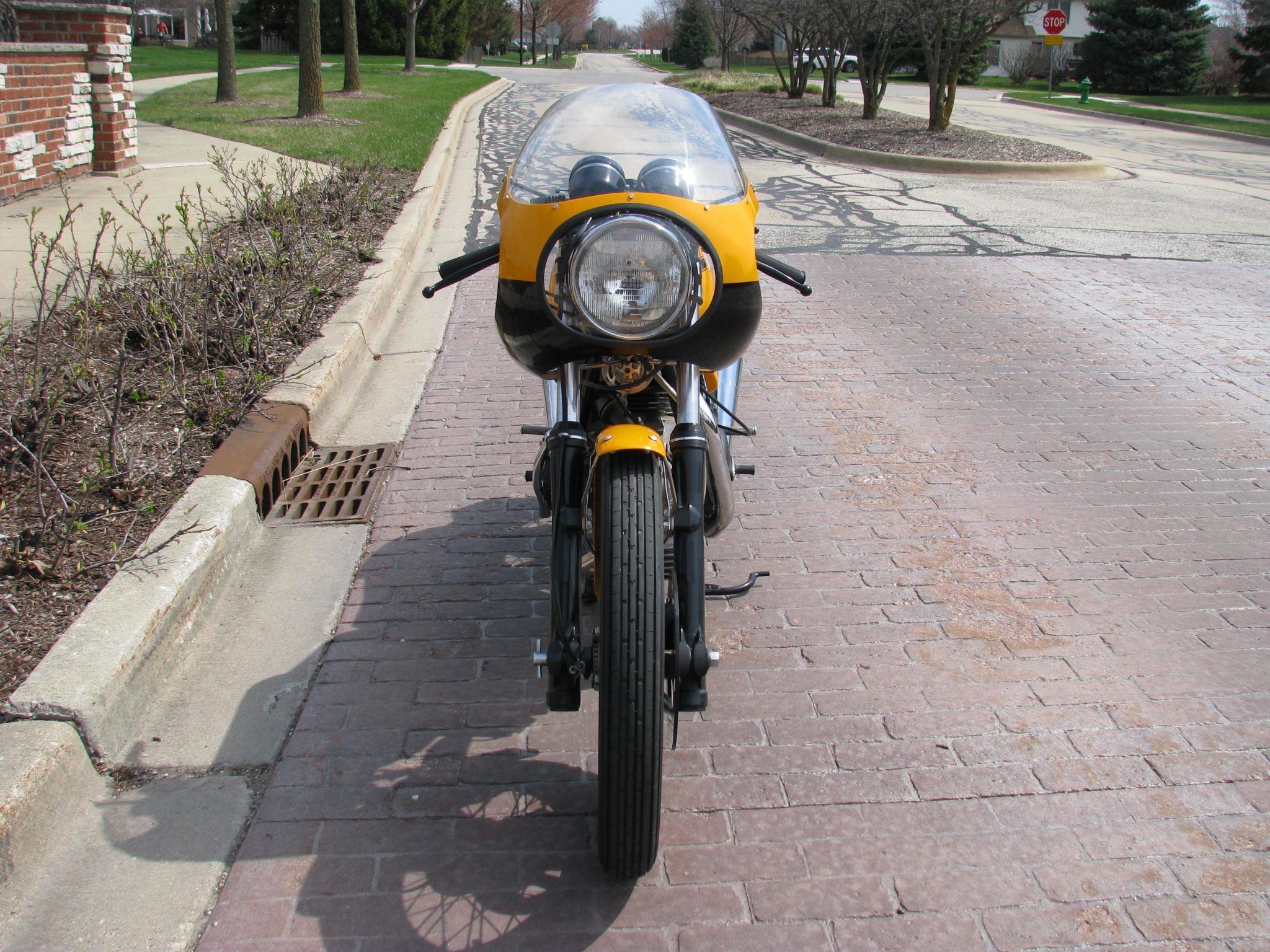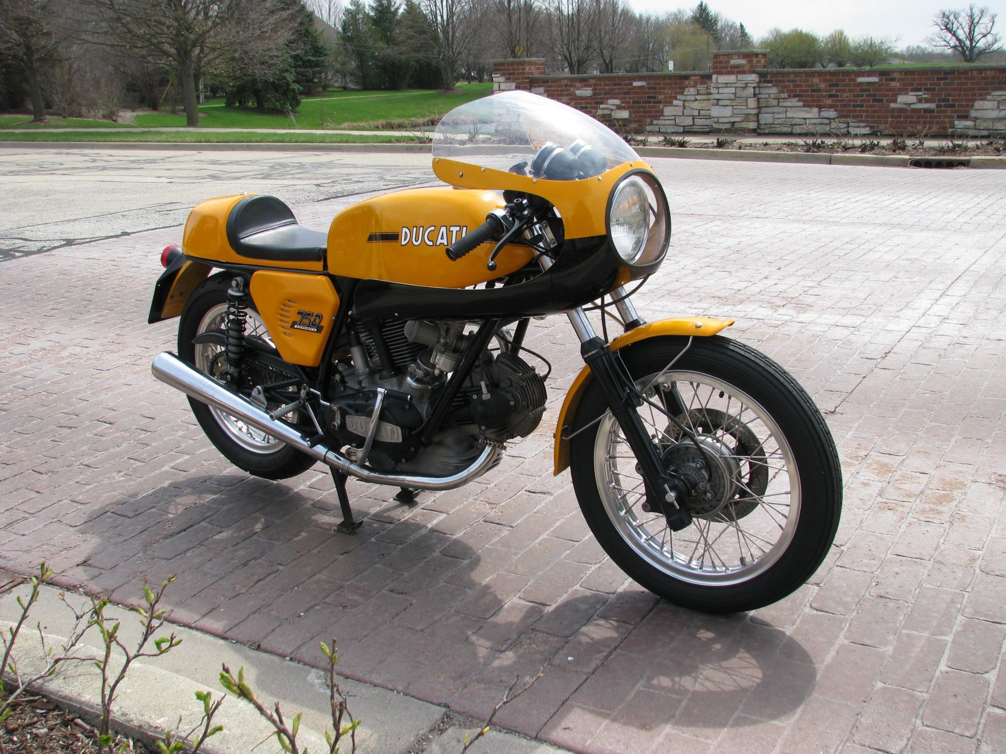 Borrani Record aluminum rims measure 19” front and 18” rear, and are mounted with Avon tires that should be replaced due to age according to the seller. The Marzocchi leading-axle fork features a single Lockheed brake caliper, which is said to have been rebuilt along with the Brembo master cylinder in 2020.