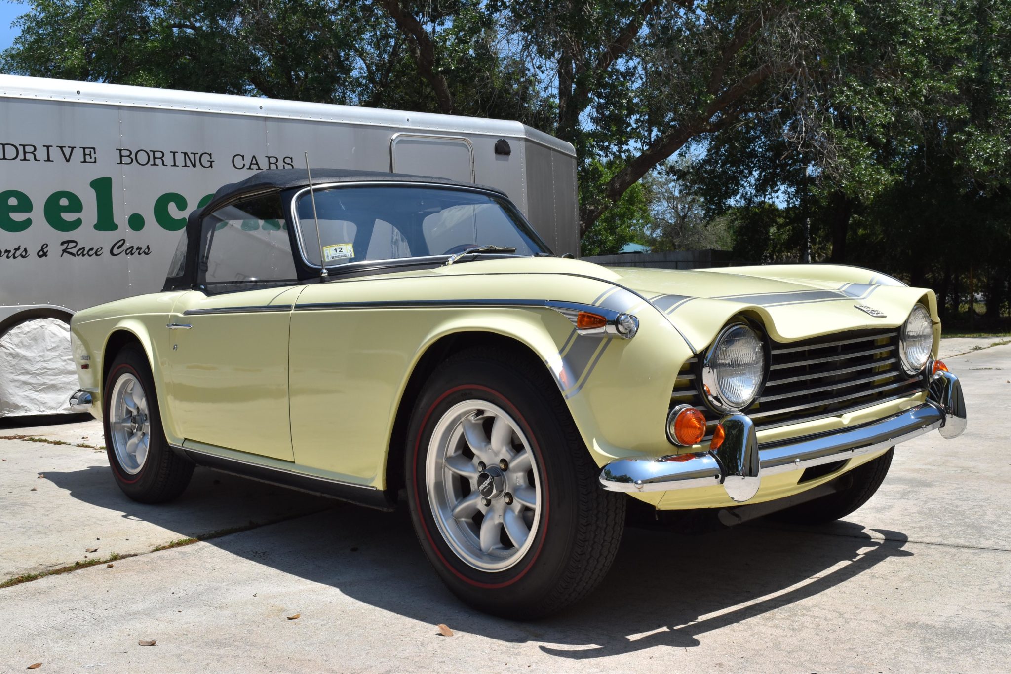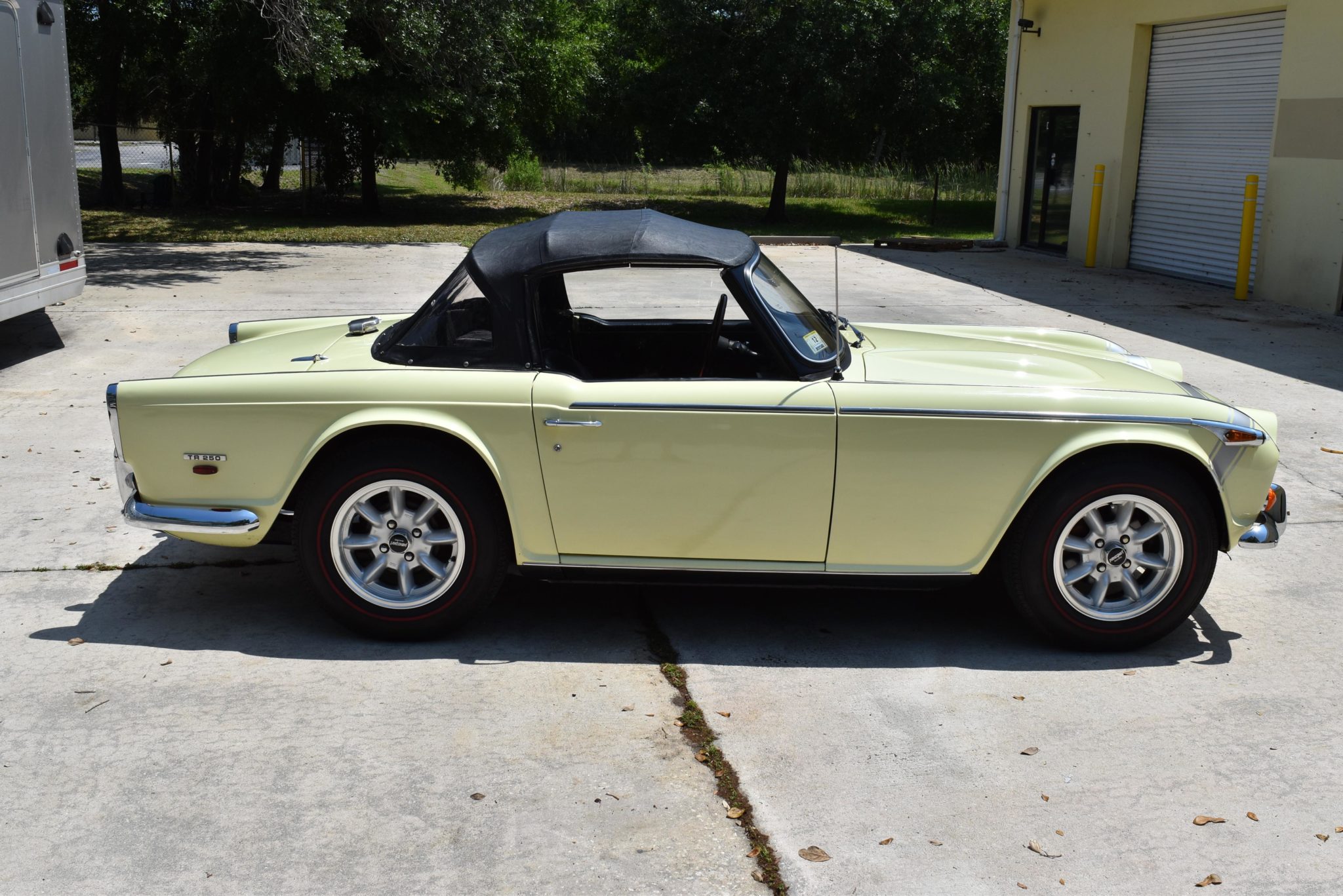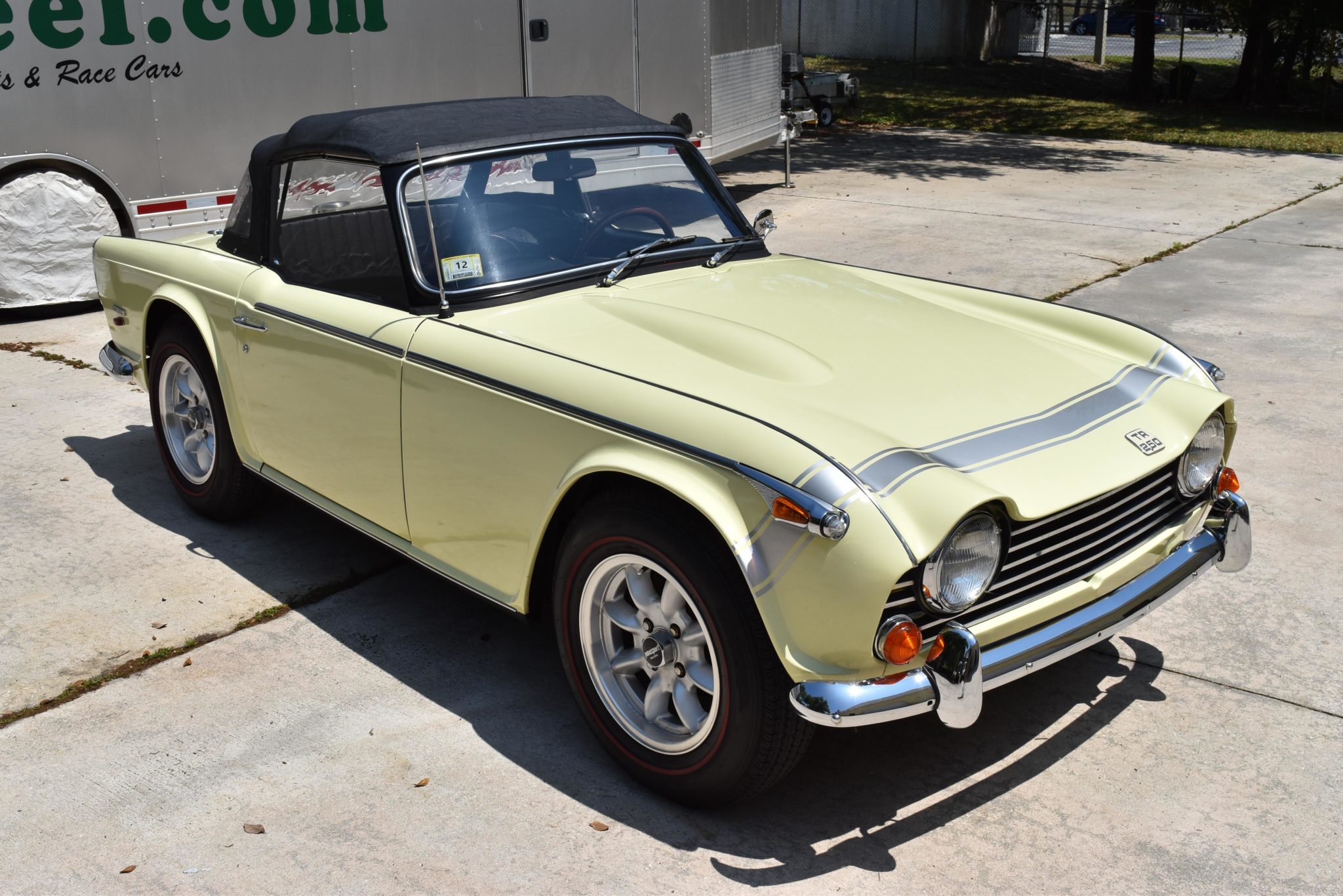 Panasport 15×6″ alloy wheels wear 185/15 Coker Classic redline radial tires, and aftermarket springs are said to have been fitted. Trim includes abbreviated chrome side spears and TR250 badges on the hood, decklid, and both rear quarter panels.