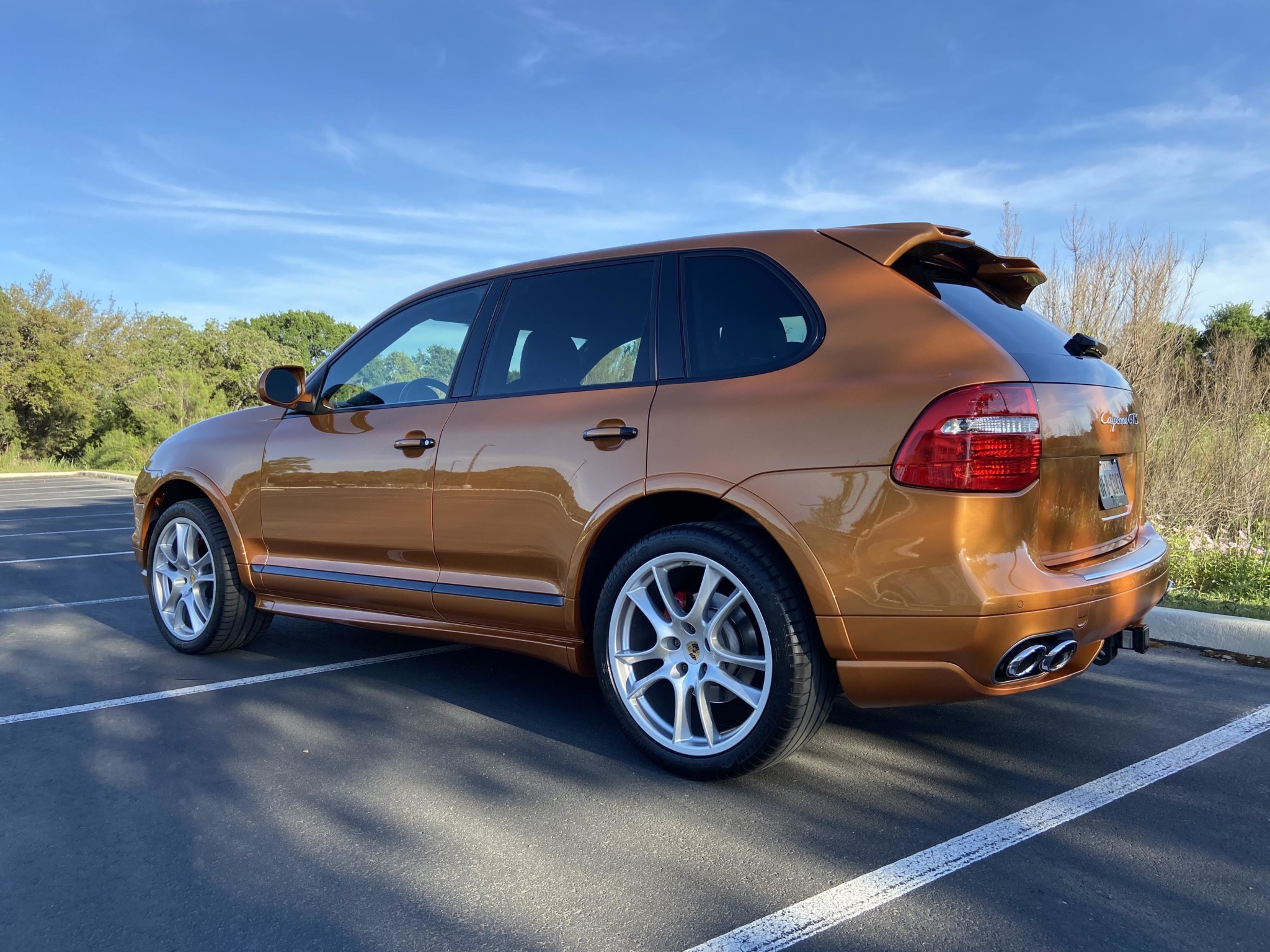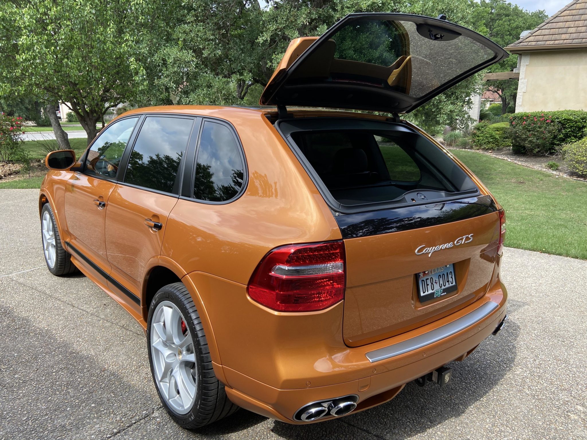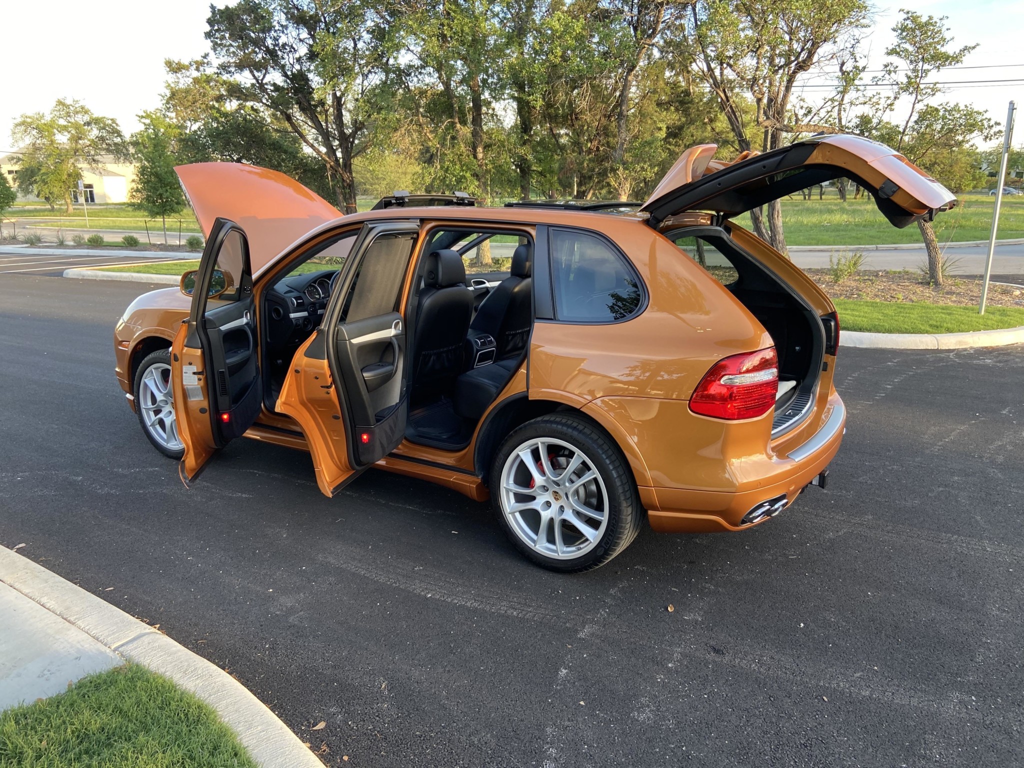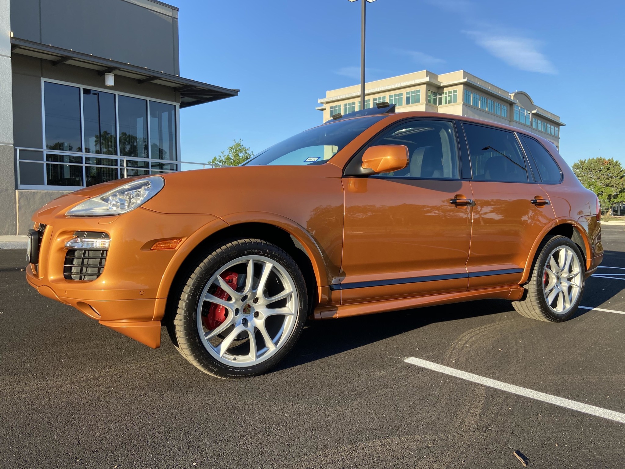 The GTS offered a lower ride height when compared with the standard Cayenne. This example rides on factory 21″ wheels wearing Michelin Latitude Sport tires with 2016 date codes. The car is equipped with Porsche Stability Management, air suspension, and red brake calipers. A stain is noted on the passenger-side rear door trim along with scratches on the wheels and faulty windshield washers.