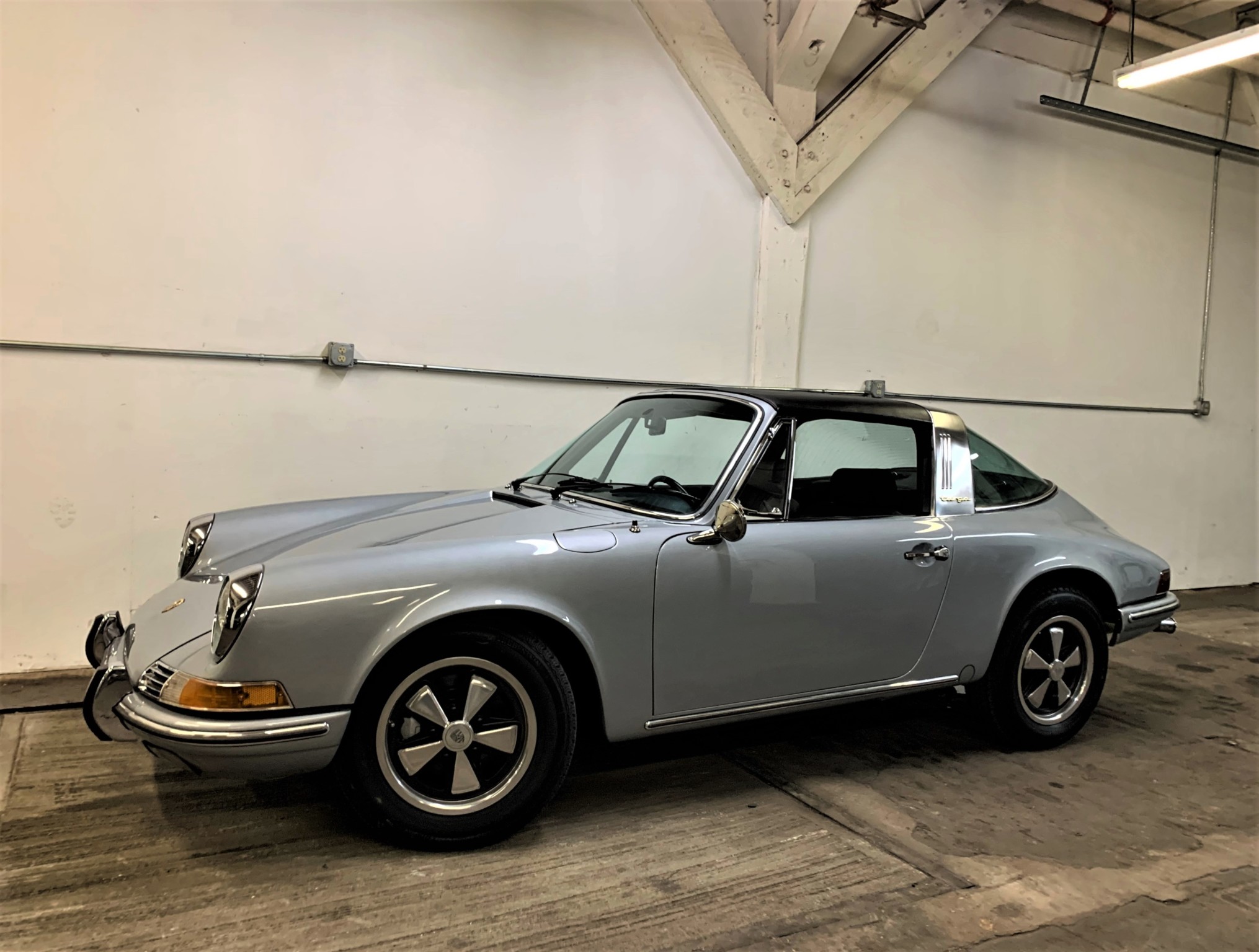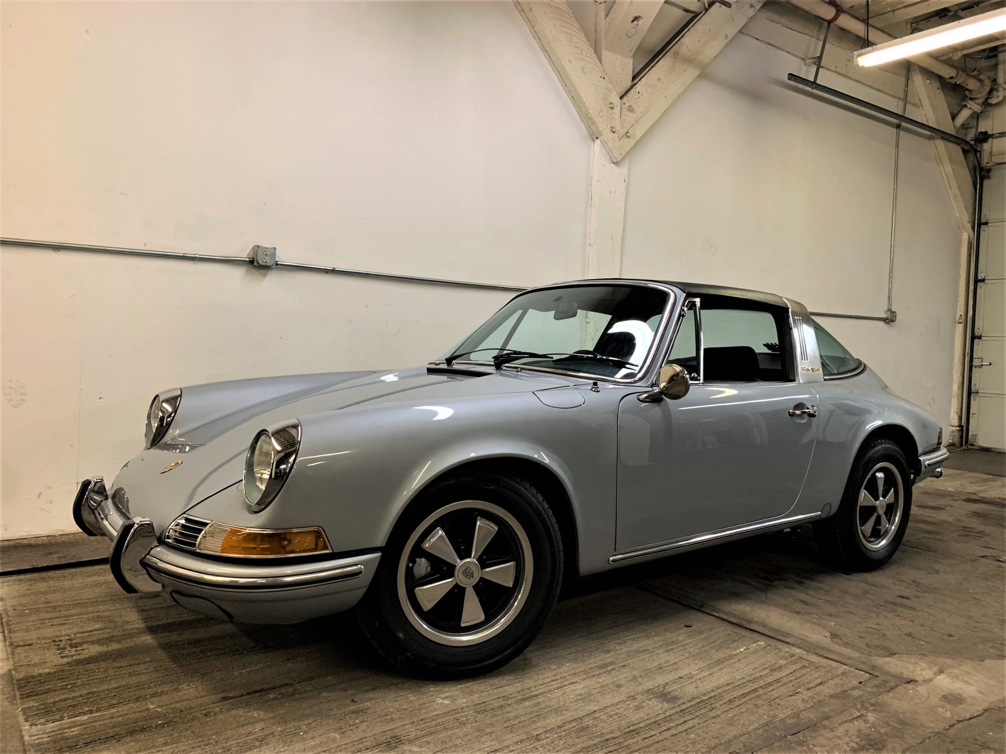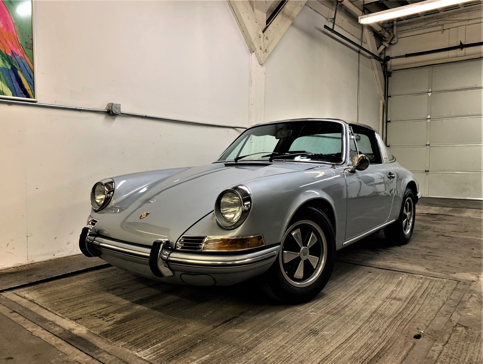 The 15″ Fuchs alloy wheels wear 185/70 Vredestein Sprint Classic tires , including the trunk-mounted spare shown in the gallery. The car is equipped with chrome lower rocker trim, a polished Targa bar, and silver Porsche lettering on the engine lid.