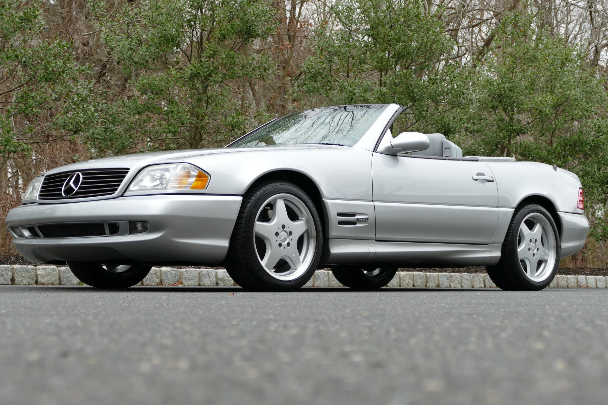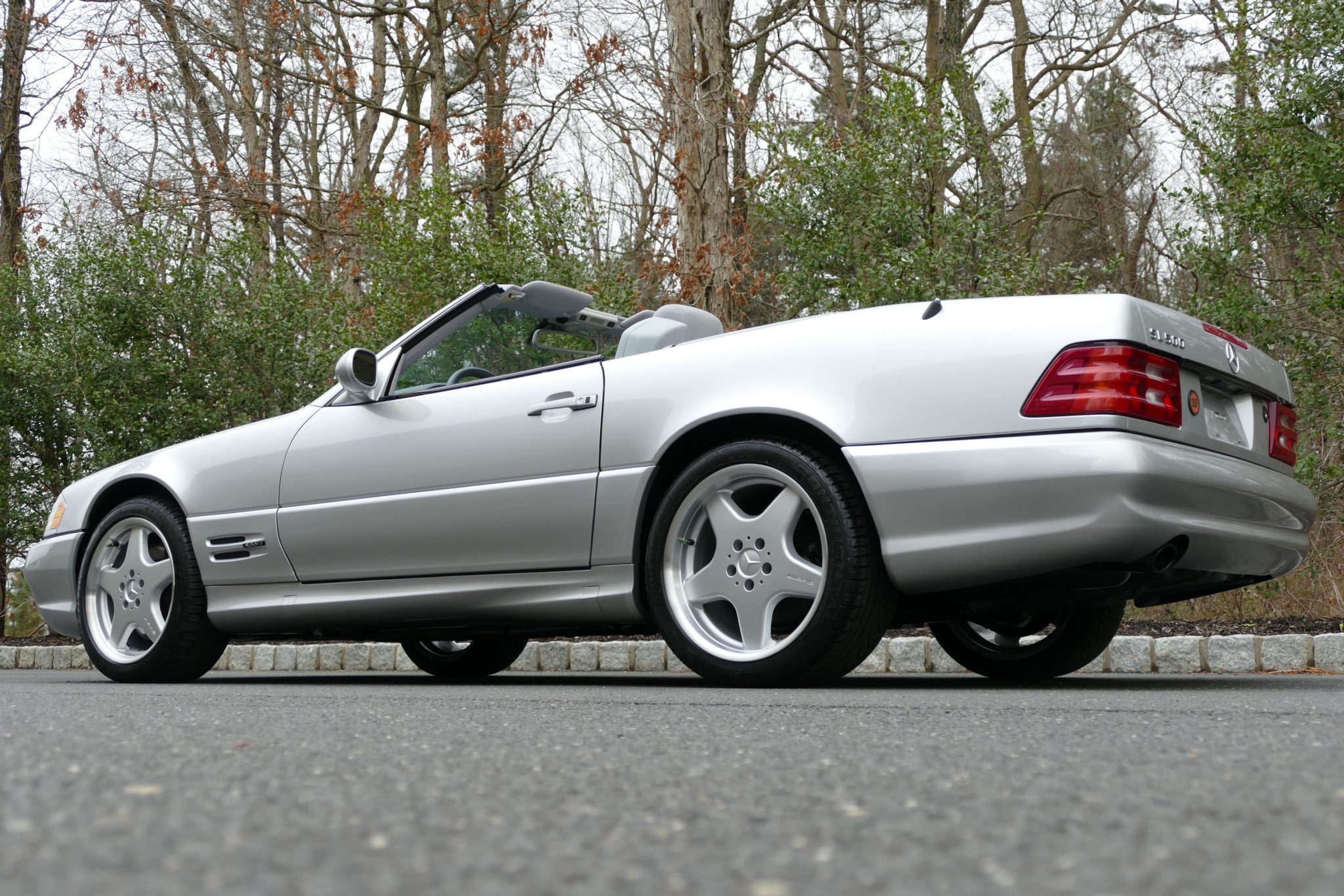 Factory 18″ five-spoke Monoblock wheels have been refinished according to the seller and wear a set of Continental tires. The gray soft top is shown above and features new hydraulics fitted by Top Hydraulics in preparation for the sale.