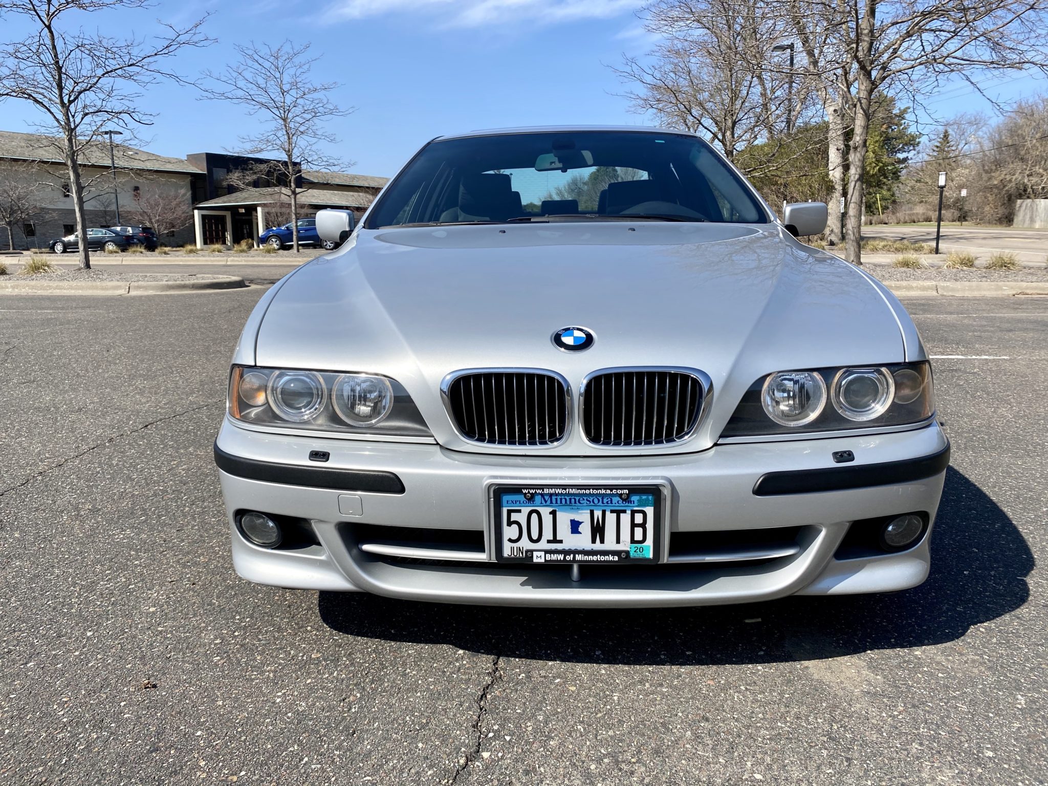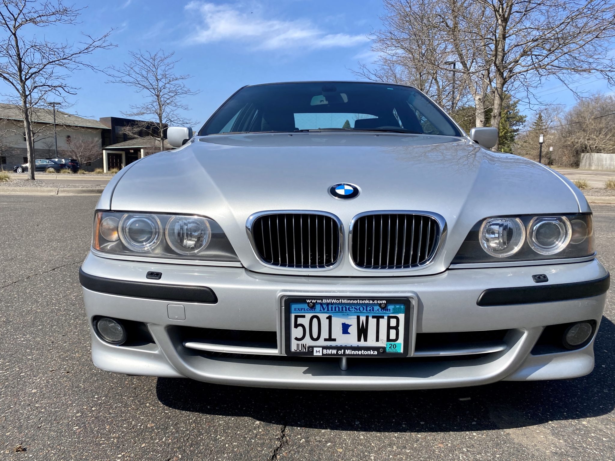 The M Sport package added a sport-tuned suspension, and this example has been fitted with staggered-width Style 65 wheels from an E39 M5. Hankook Ventus V12 tires show date codes from 2018 and 2019, and a full-size spare is located in the trunk.